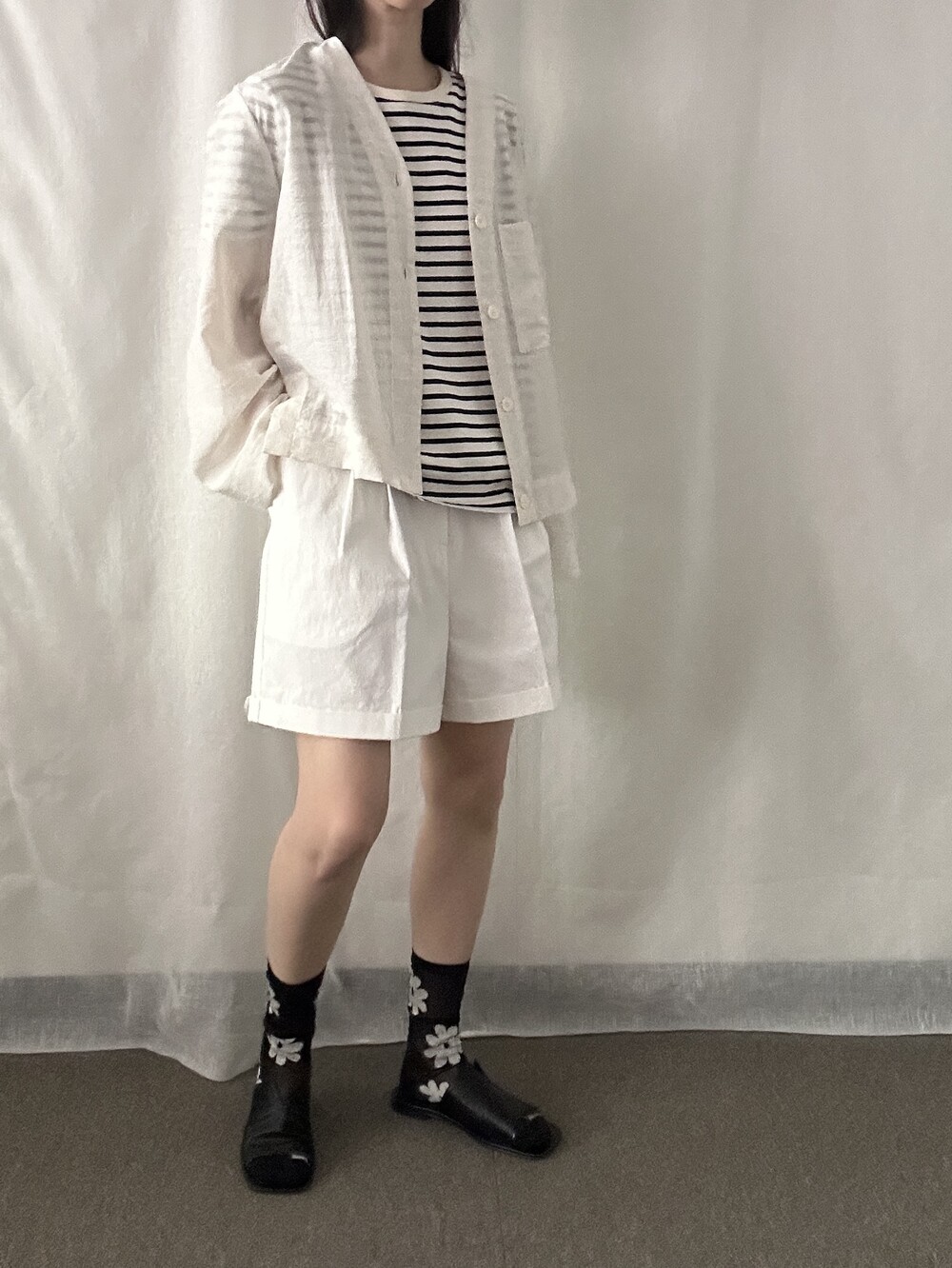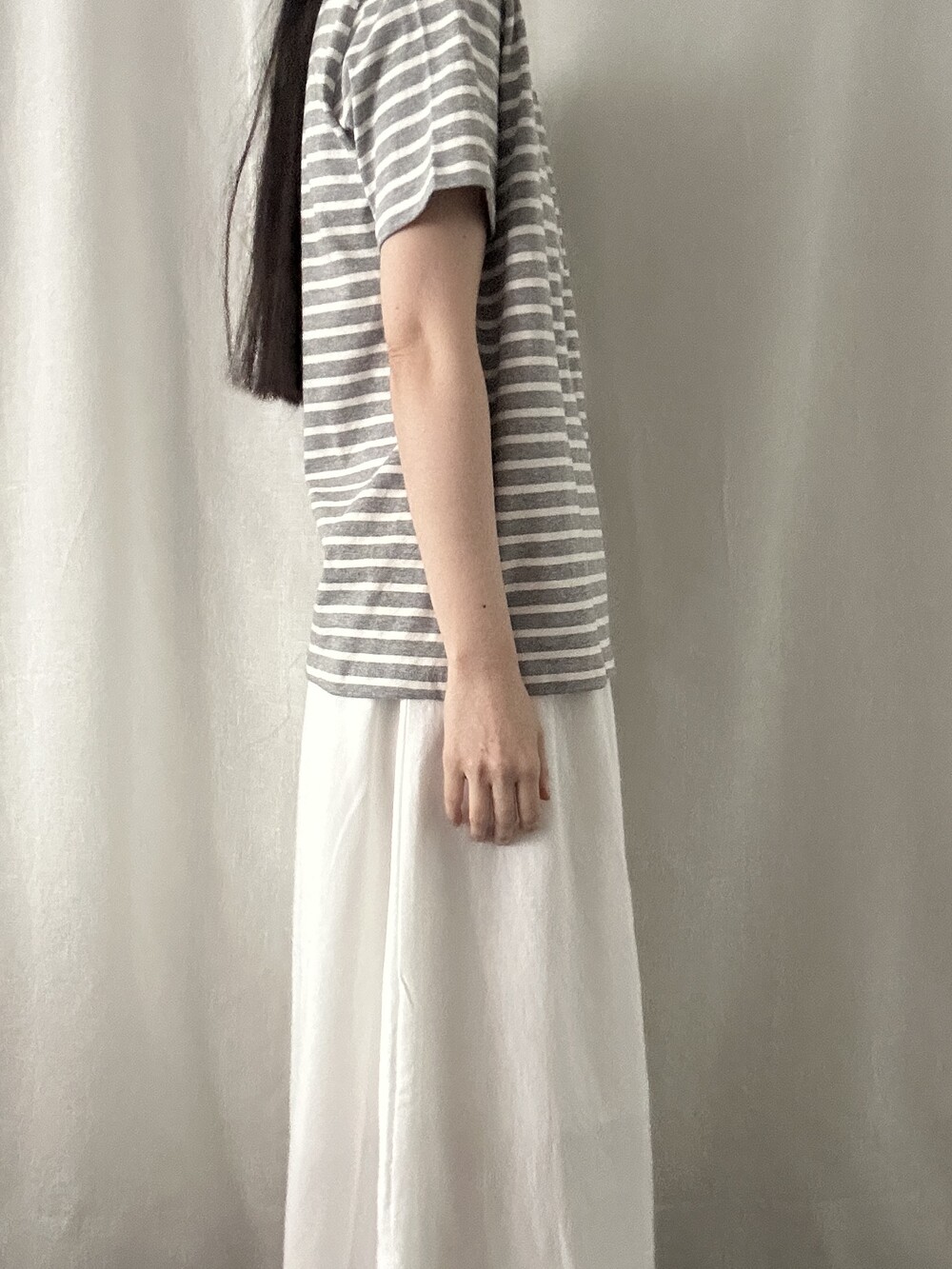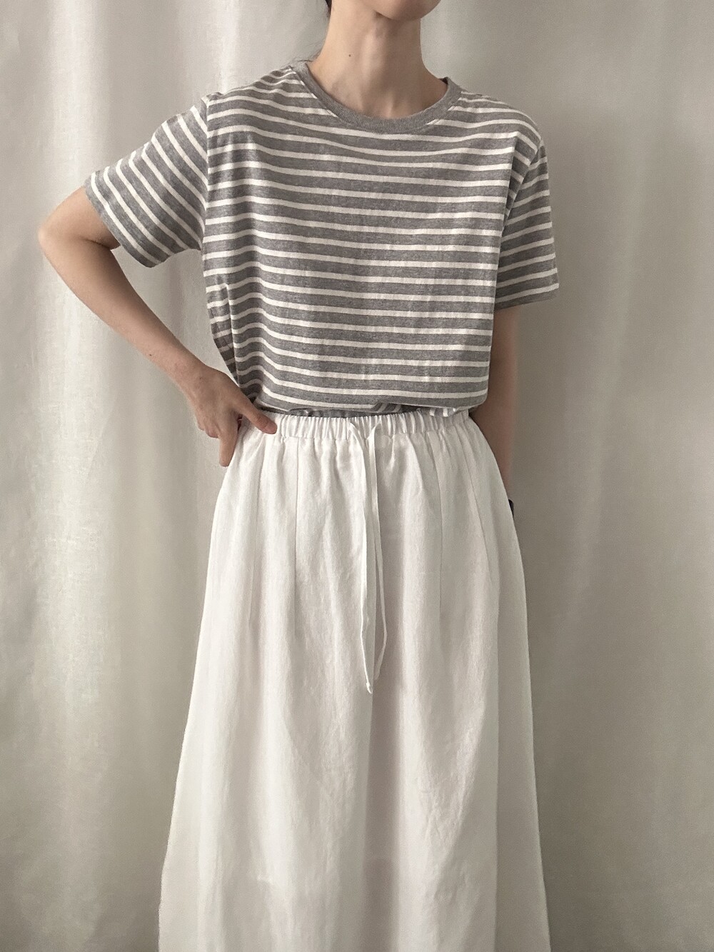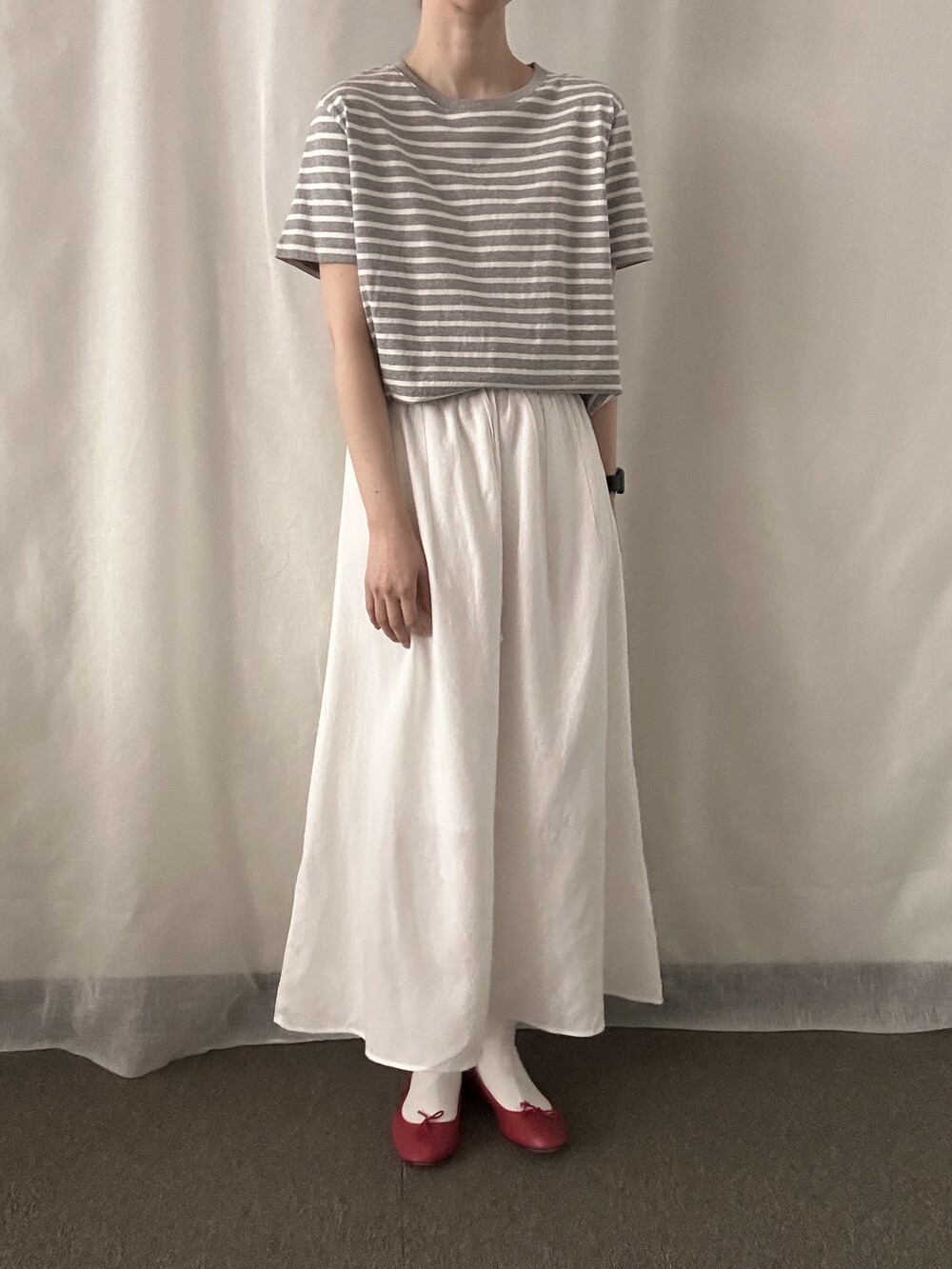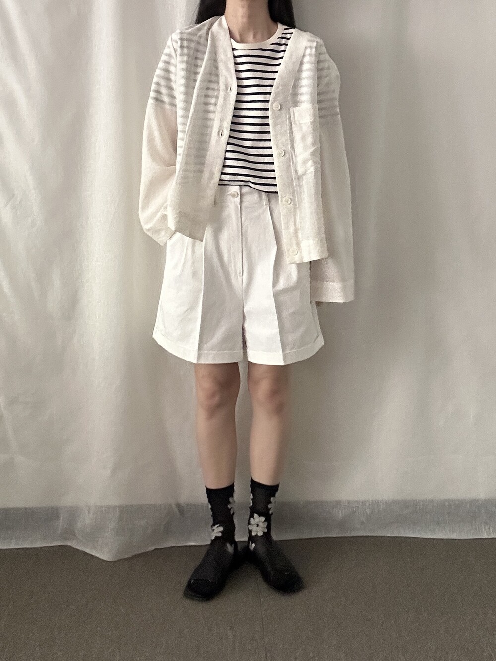 소매길이 , 총장 모두 짧지 않아 부담 없이 입기 좋으며 시간이 지나도 촌스럽지 않은 스트라이프 패턴으로 하나쯤 있으면 여름 내내 든든합니다.