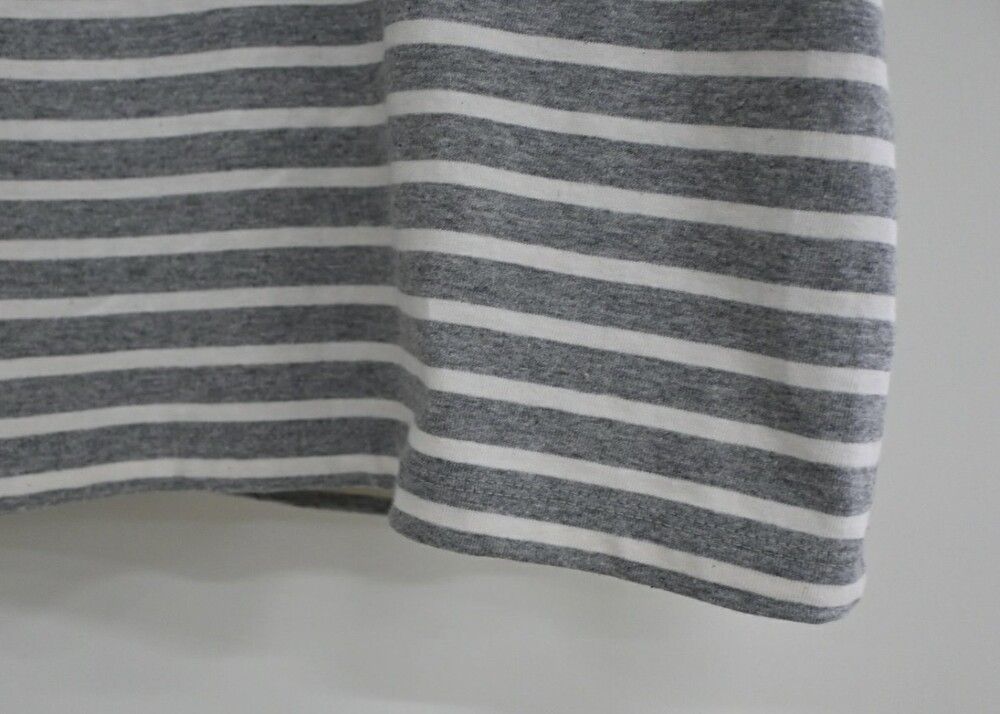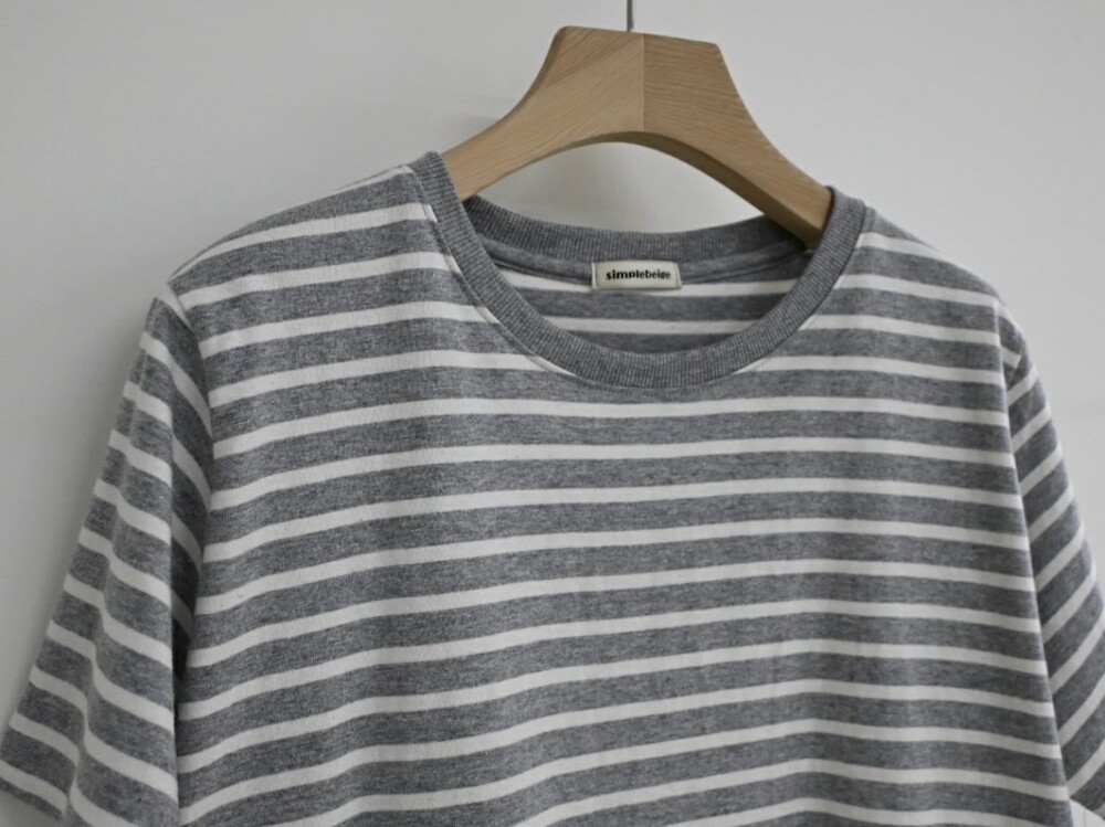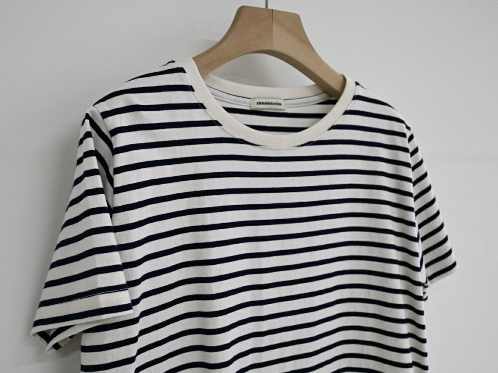 언제나 입기 좋은 스트라이프 패턴에 넥은 시보리로 처리해 튼튼하고 깔끔합니다.