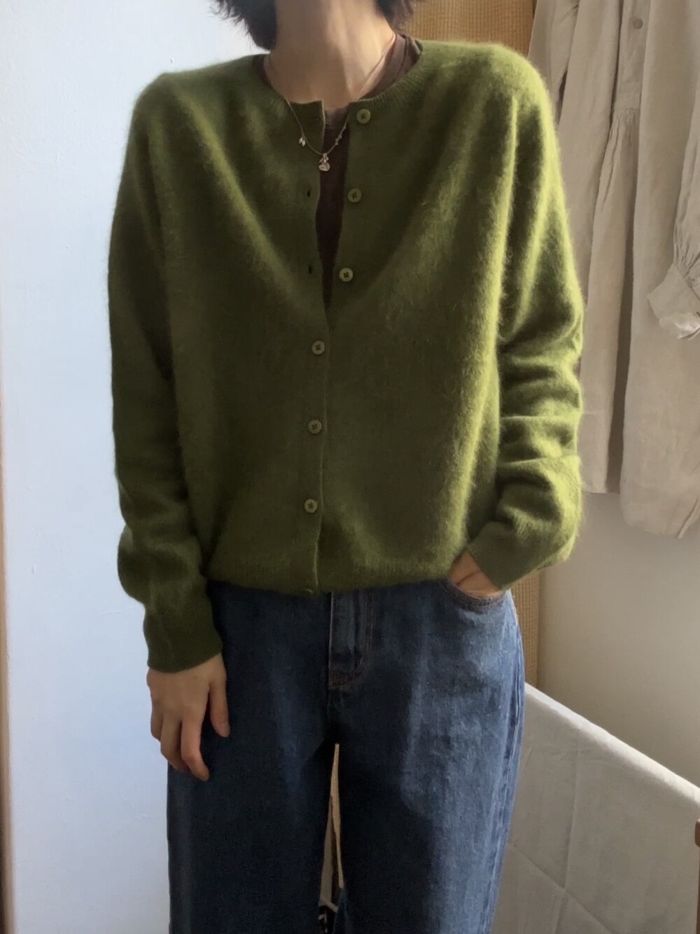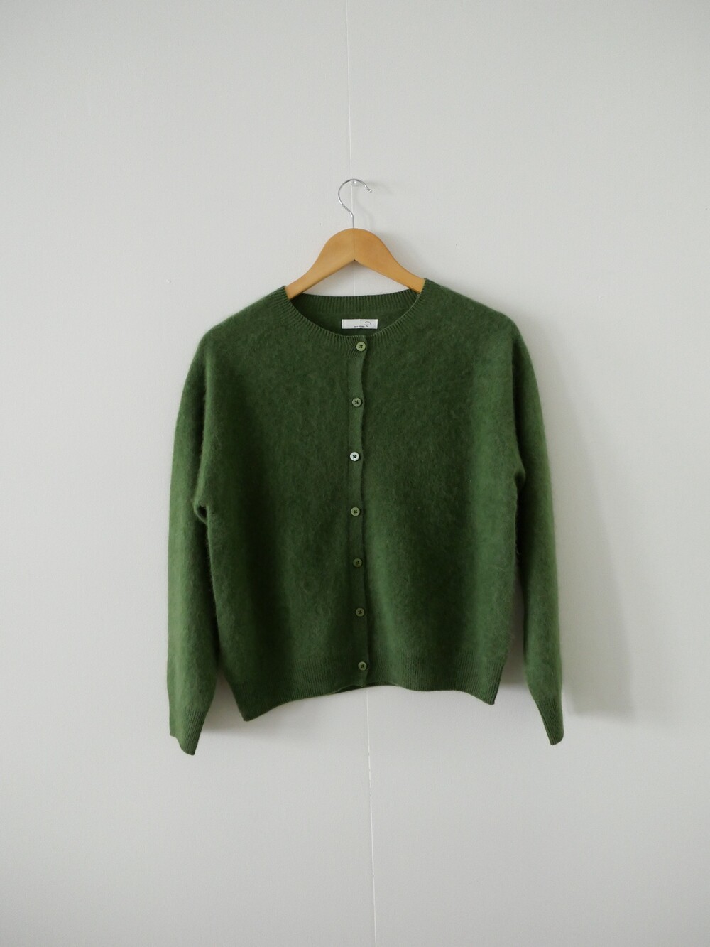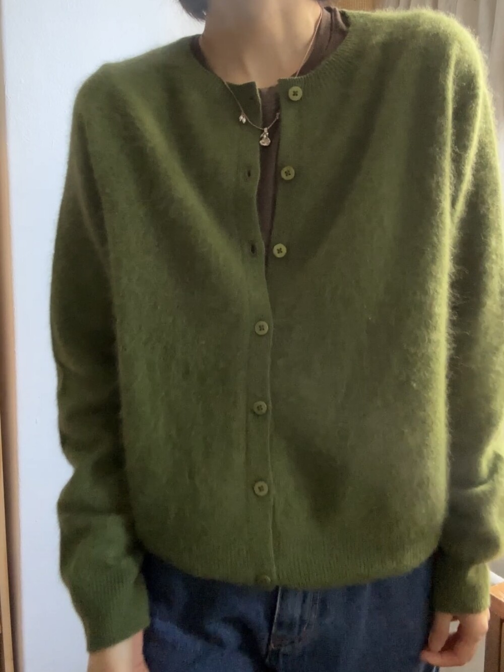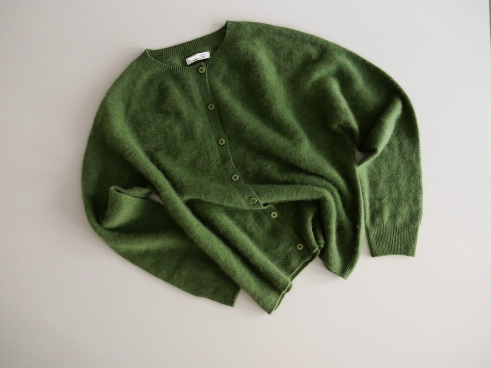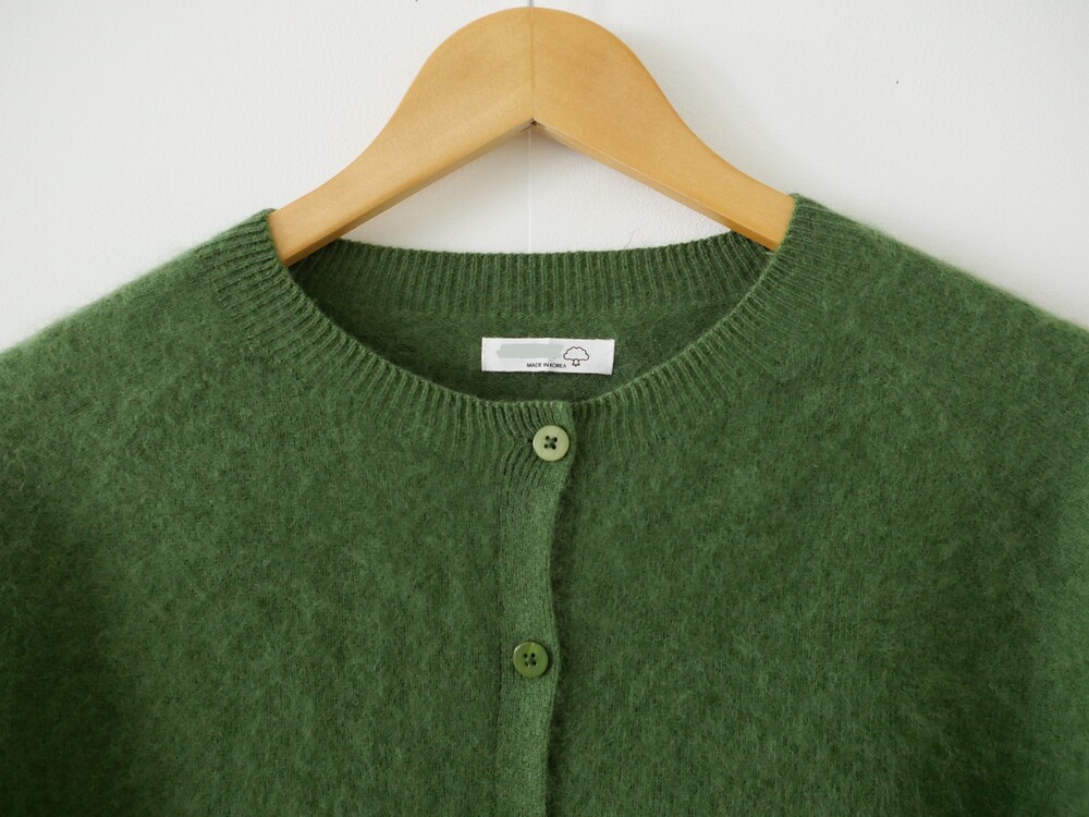 포근한 헤어감이 돋보이는 울 가디건이에요.