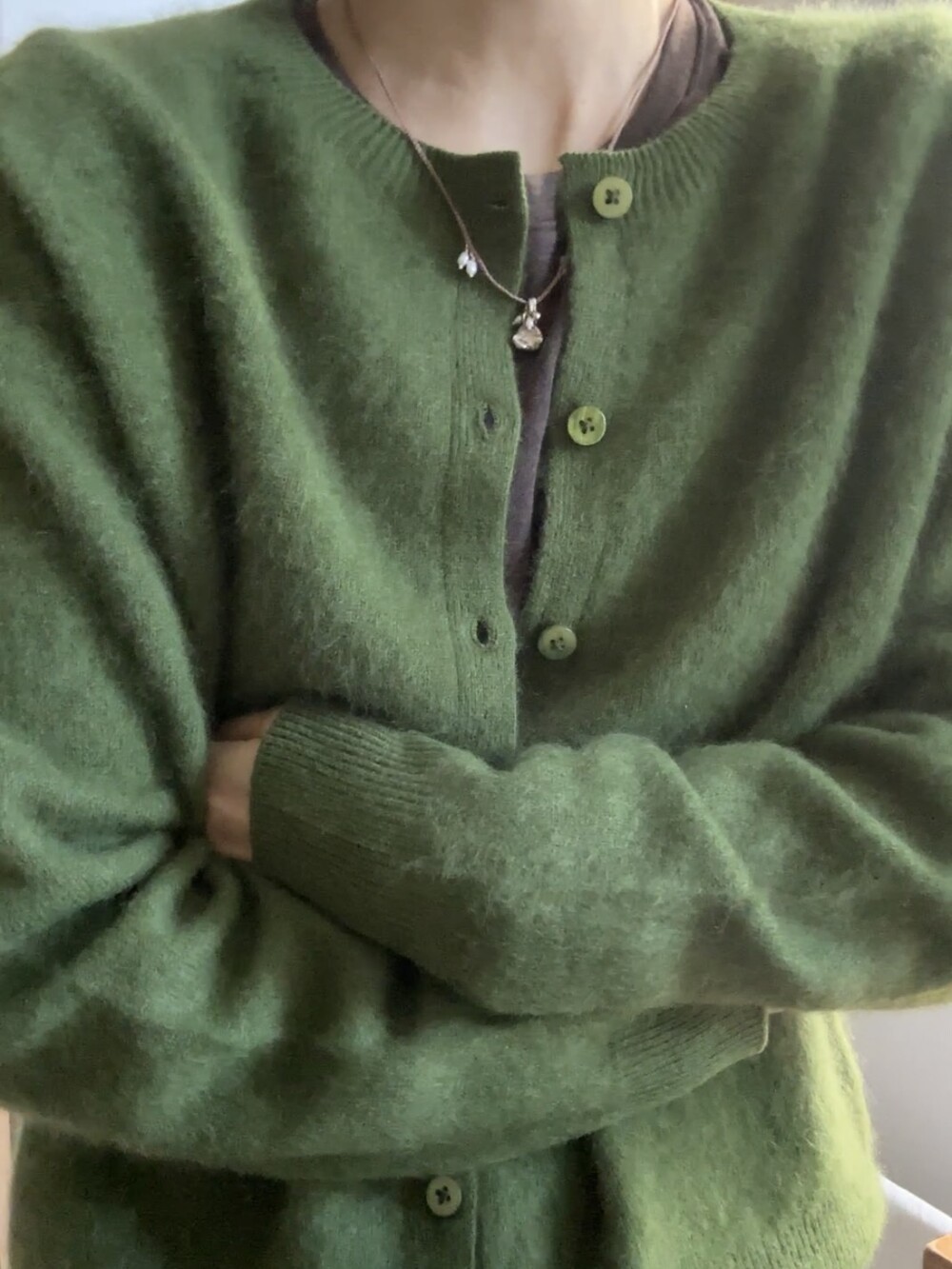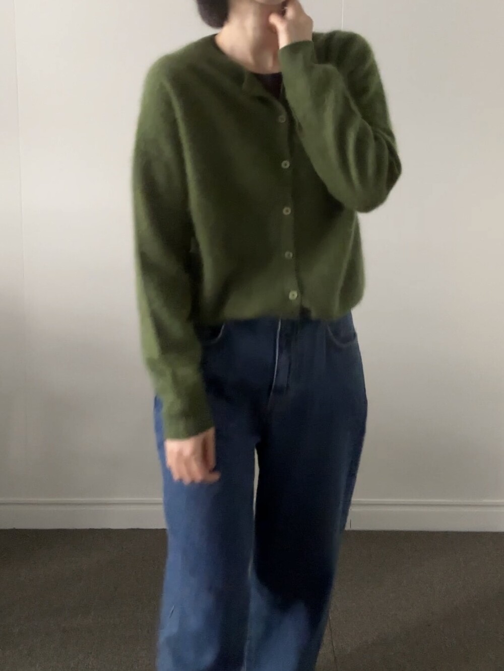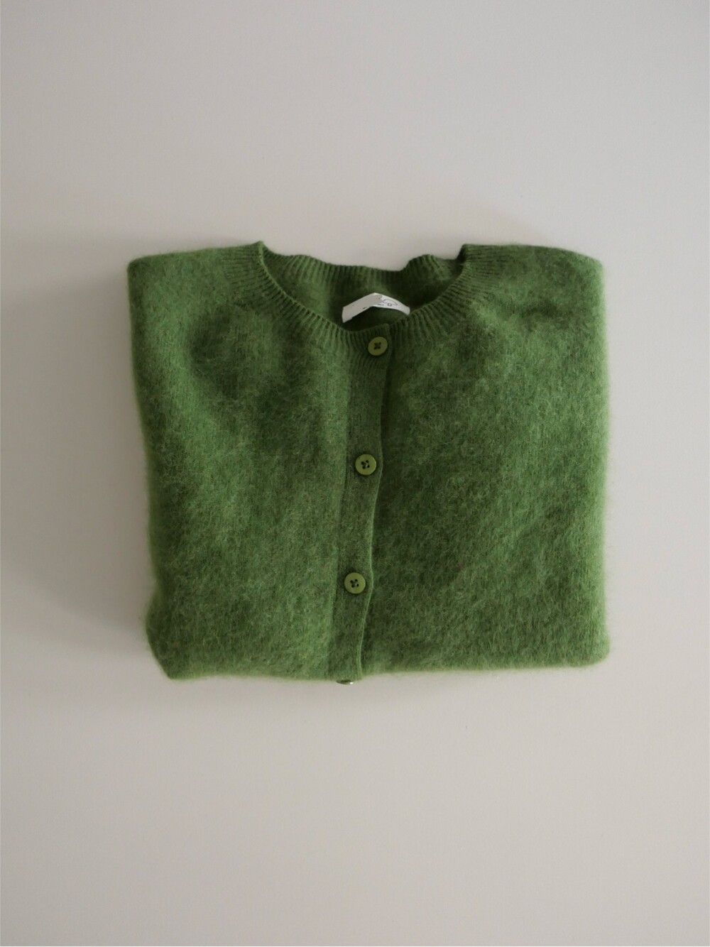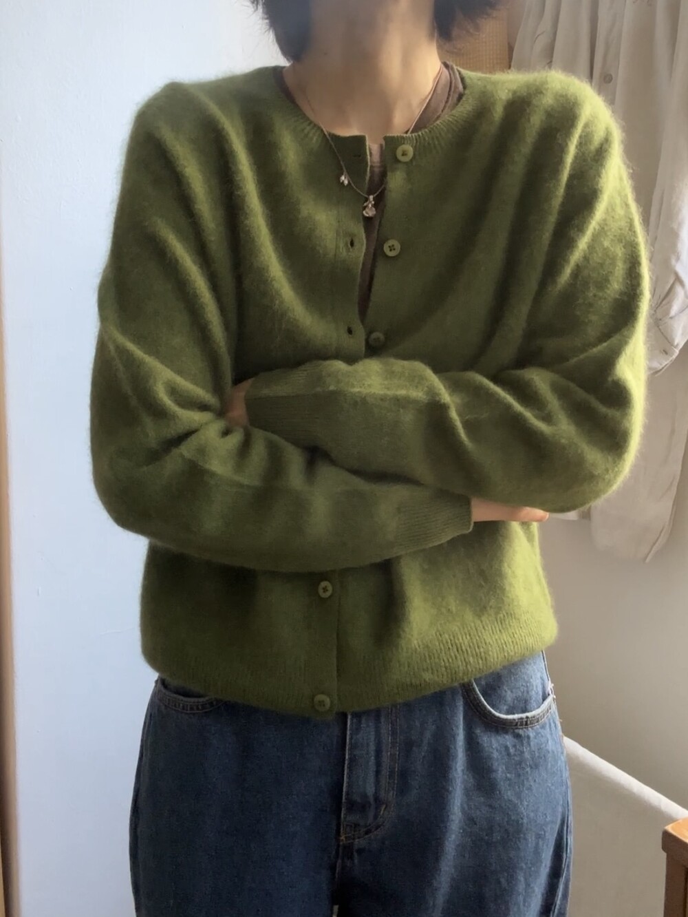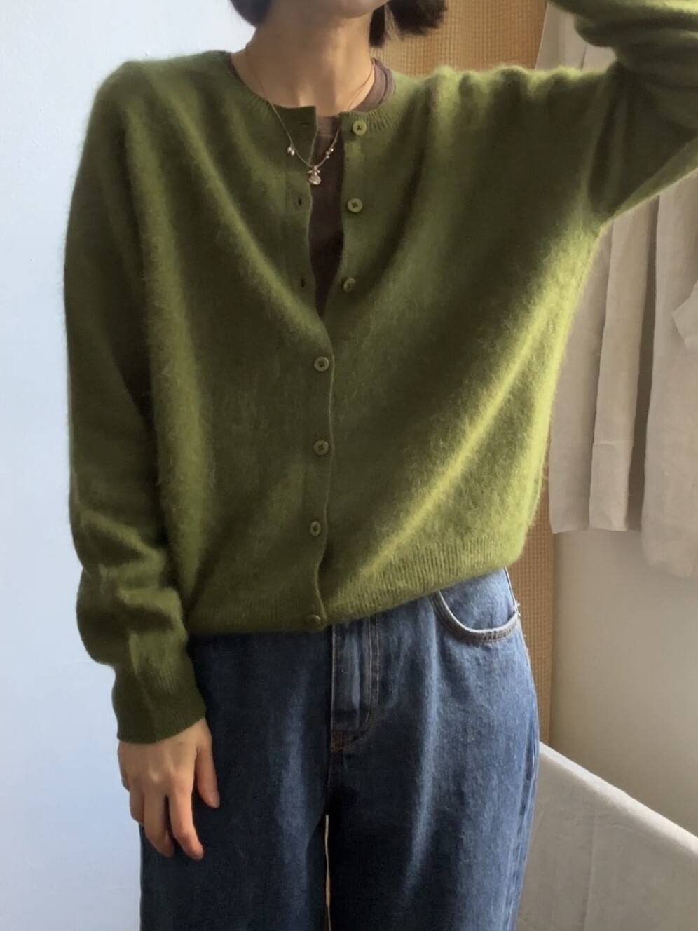 포근한 헤어감이 돋보이는 울 가디건이에요.