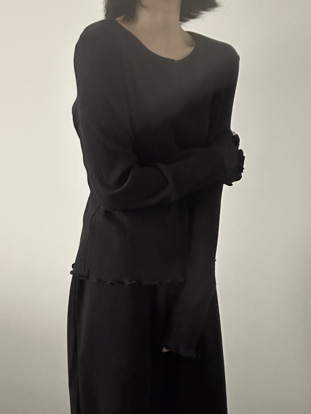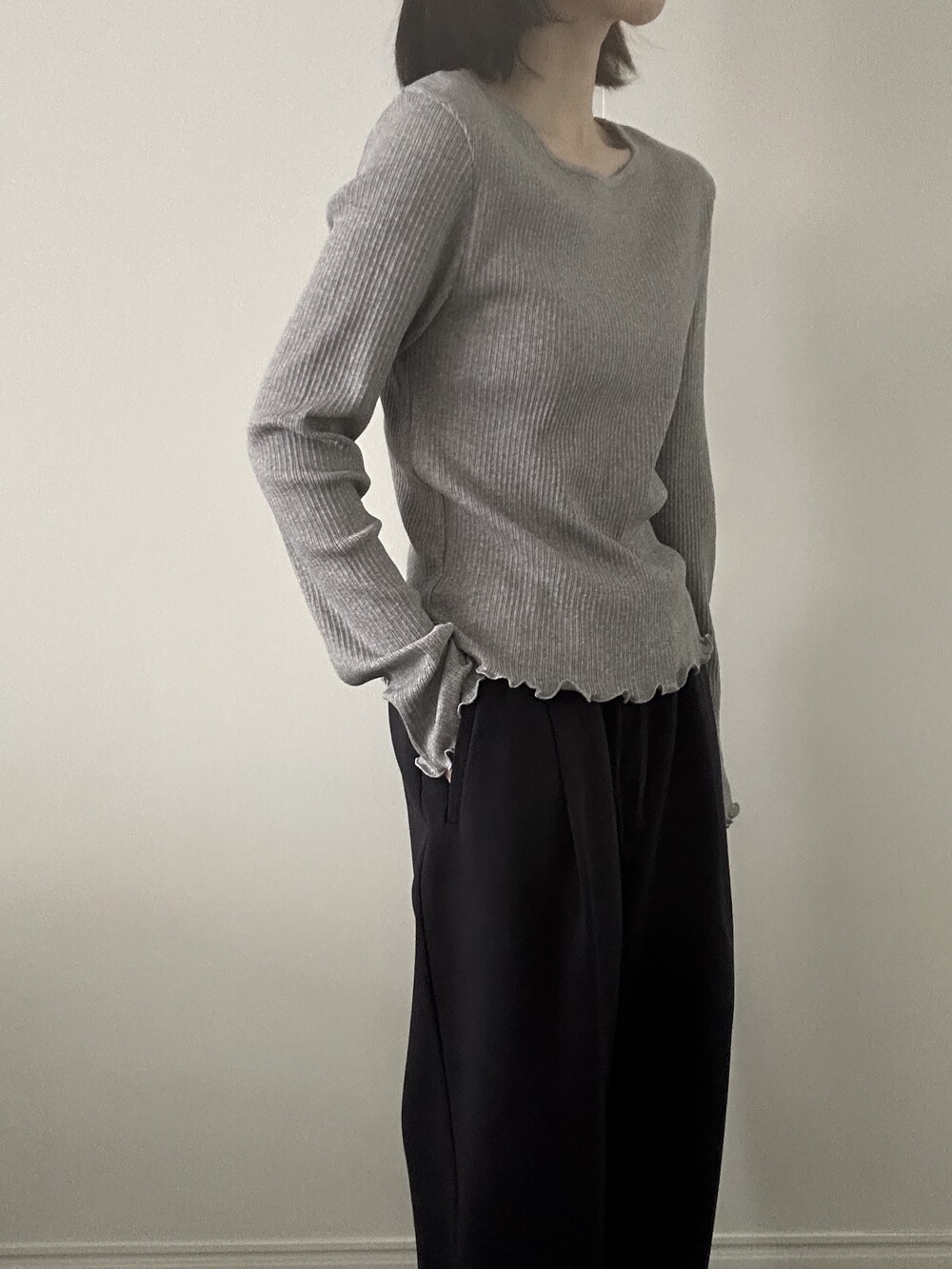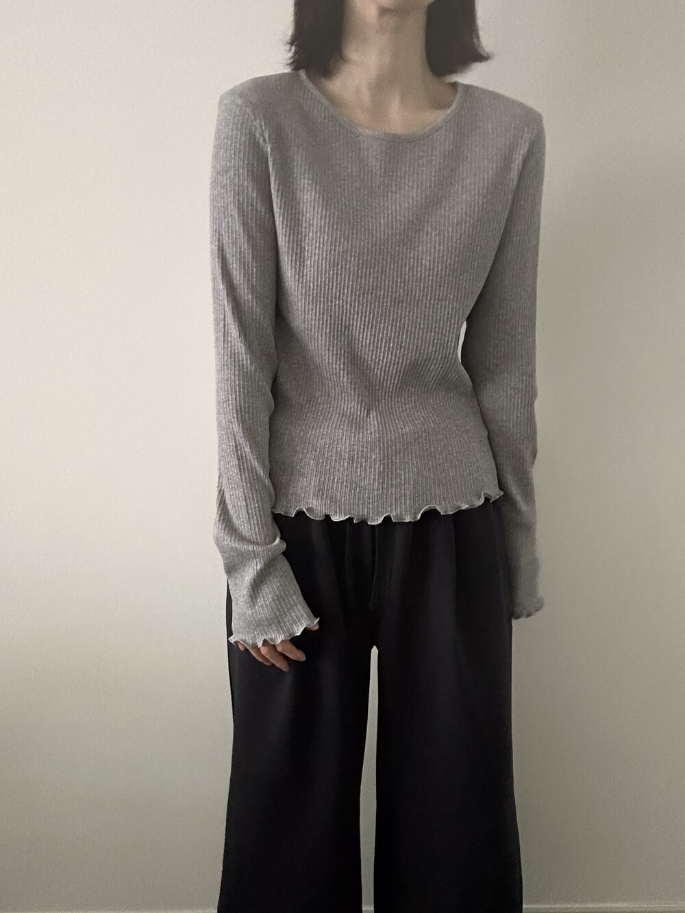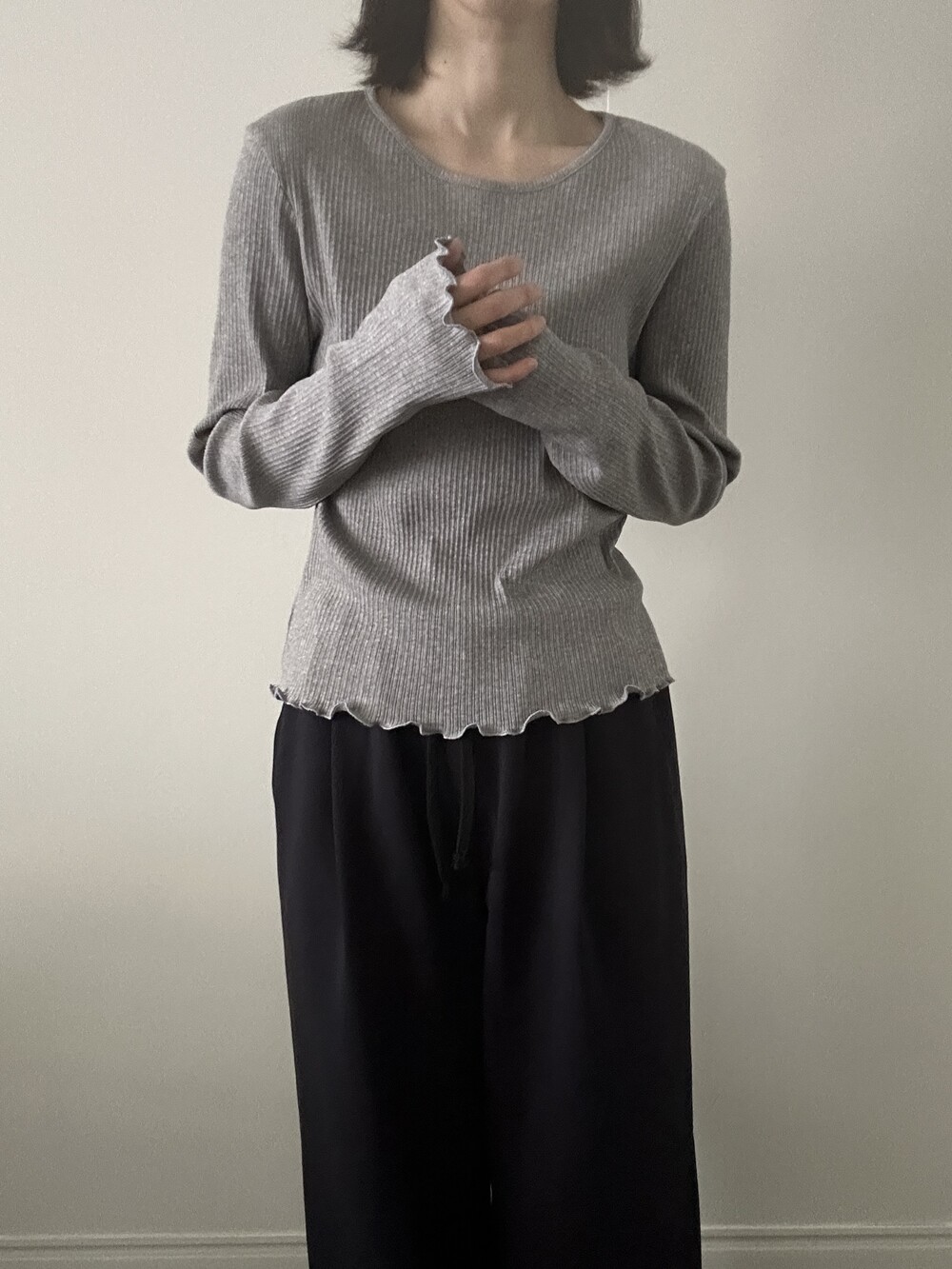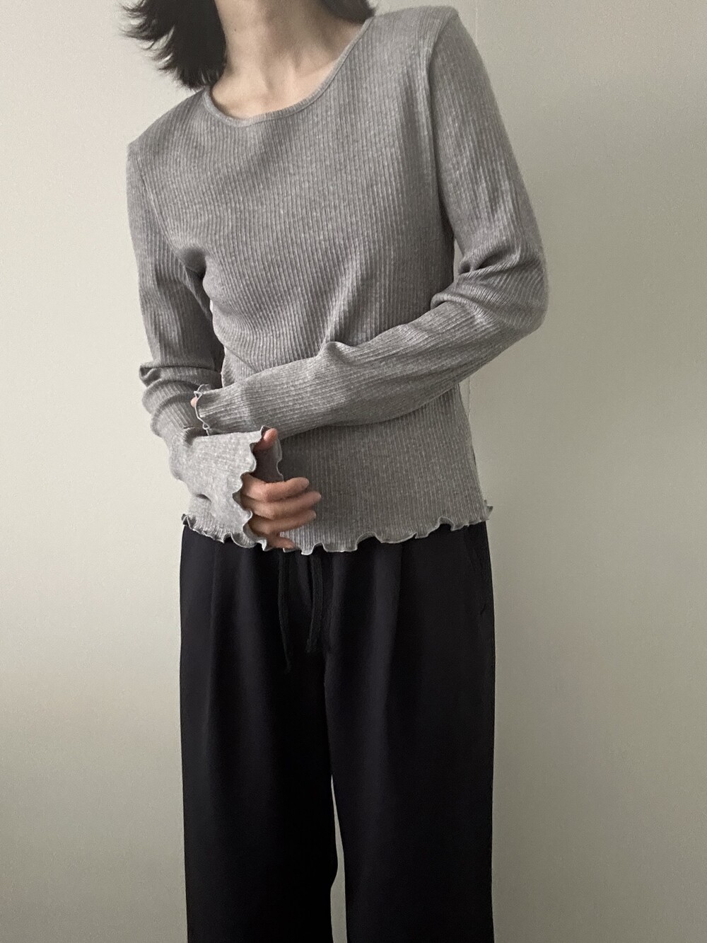 밑단과 소매단은 자연스럽게 흐르는 물결 마감으로 마무리해 심플한 디자인에 작은 포인트를 더했습니다.