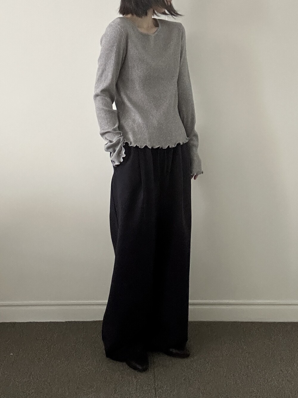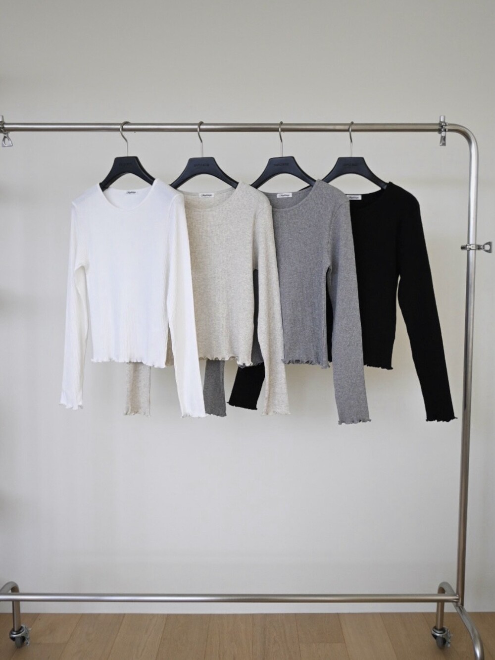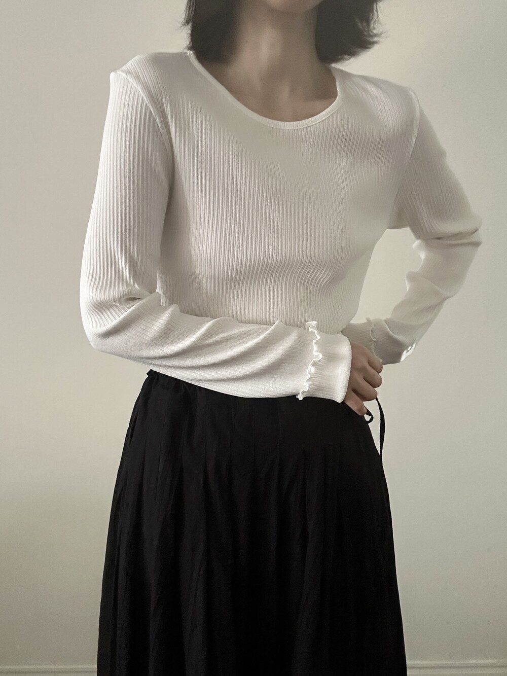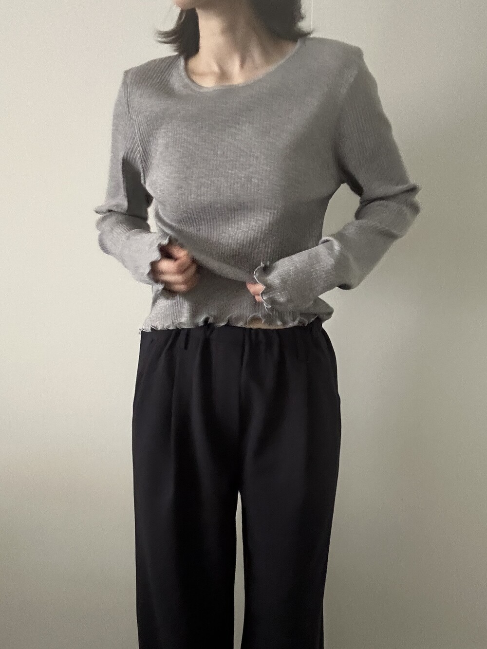 밑단과 소매단은 자연스럽게 흐르는 물결 마감으로 마무리해 심플한 디자인에 작은 포인트를 더했습니다.