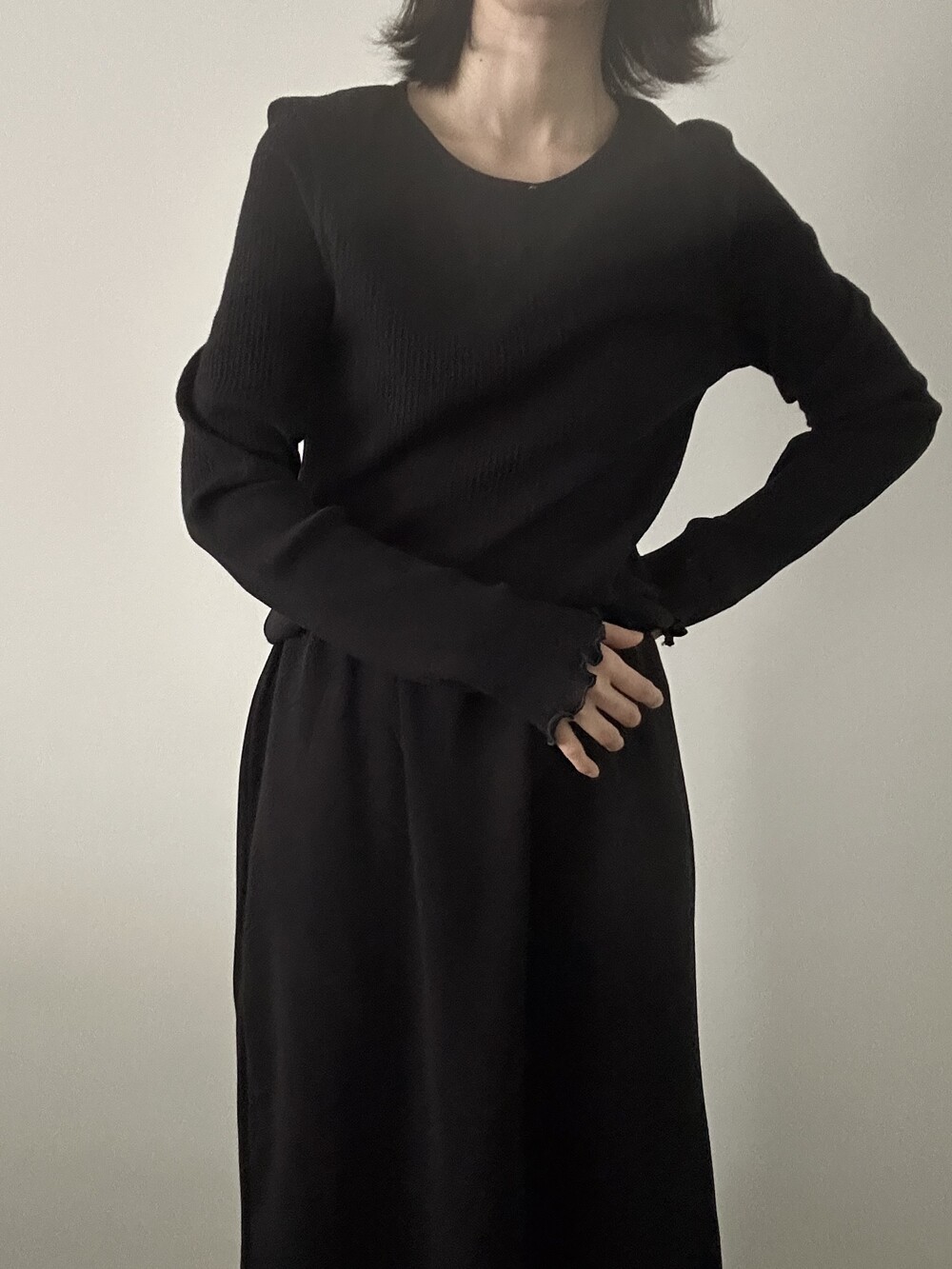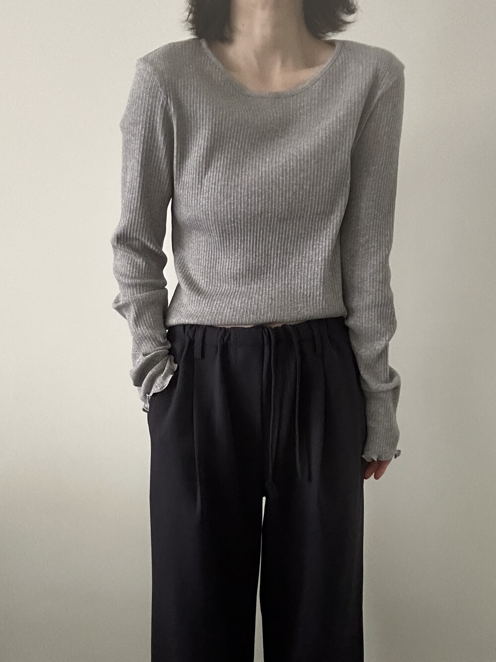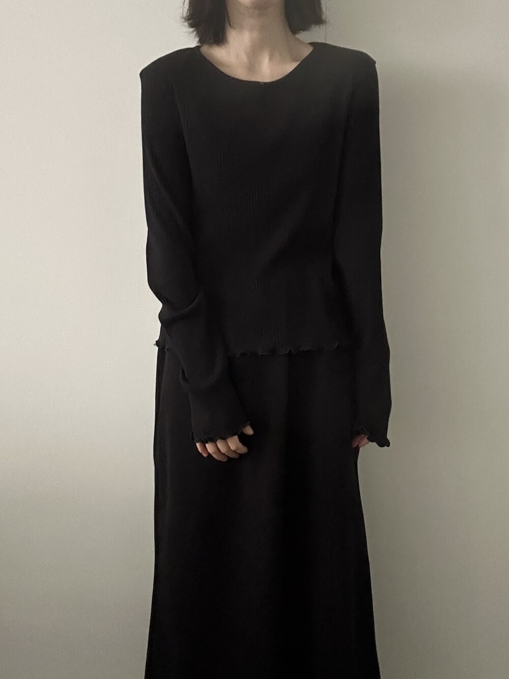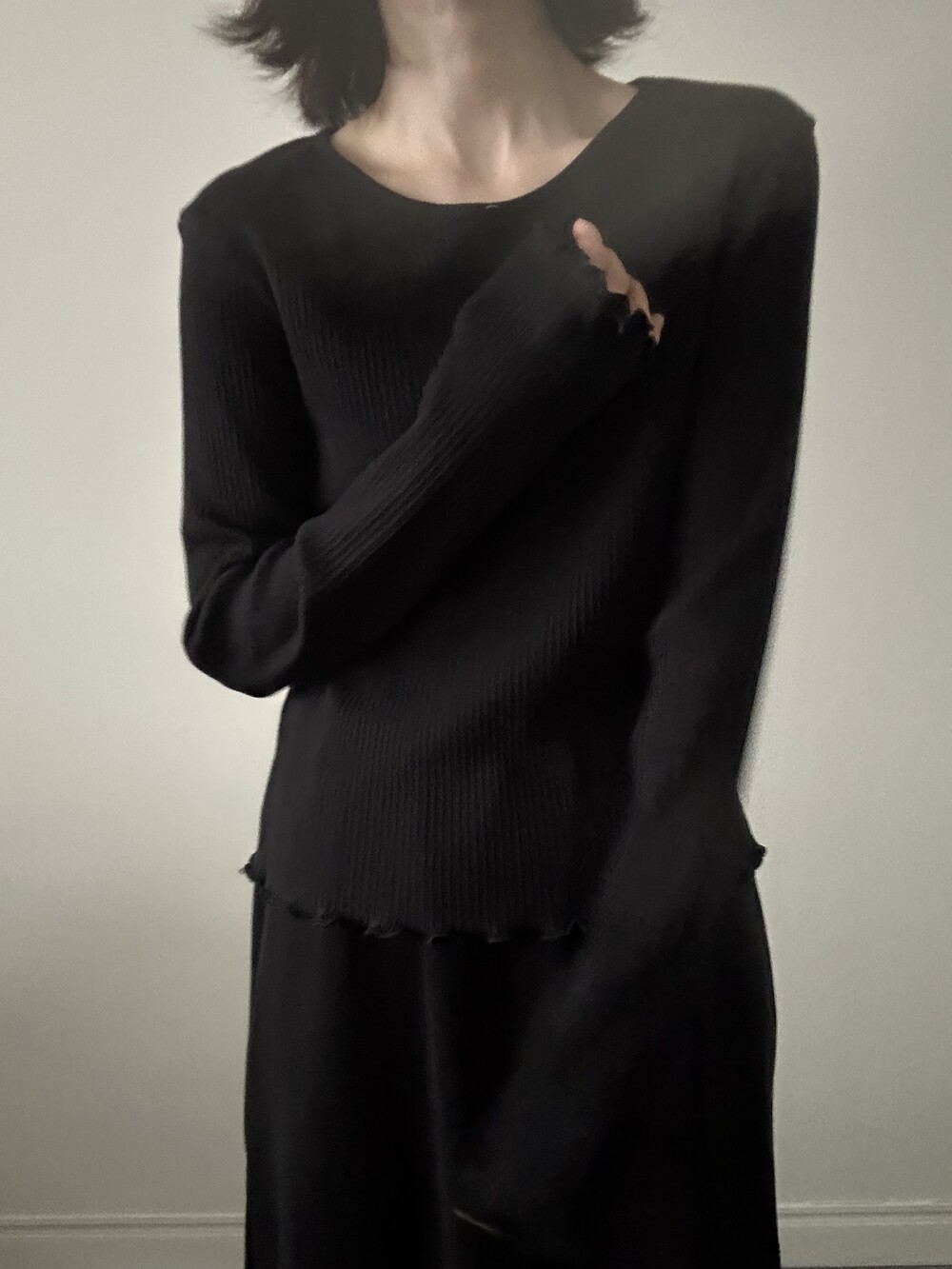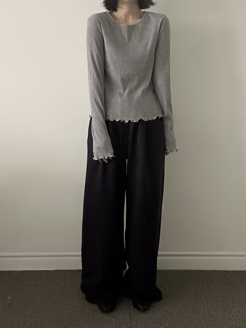 밑단과 소매단은 자연스럽게 흐르는 물결 마감으로 마무리해 심플한 디자인에 작은 포인트를 더했습니다.
