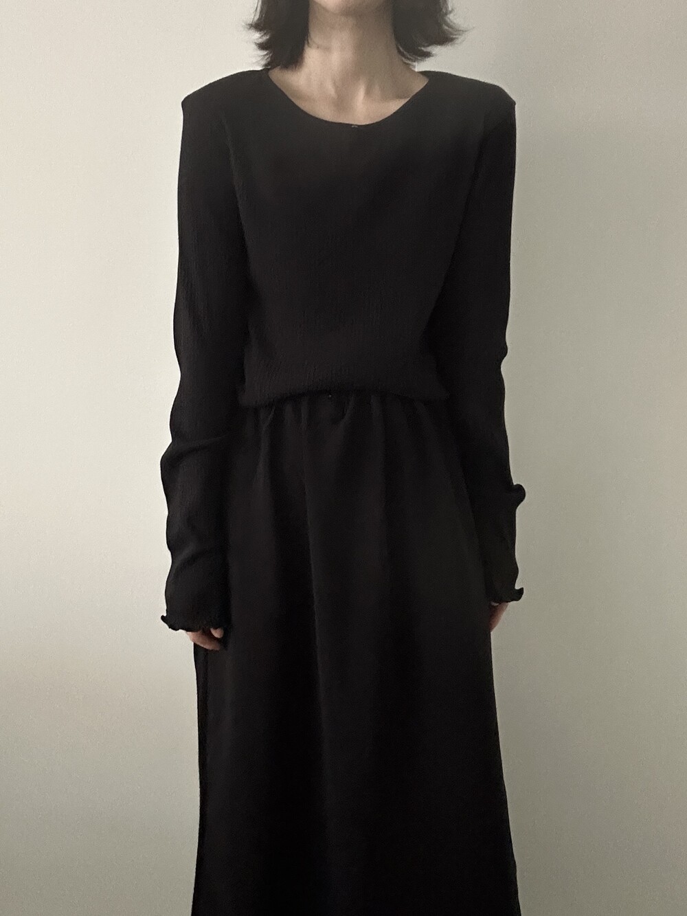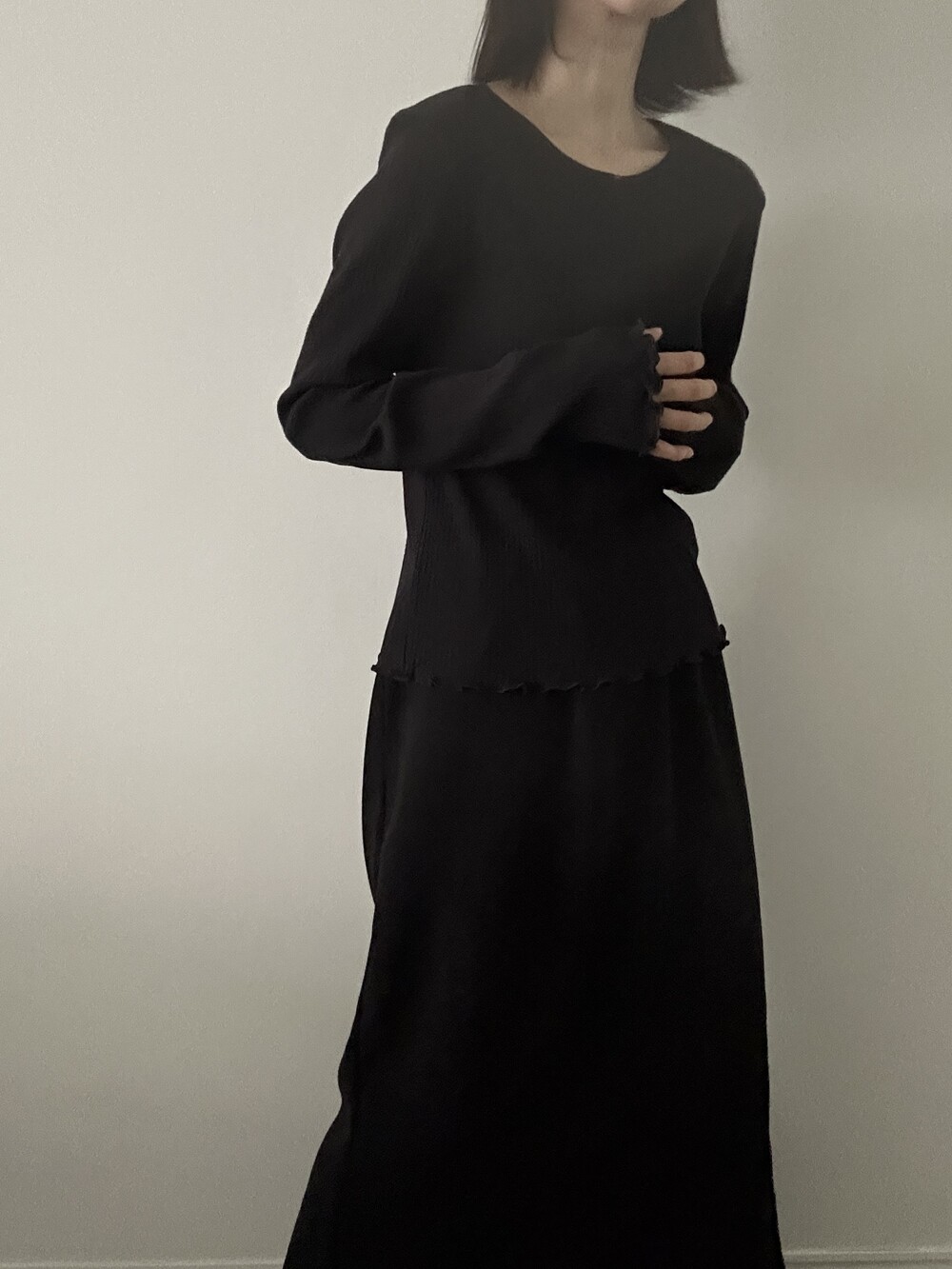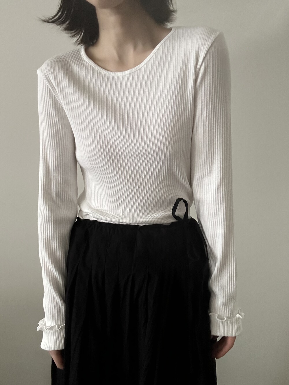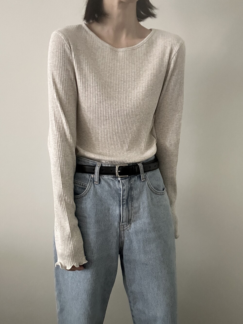 밑단과 소매단은 자연스럽게 흐르는 물결 마감으로 마무리해 심플한 디자인에 작은 포인트를 더했습니다.