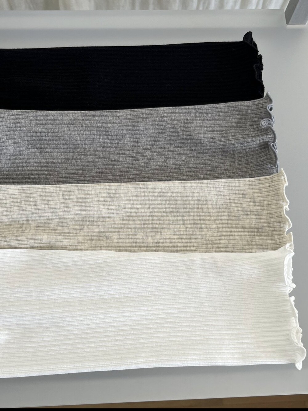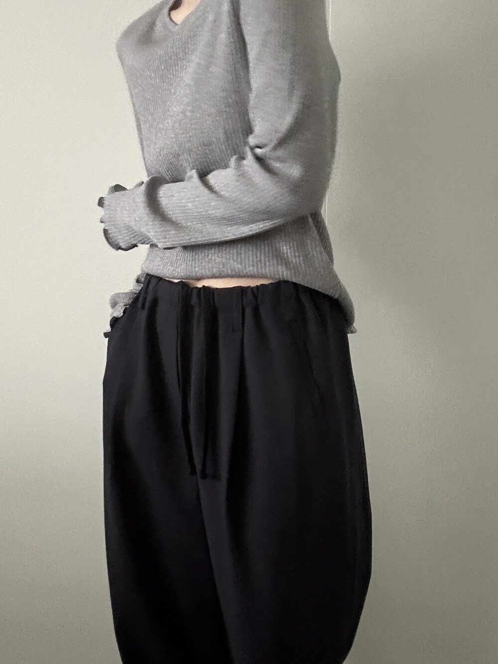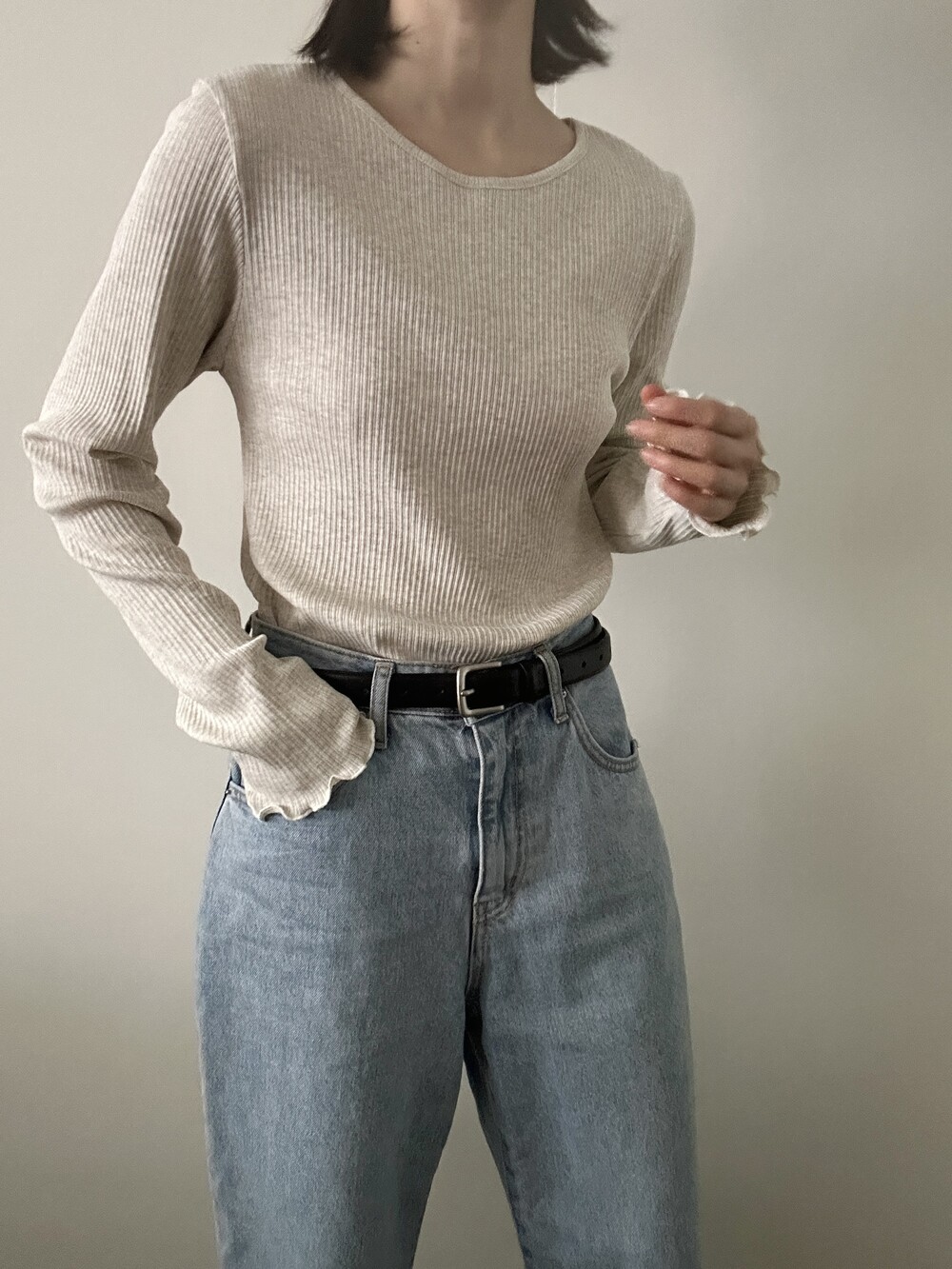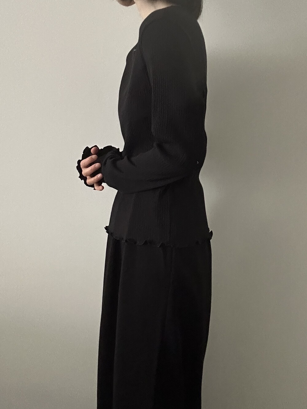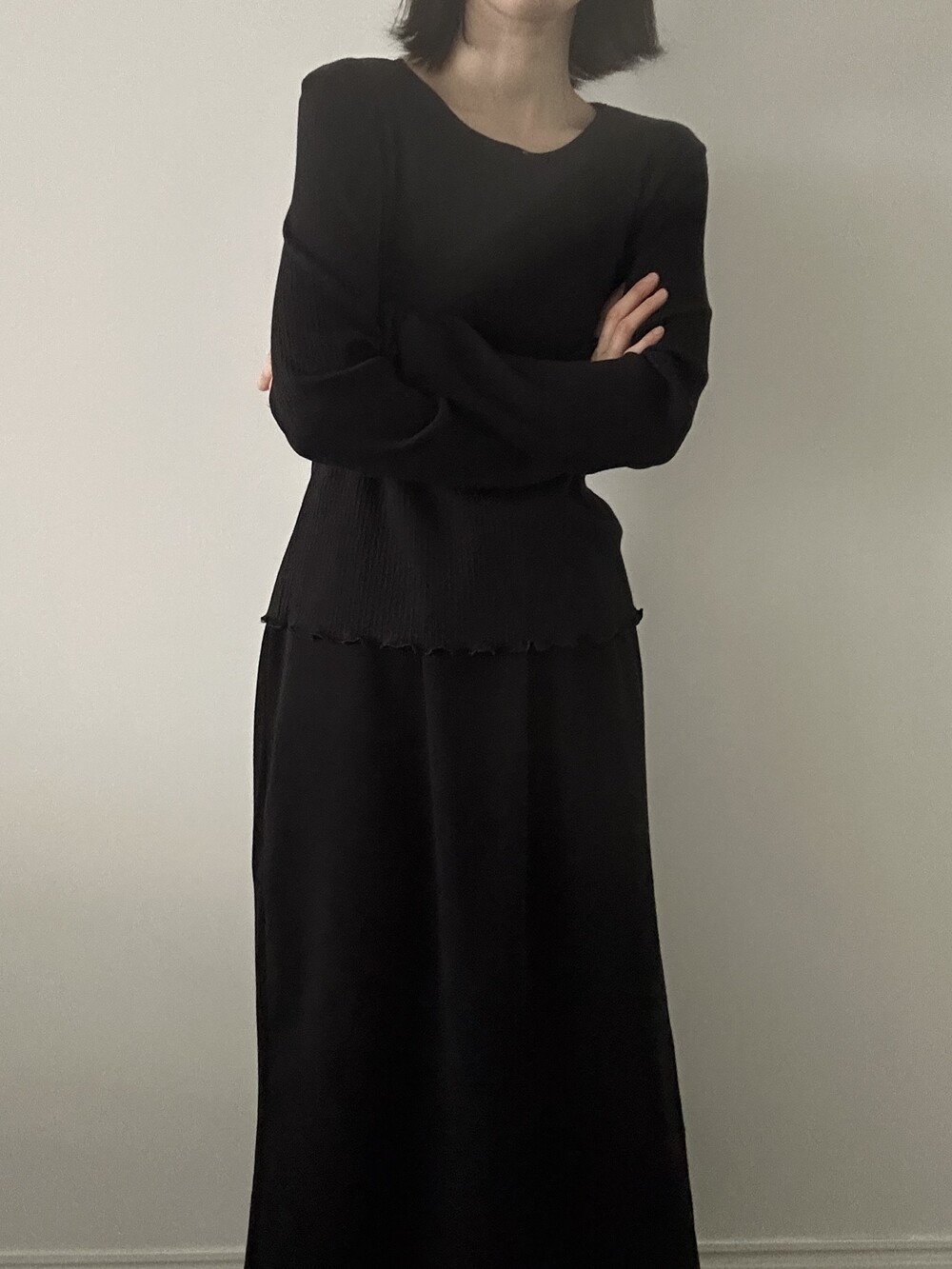 밑단과 소매단은 자연스럽게 흐르는 물결 마감으로 마무리해 심플한 디자인에 작은 포인트를 더했습니다.