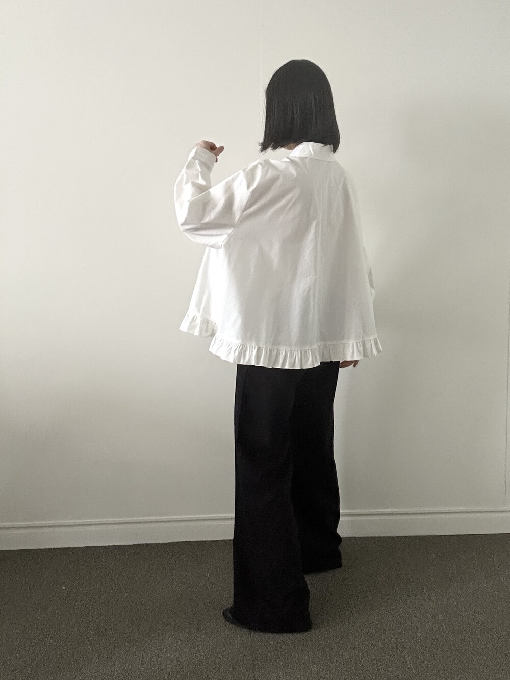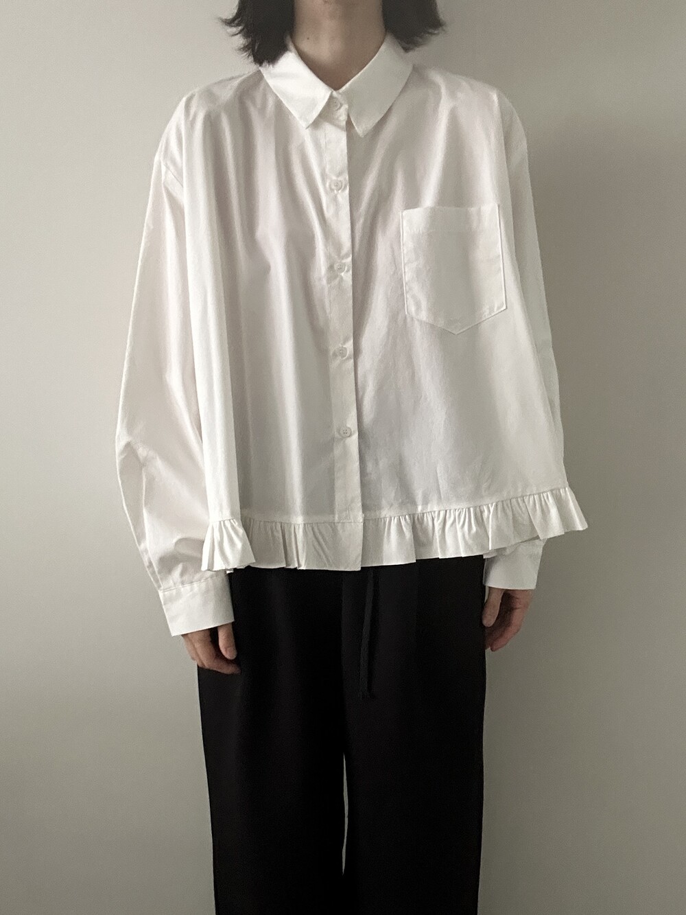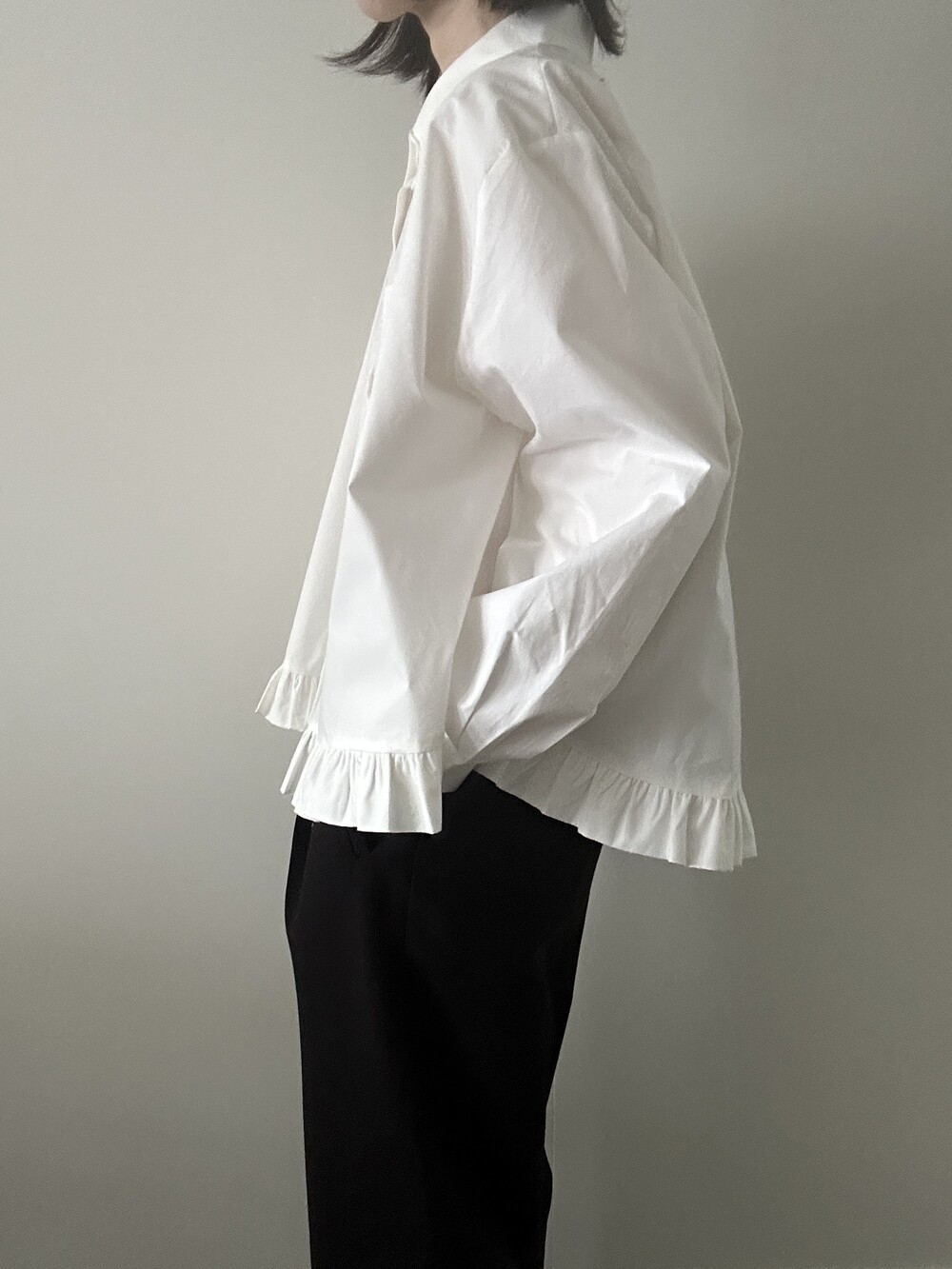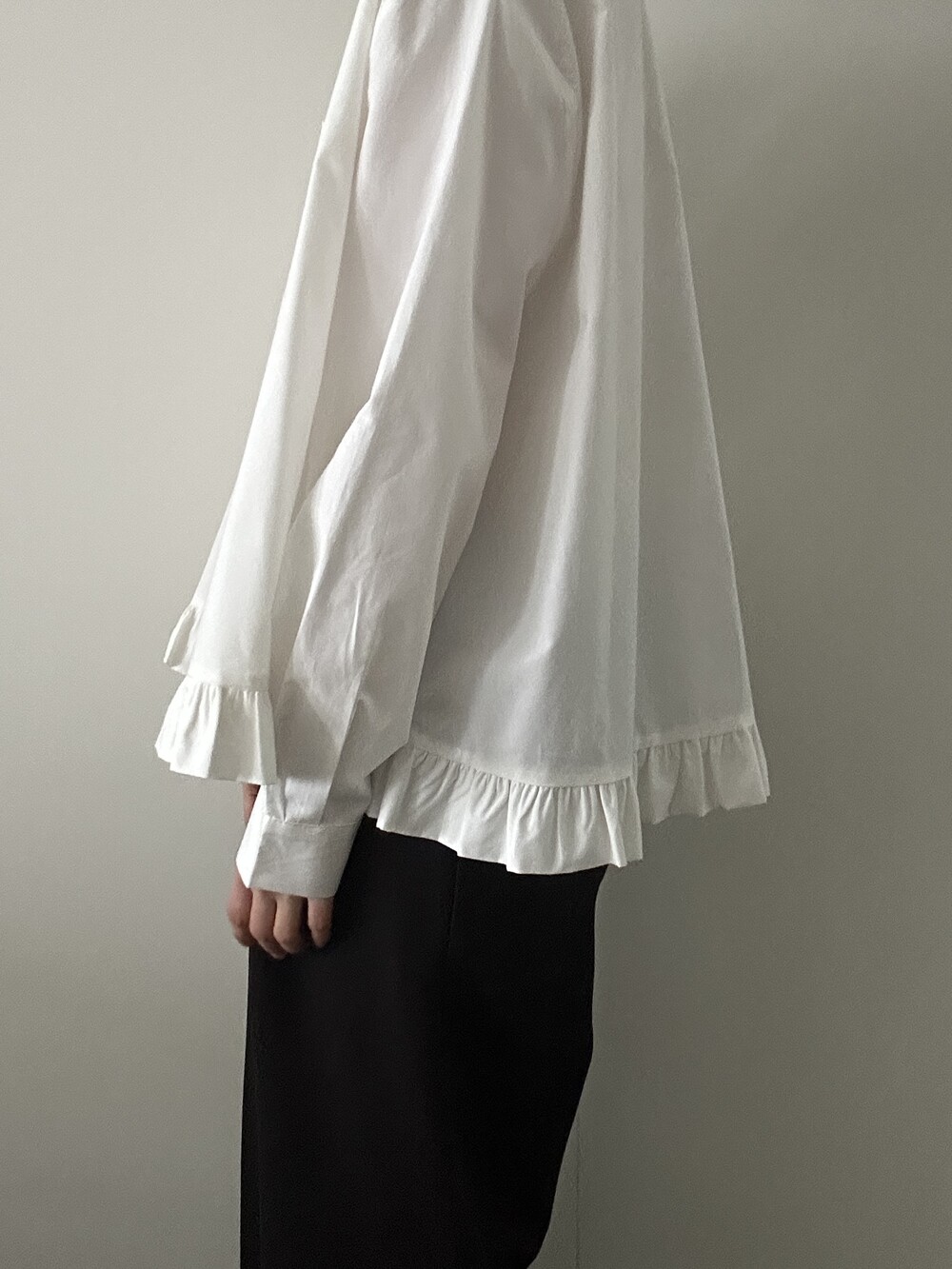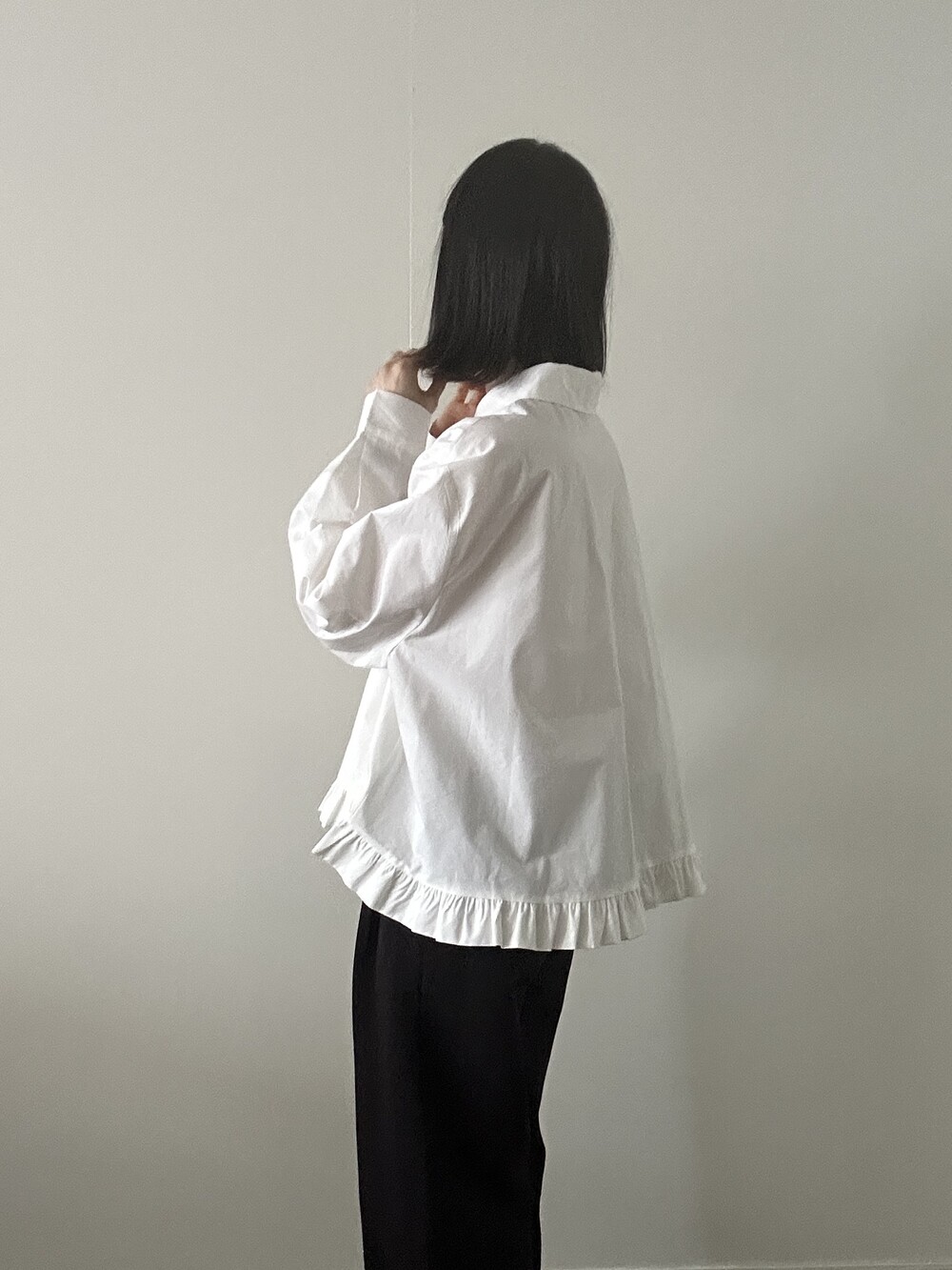 단정한 셔츠의 분위기에 자연스럽게 퍼지는 프릴이 더해져 심플하면서도 은은한 포인트가 됩니다.