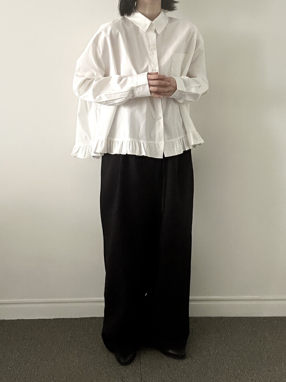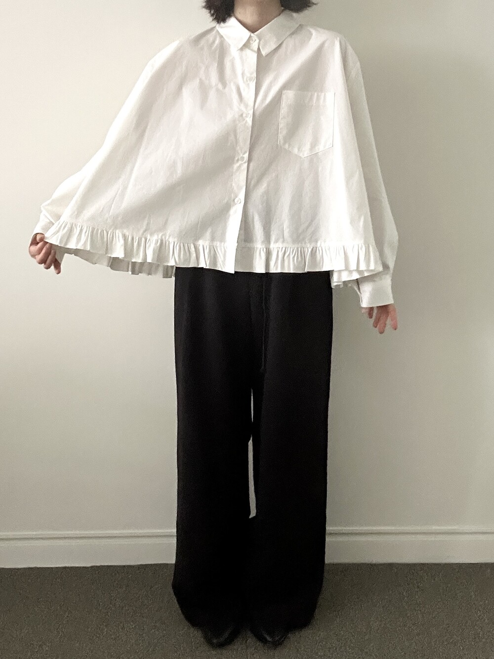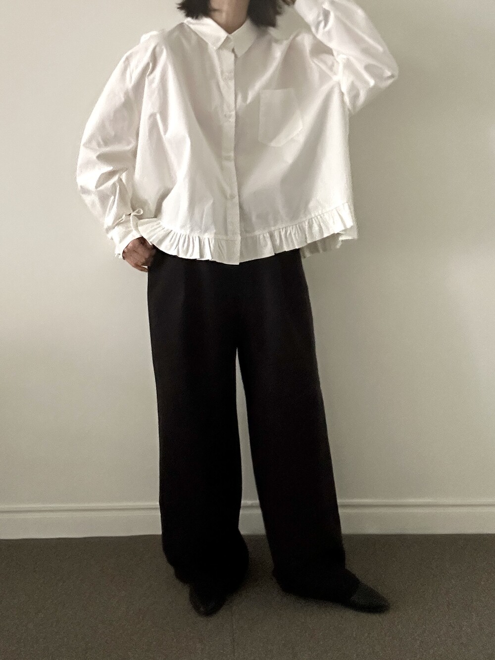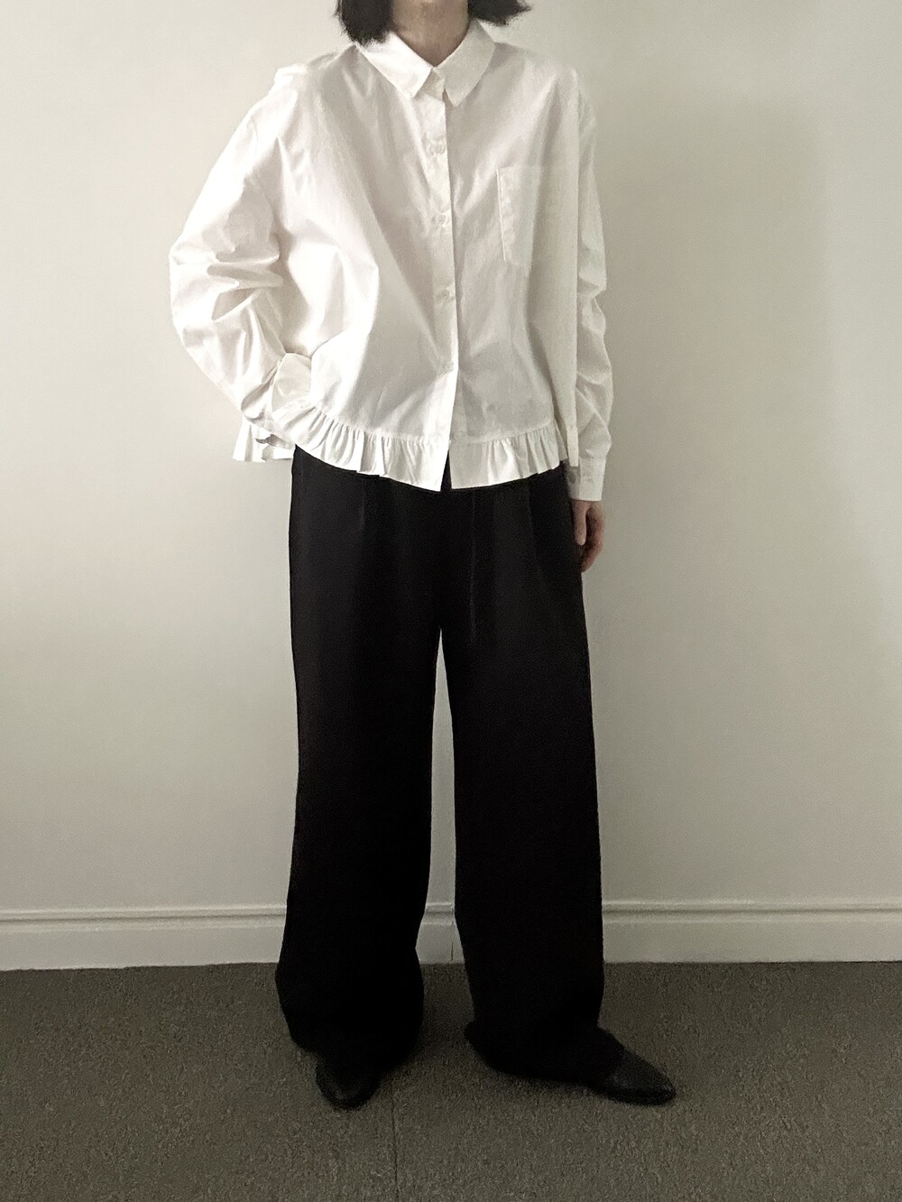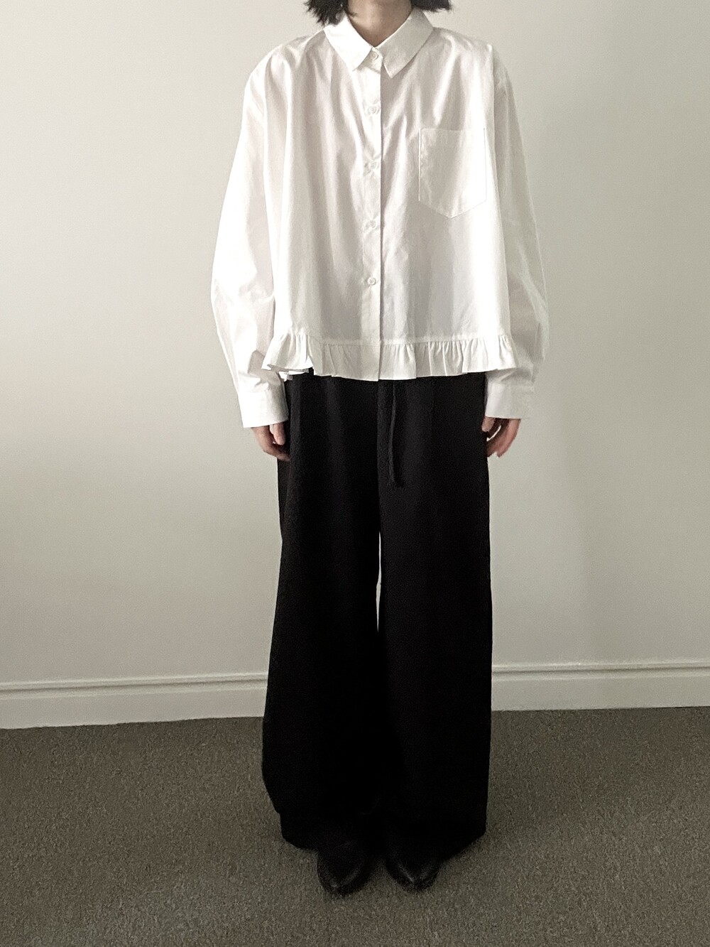 단정한 셔츠의 분위기에 자연스럽게 퍼지는 프릴이 더해져 심플하면서도 은은한 포인트가 됩니다.