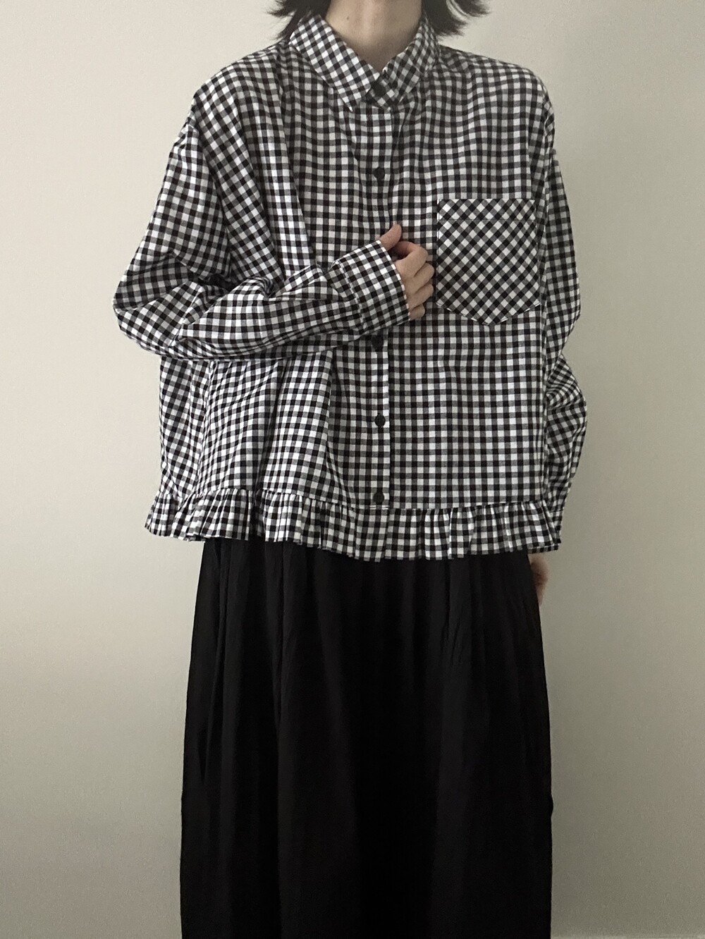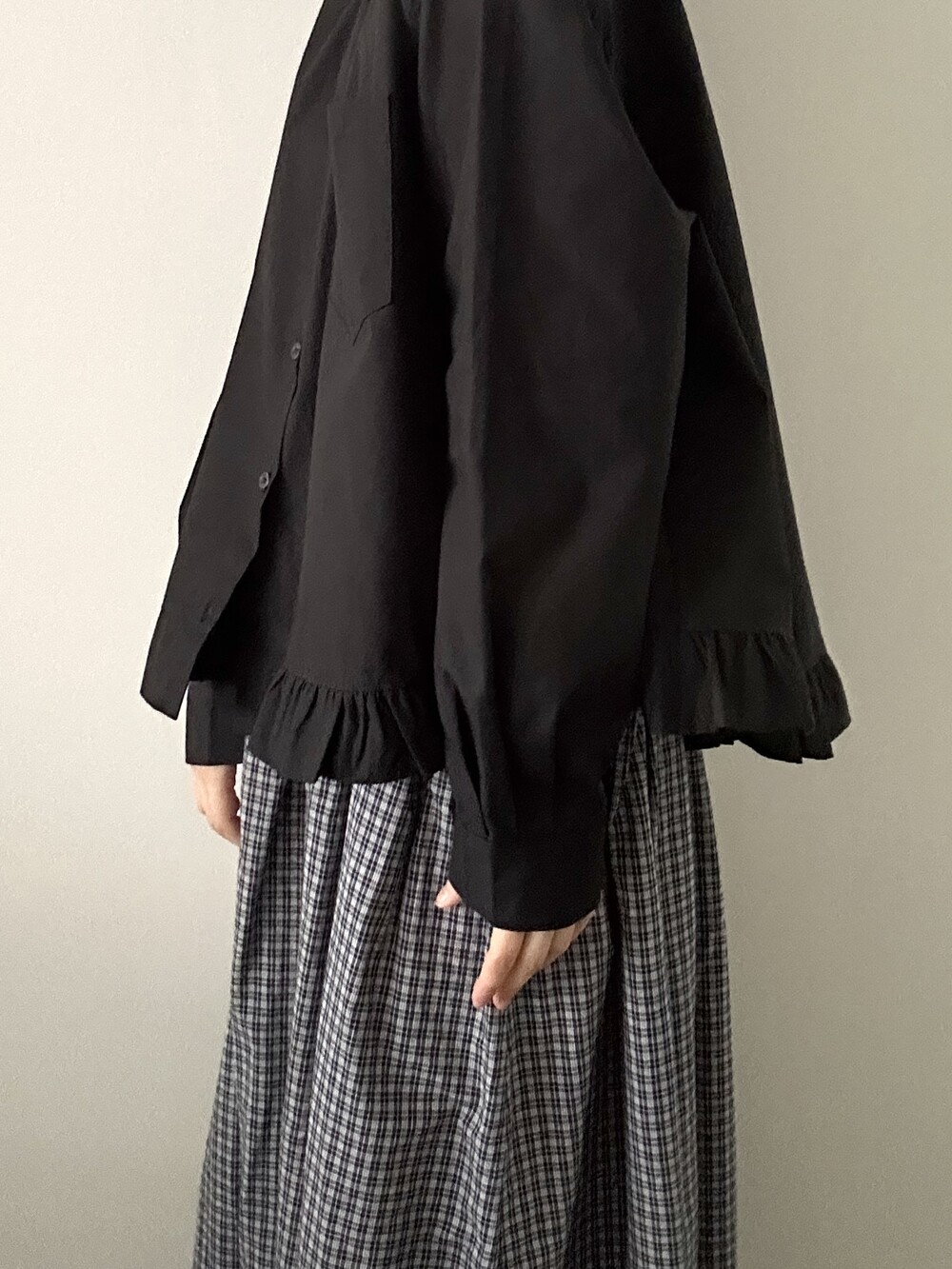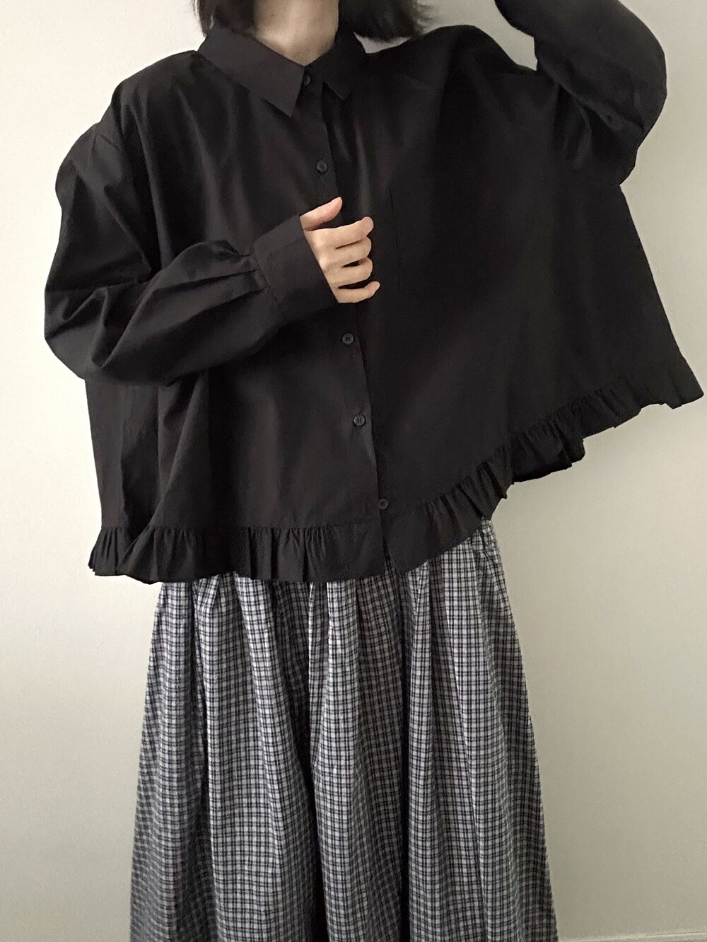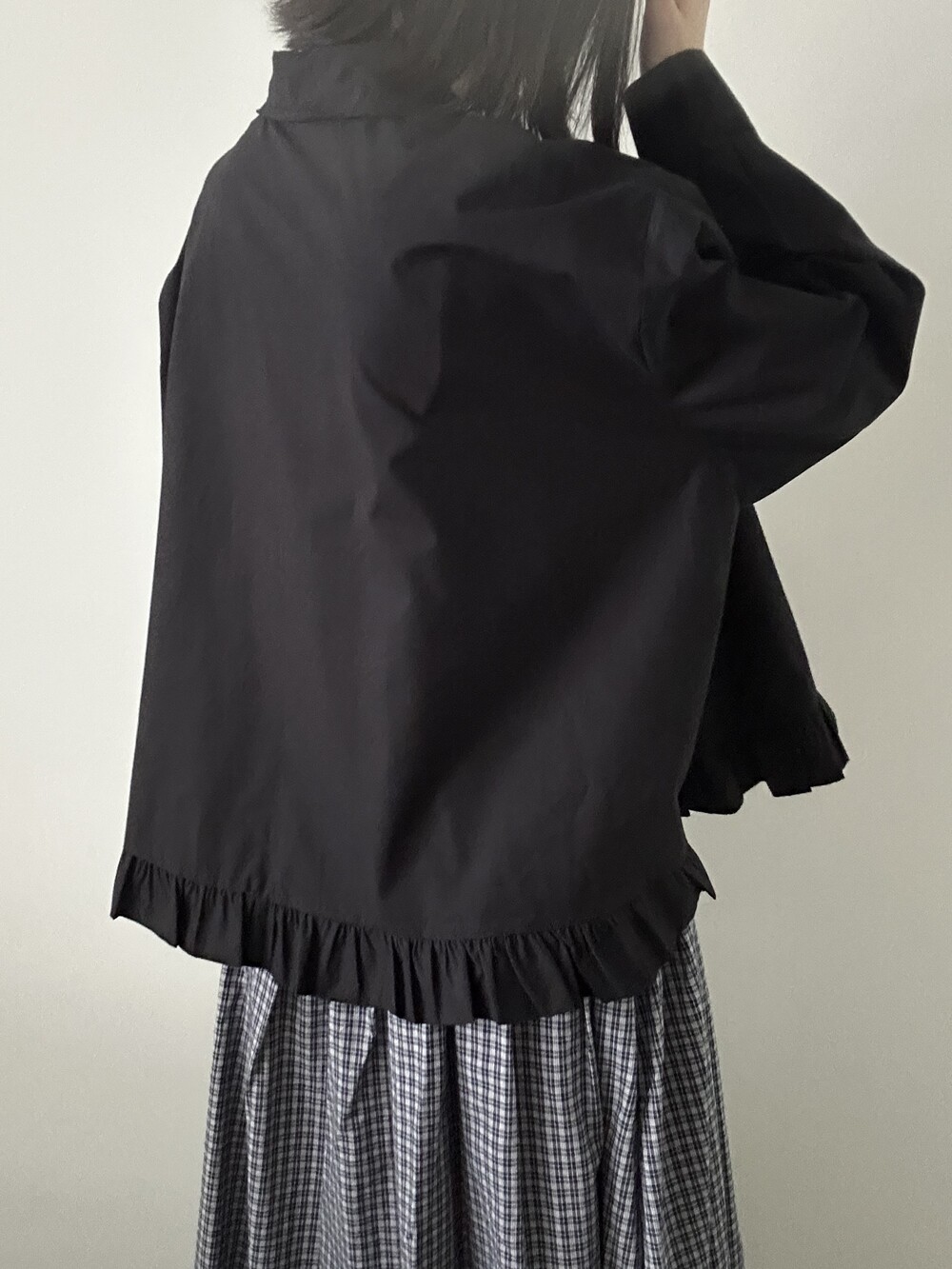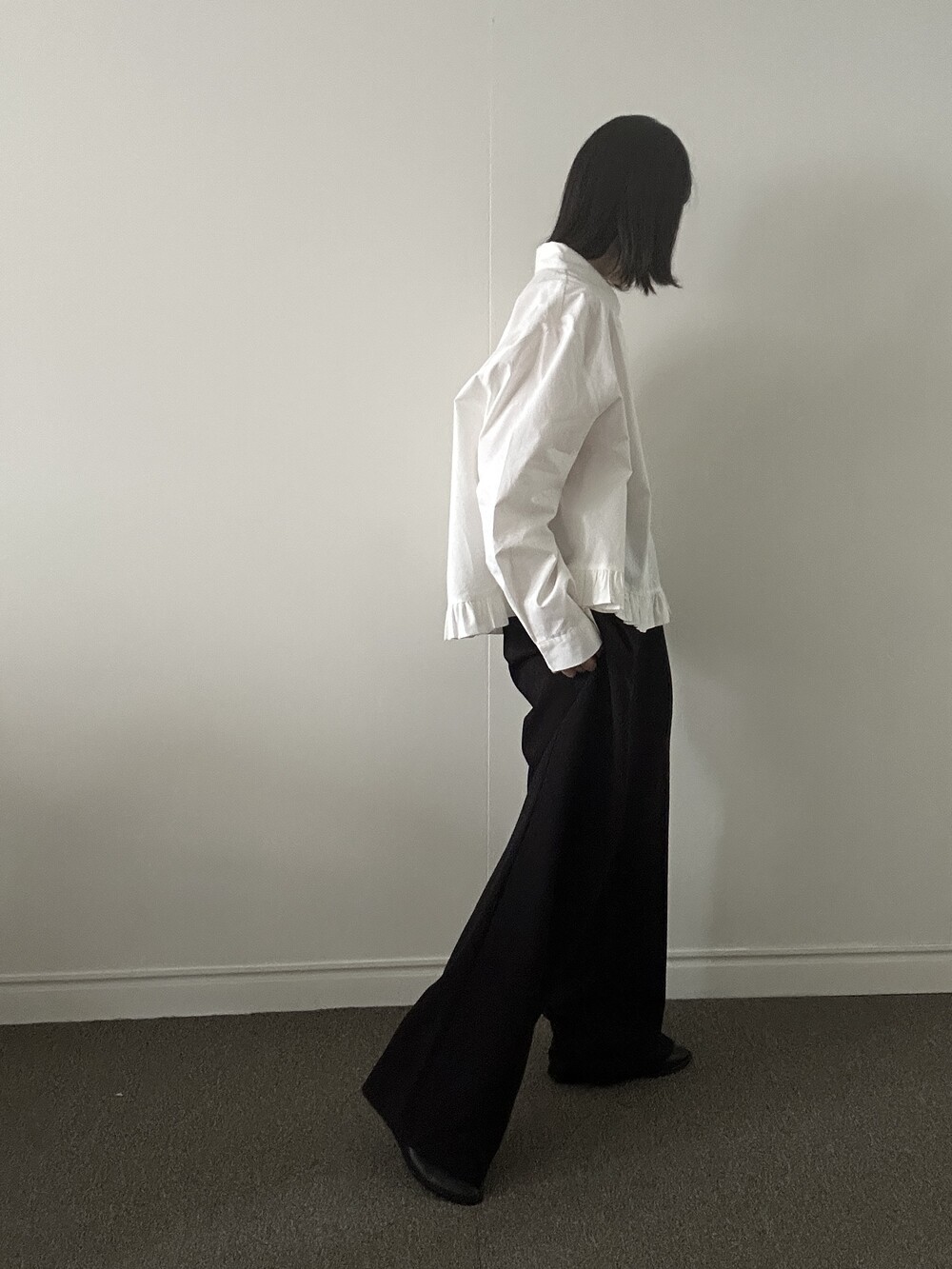 단정한 셔츠의 분위기에 자연스럽게 퍼지는 프릴이 더해져 심플하면서도 은은한 포인트가 됩니다.
