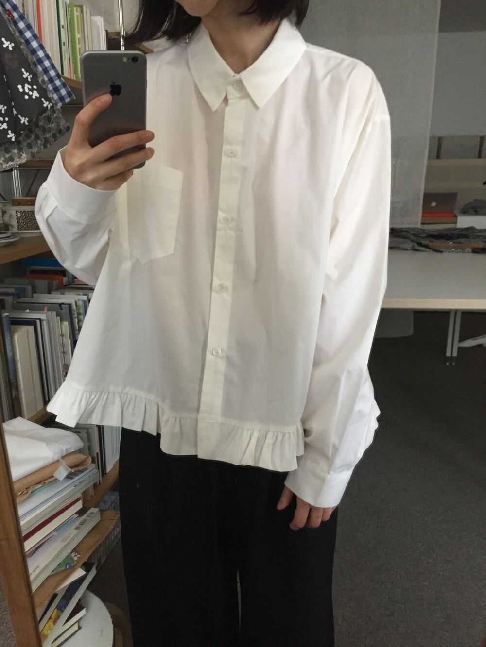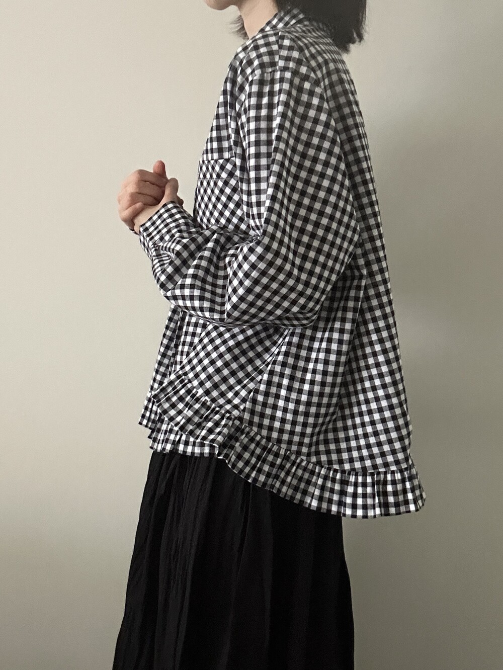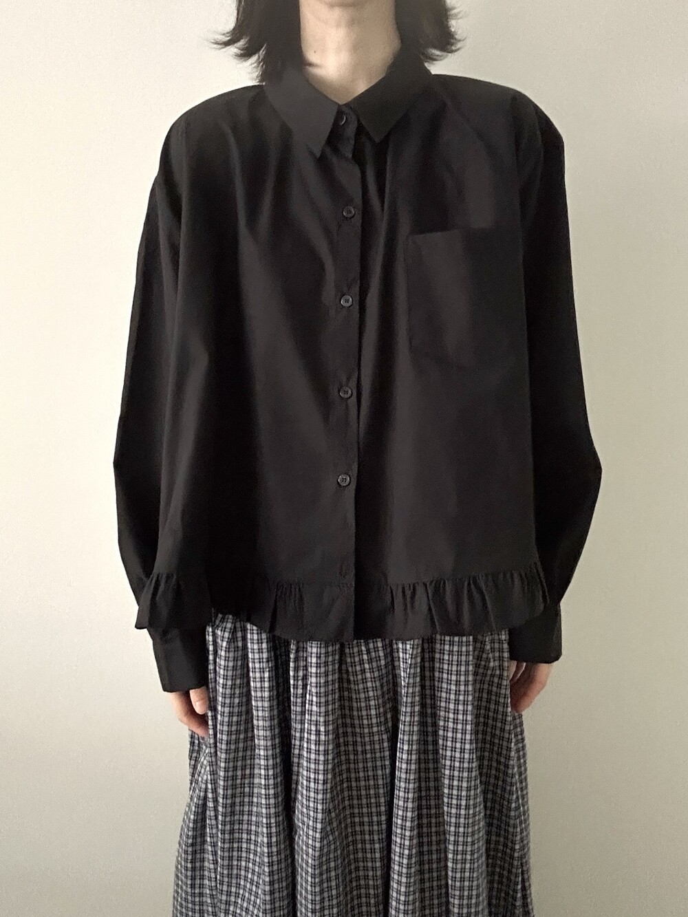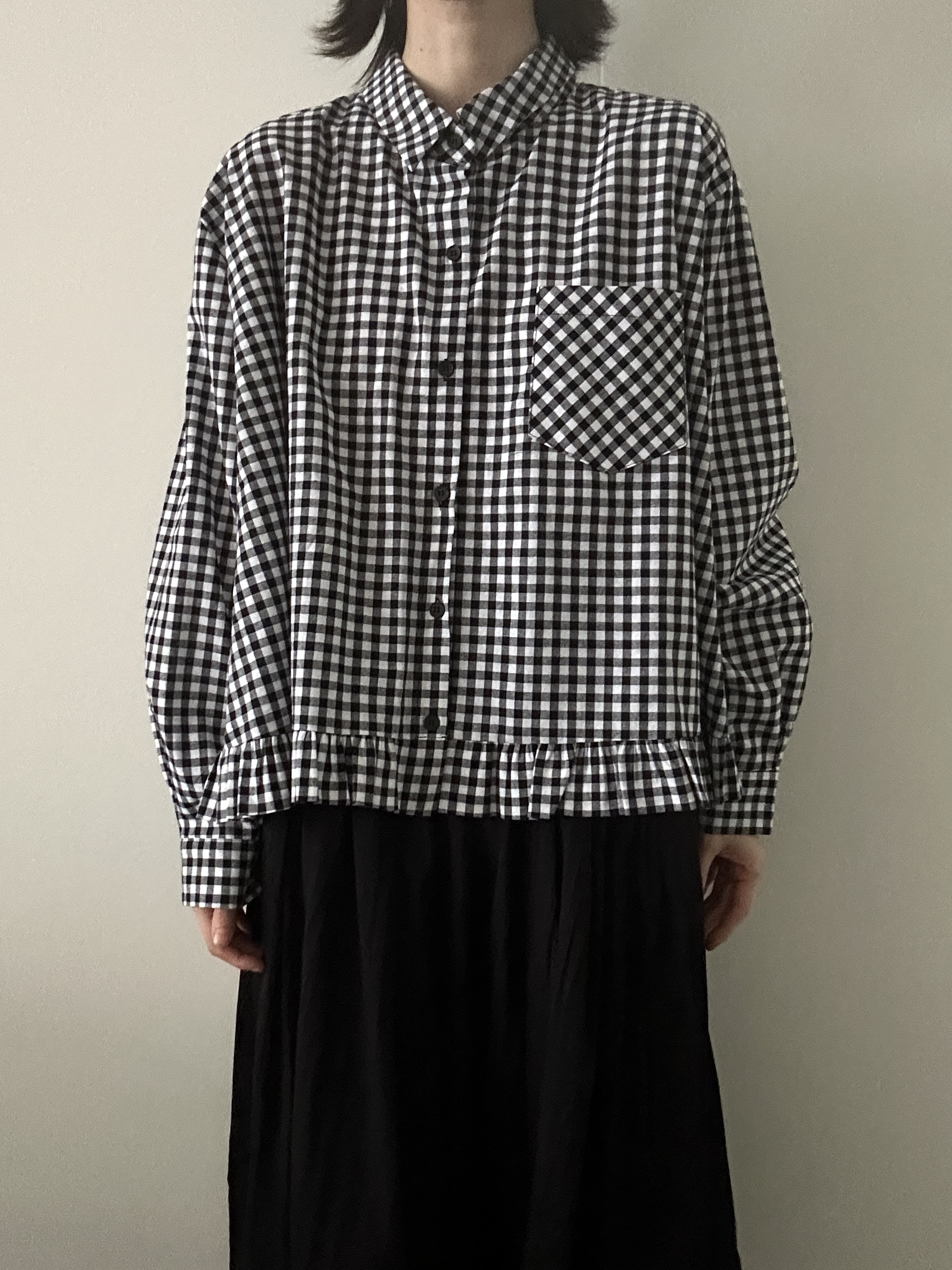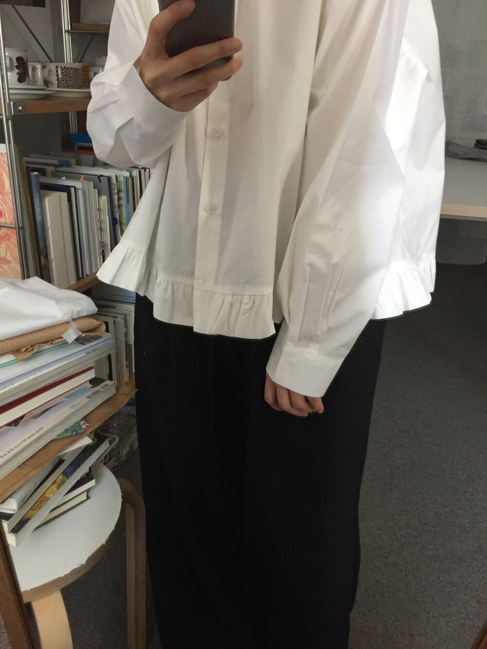 단정한 셔츠의 분위기에 자연스럽게 퍼지는 프릴이 더해져 심플하면서도 은은한 포인트가 됩니다.