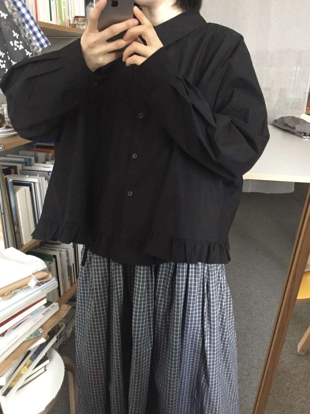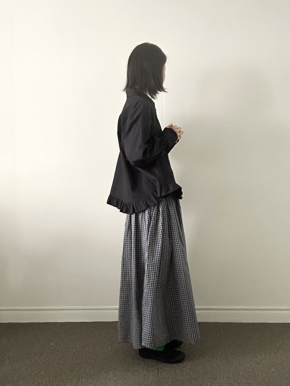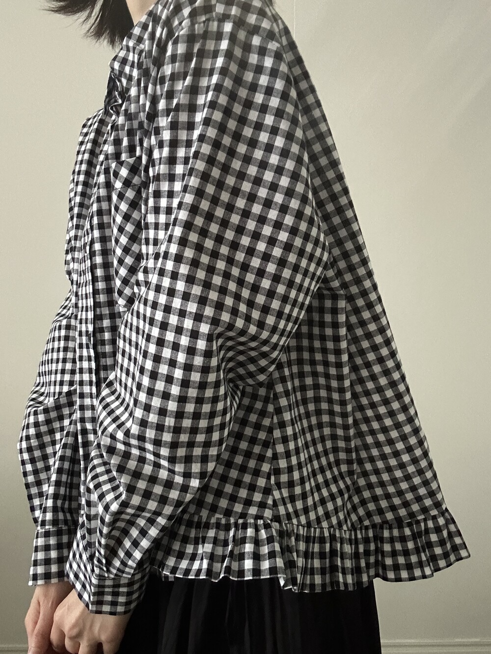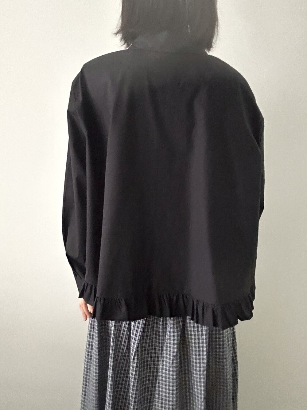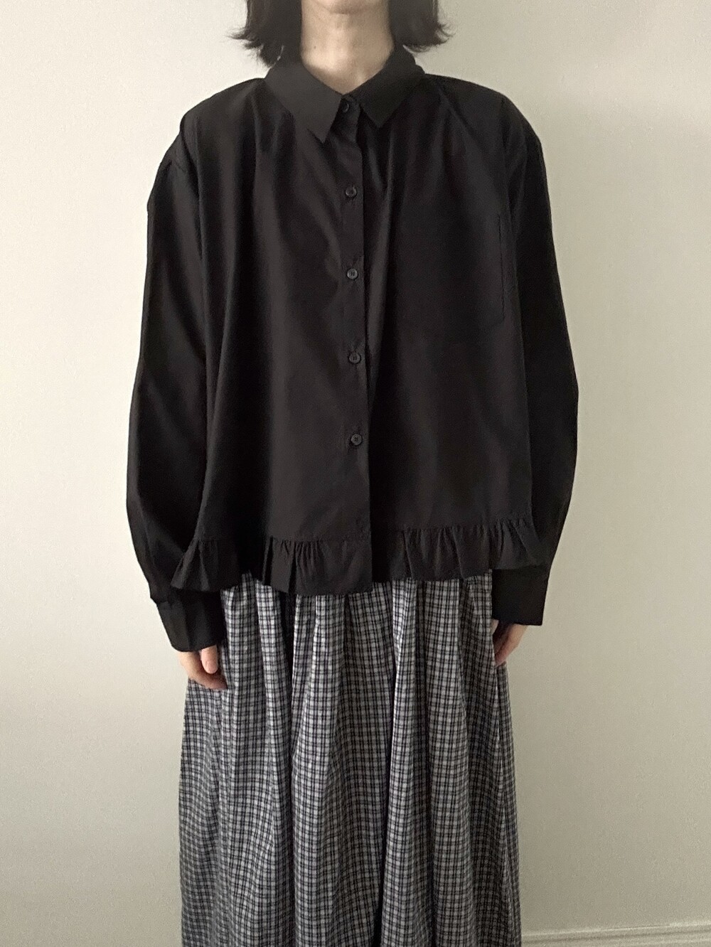 단정한 셔츠의 분위기에 자연스럽게 퍼지는 프릴이 더해져 심플하면서도 은은한 포인트가 됩니다.
