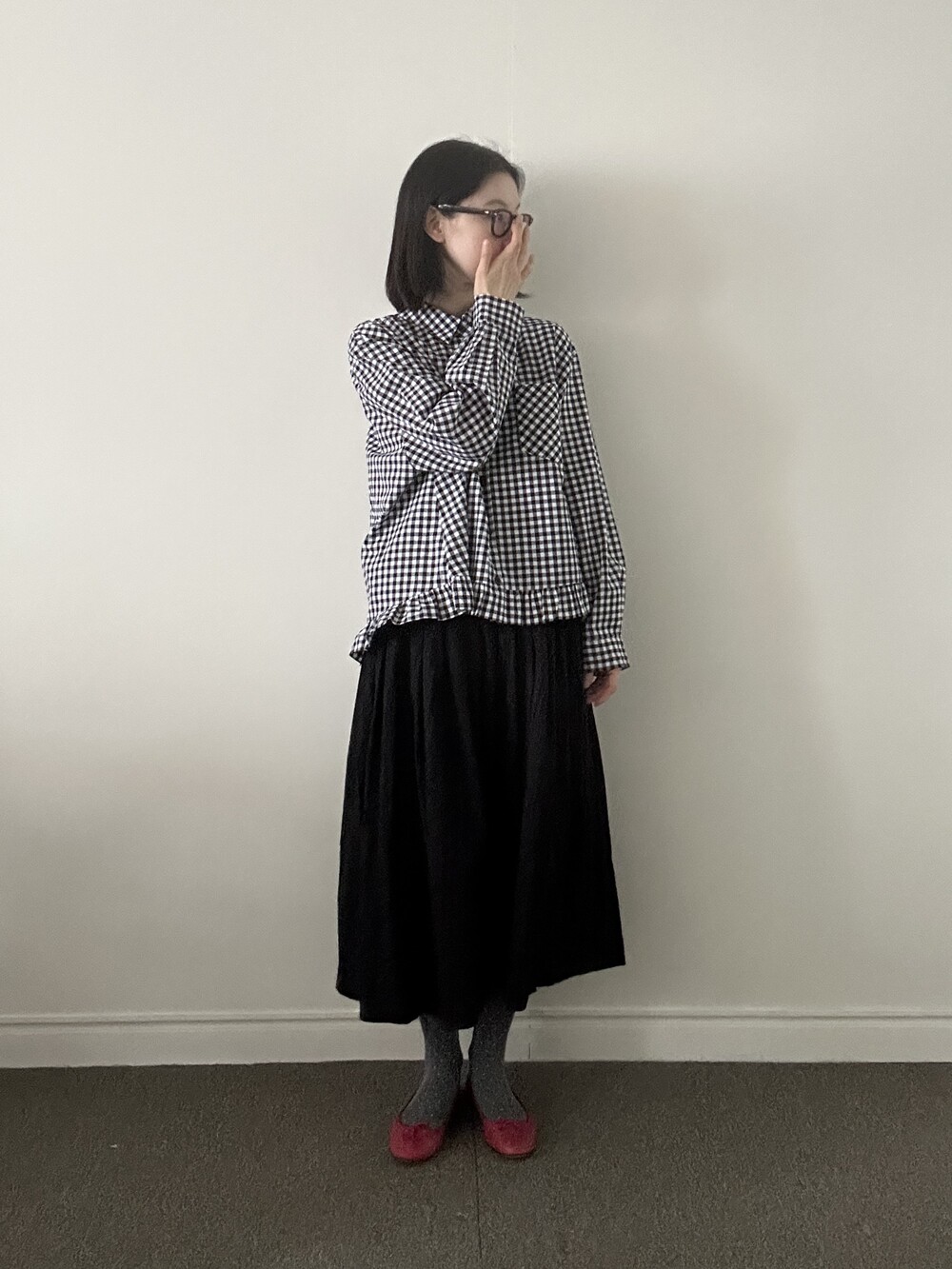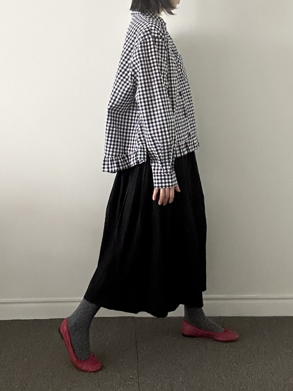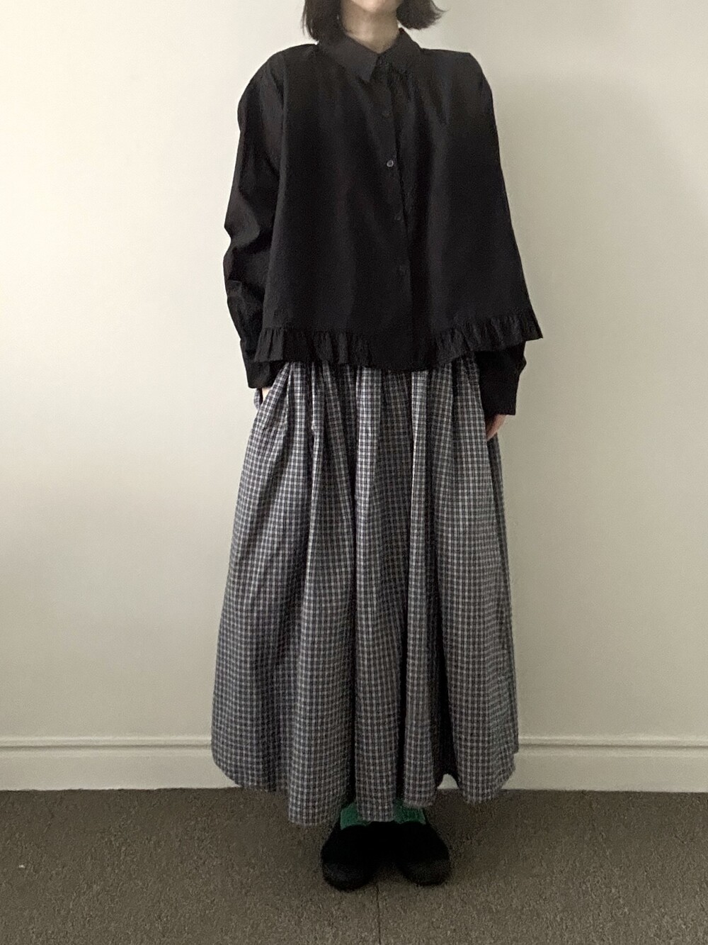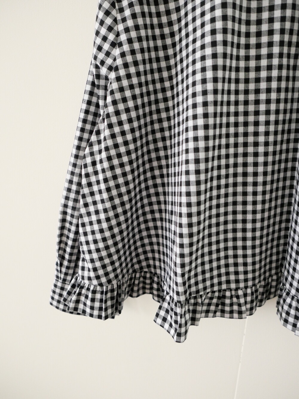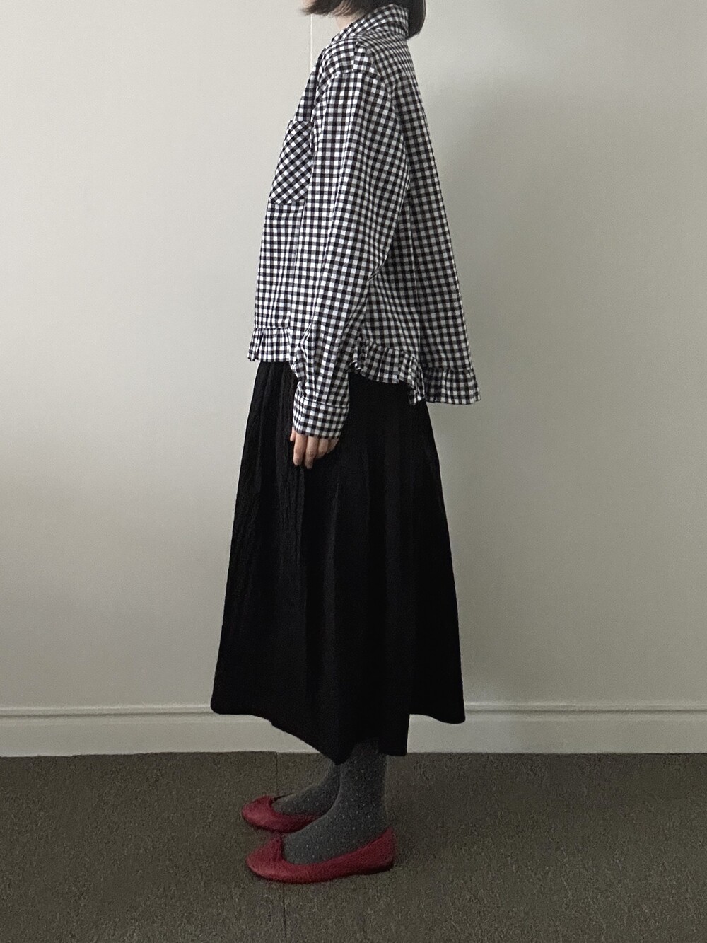 단정한 셔츠의 분위기에 자연스럽게 퍼지는 프릴이 더해져 심플하면서도 은은한 포인트가 됩니다.
