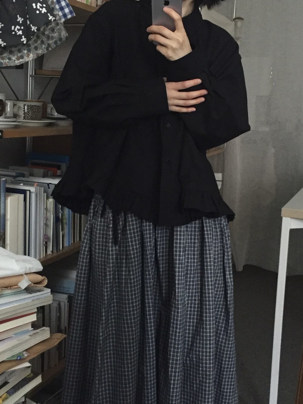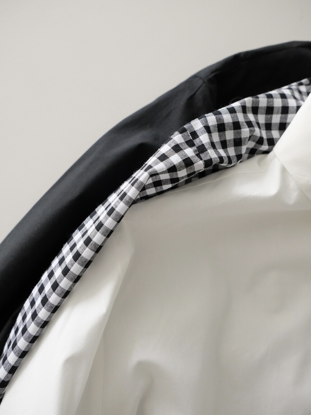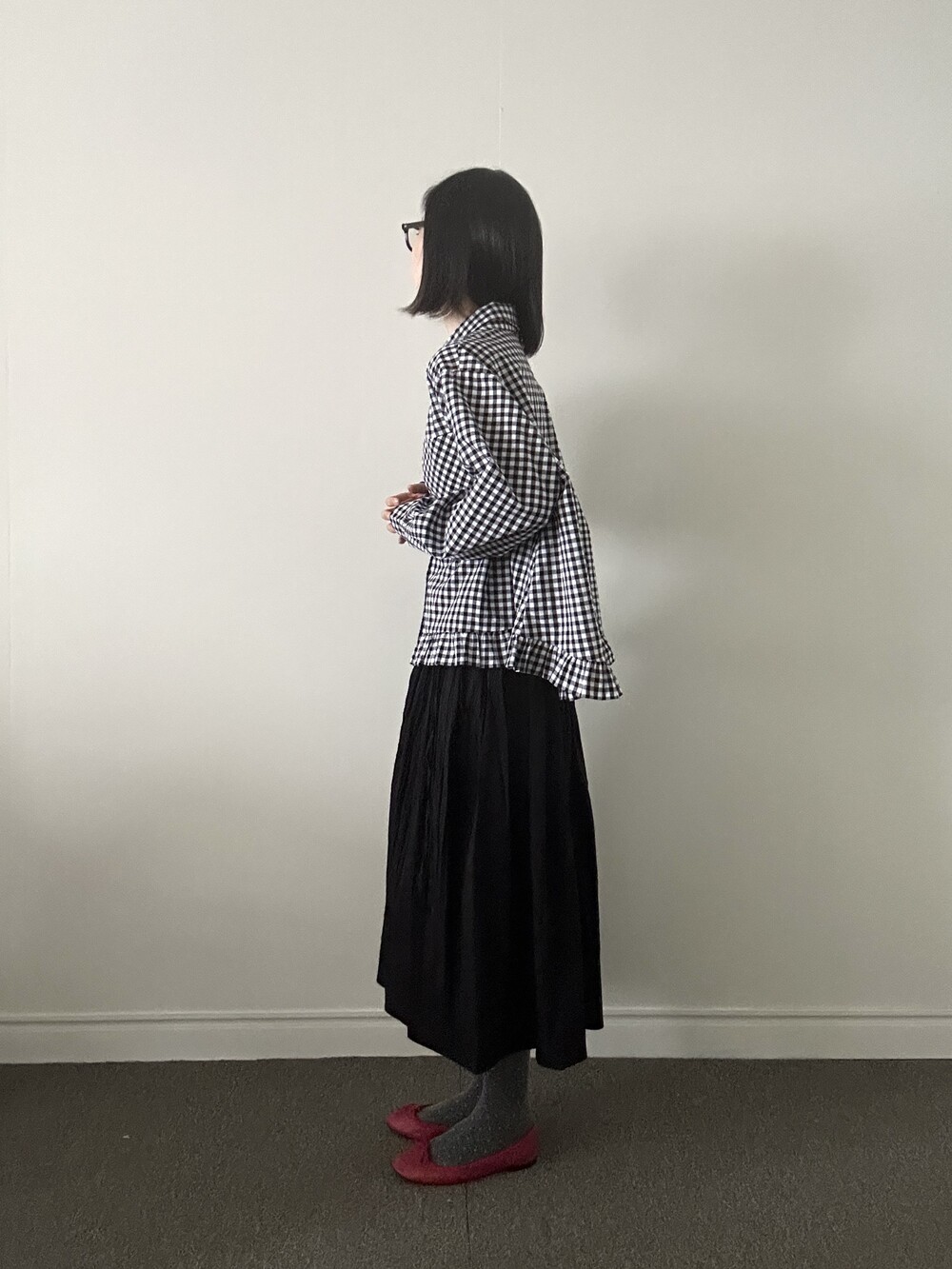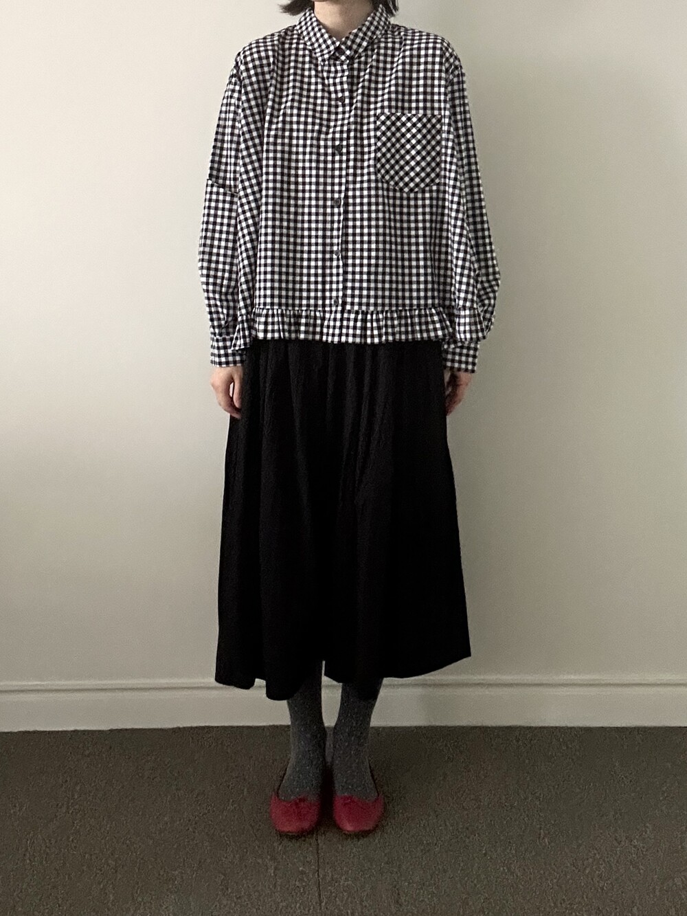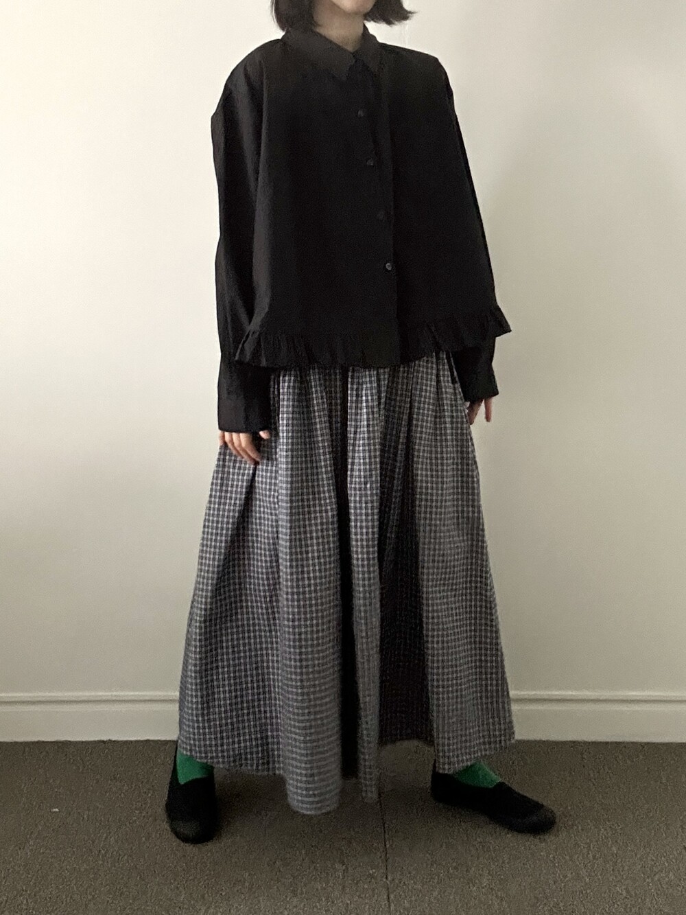 단정한 셔츠의 분위기에 자연스럽게 퍼지는 프릴이 더해져 심플하면서도 은은한 포인트가 됩니다.