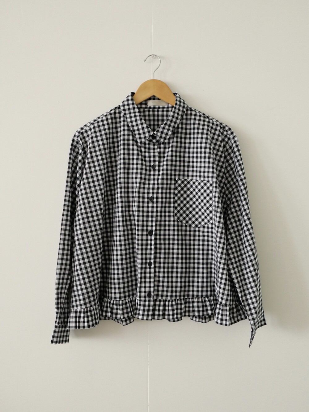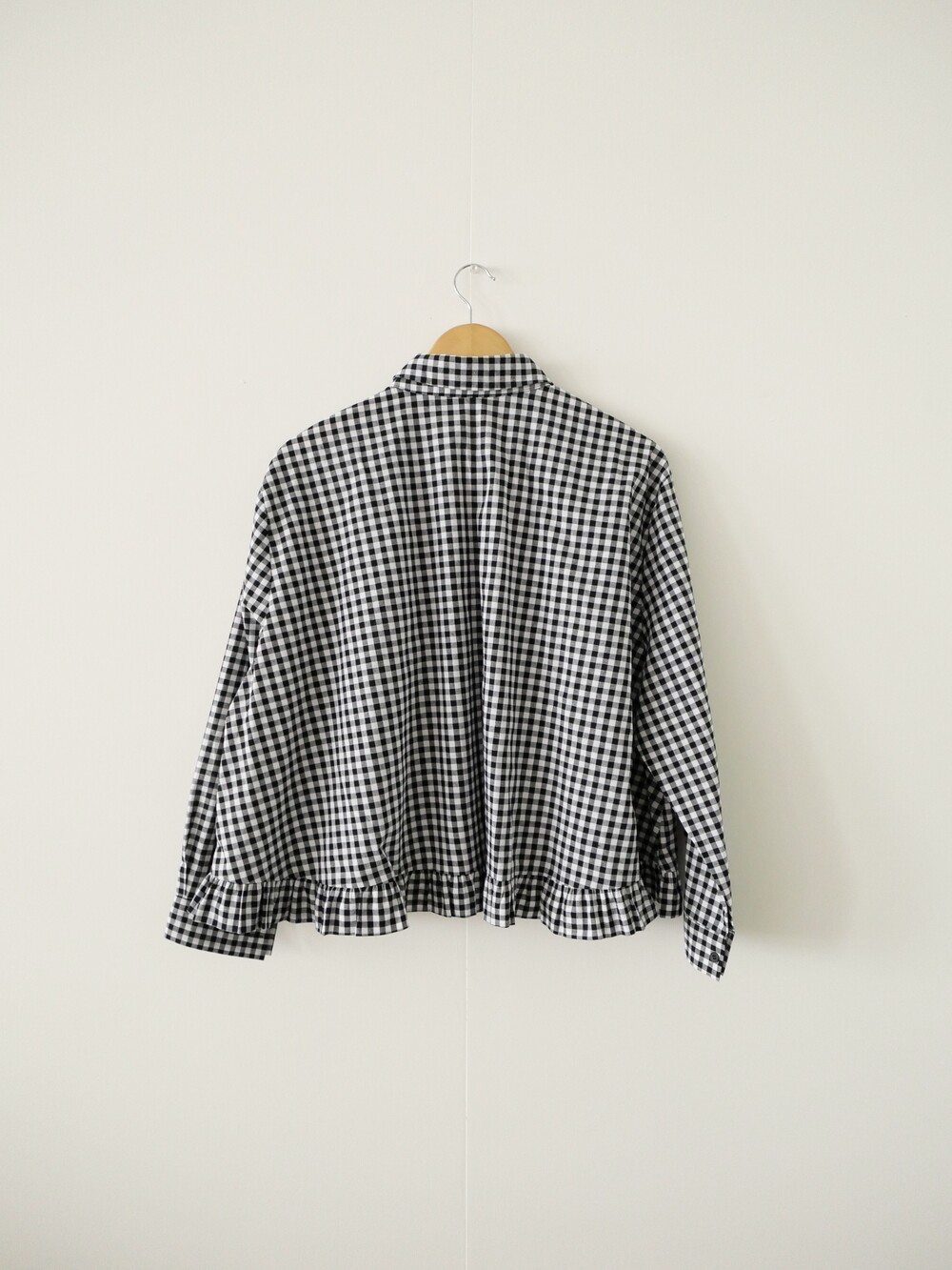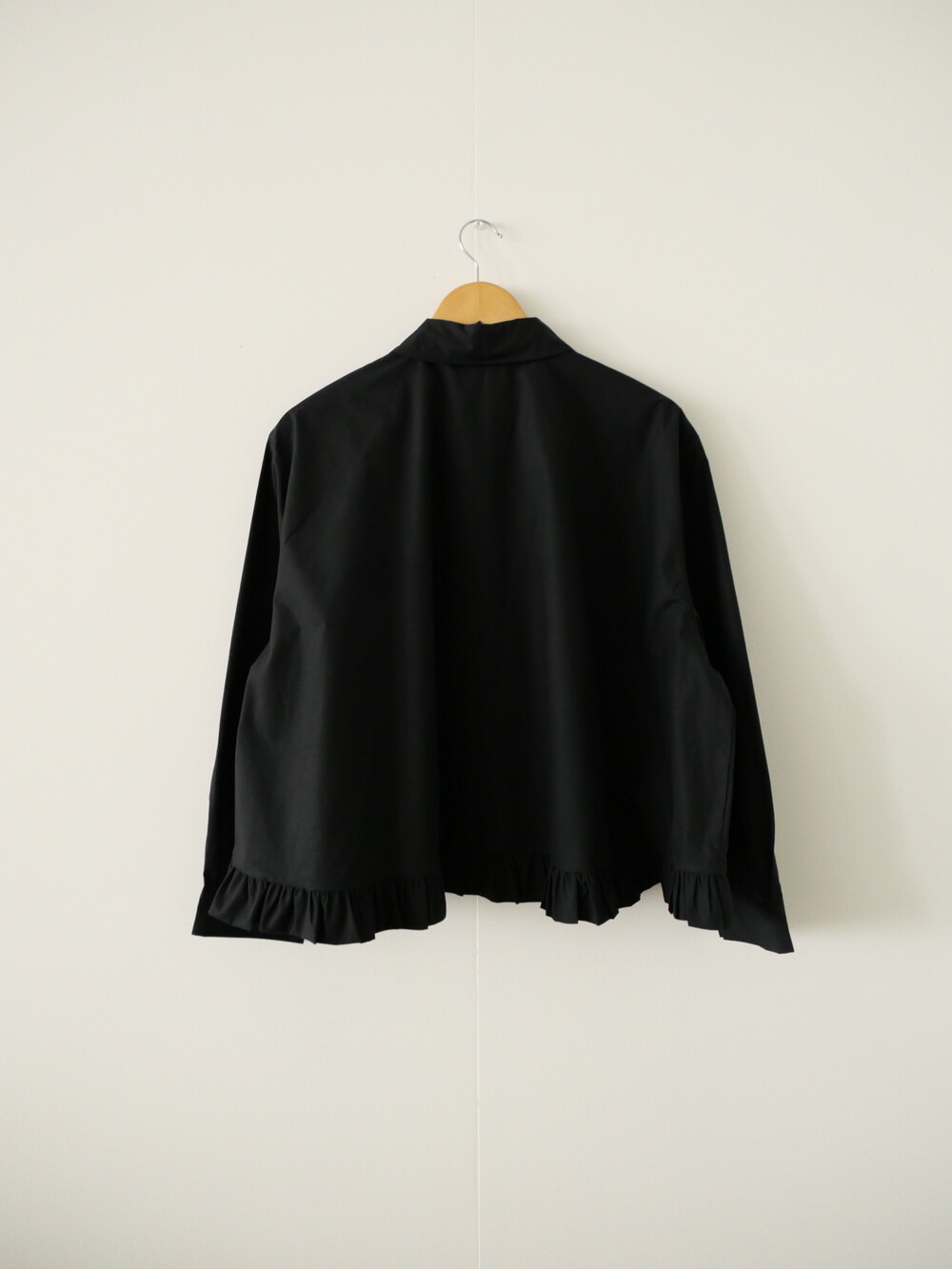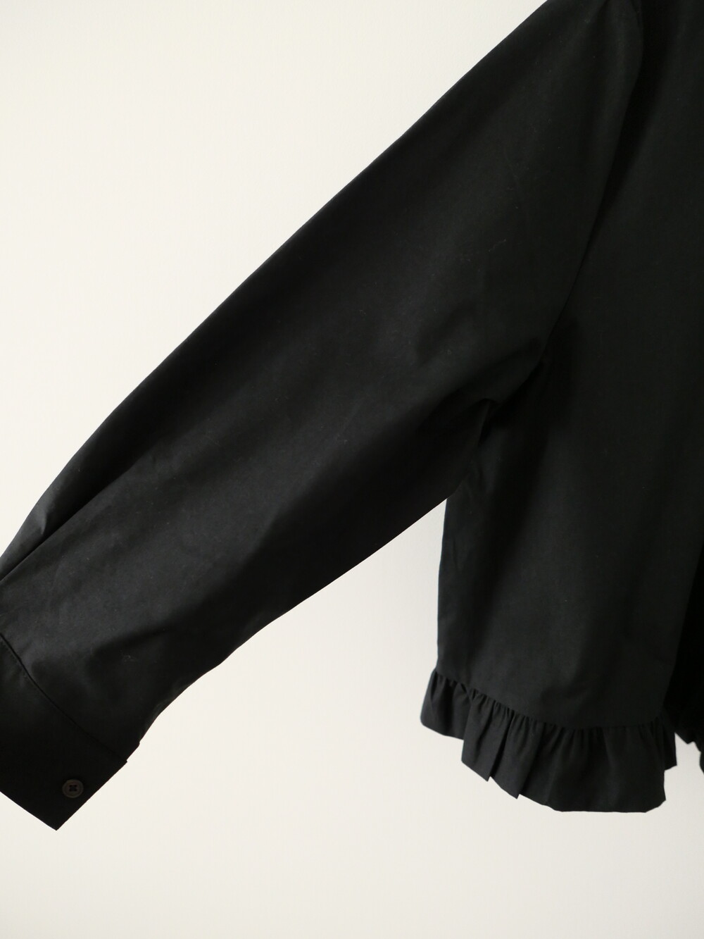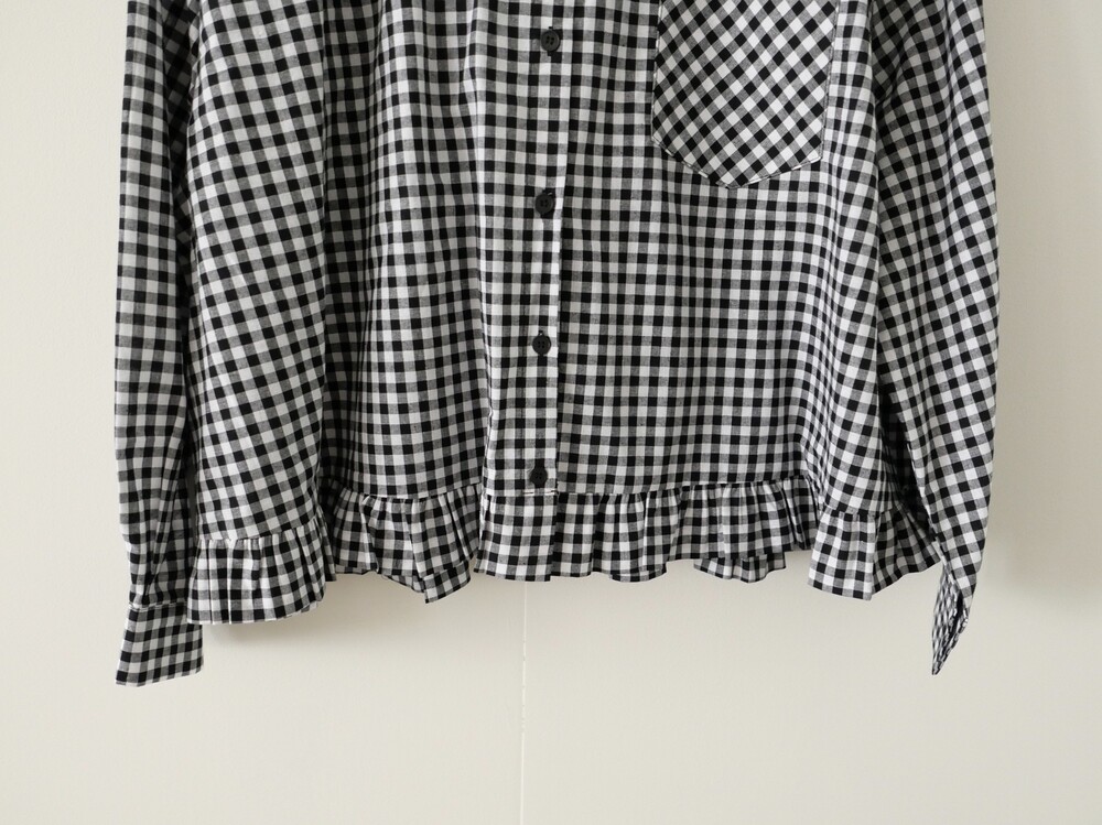 깔끔한 카라 디자인에 밑단 프릴 디테일을 더한 코튼 셔츠입니다.