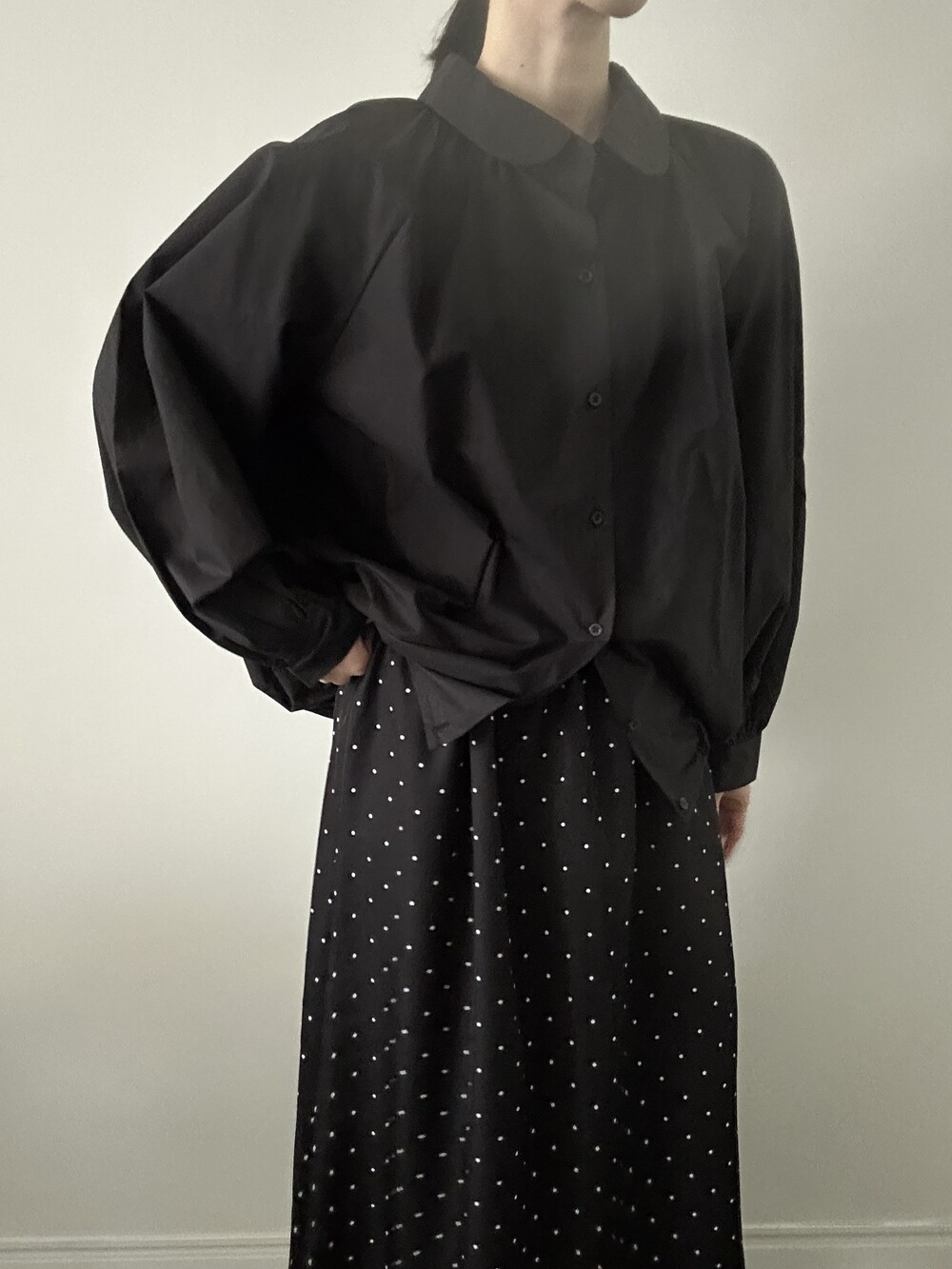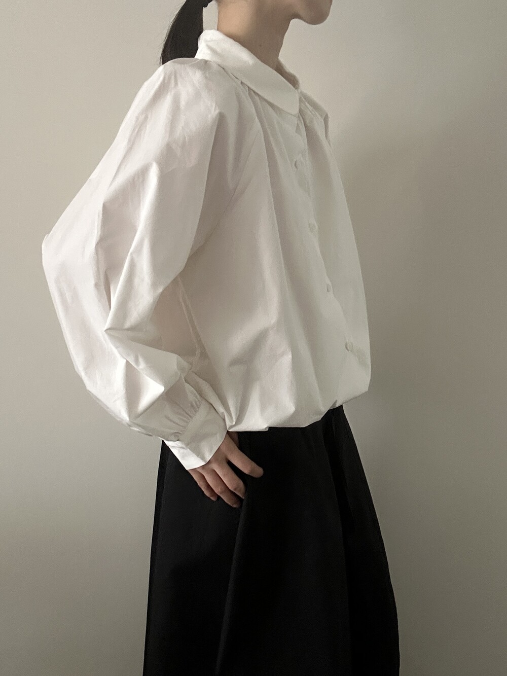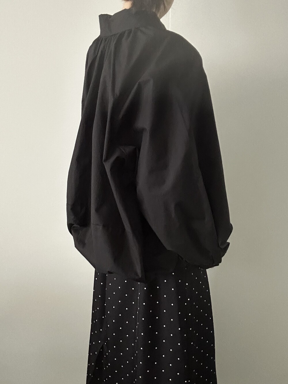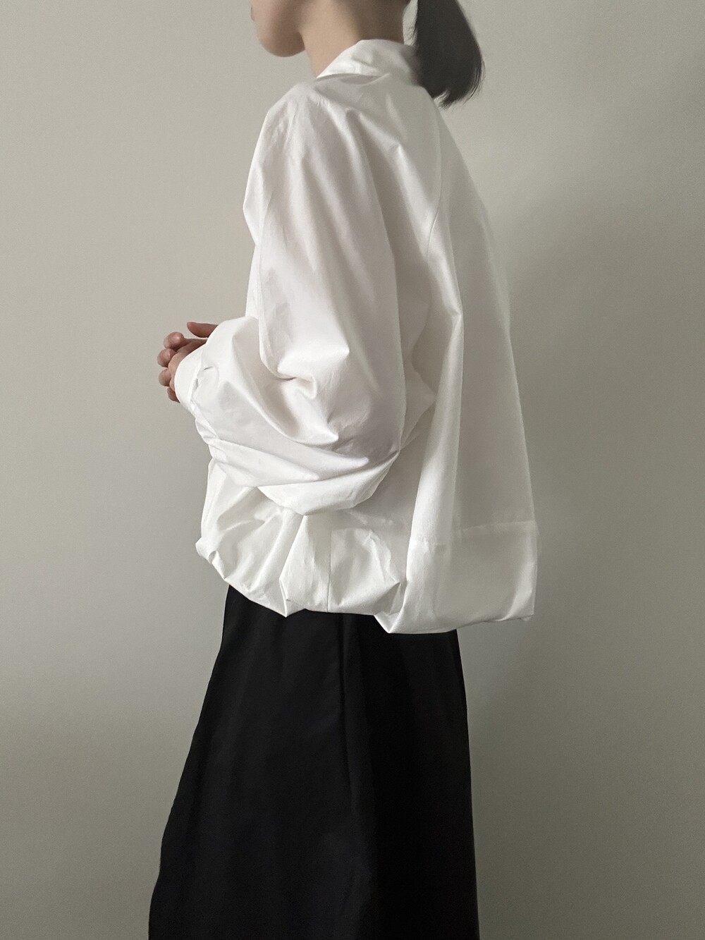 소매 역시 볼륨감 있게 마무리되어 전체적인 균형을 잡아줍니다.