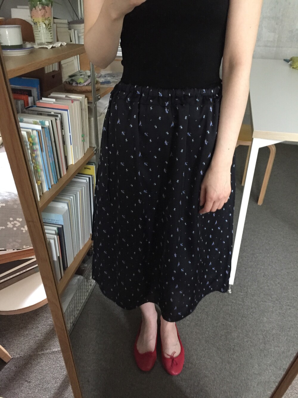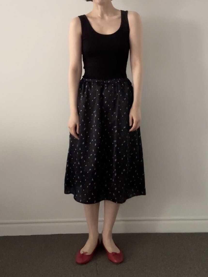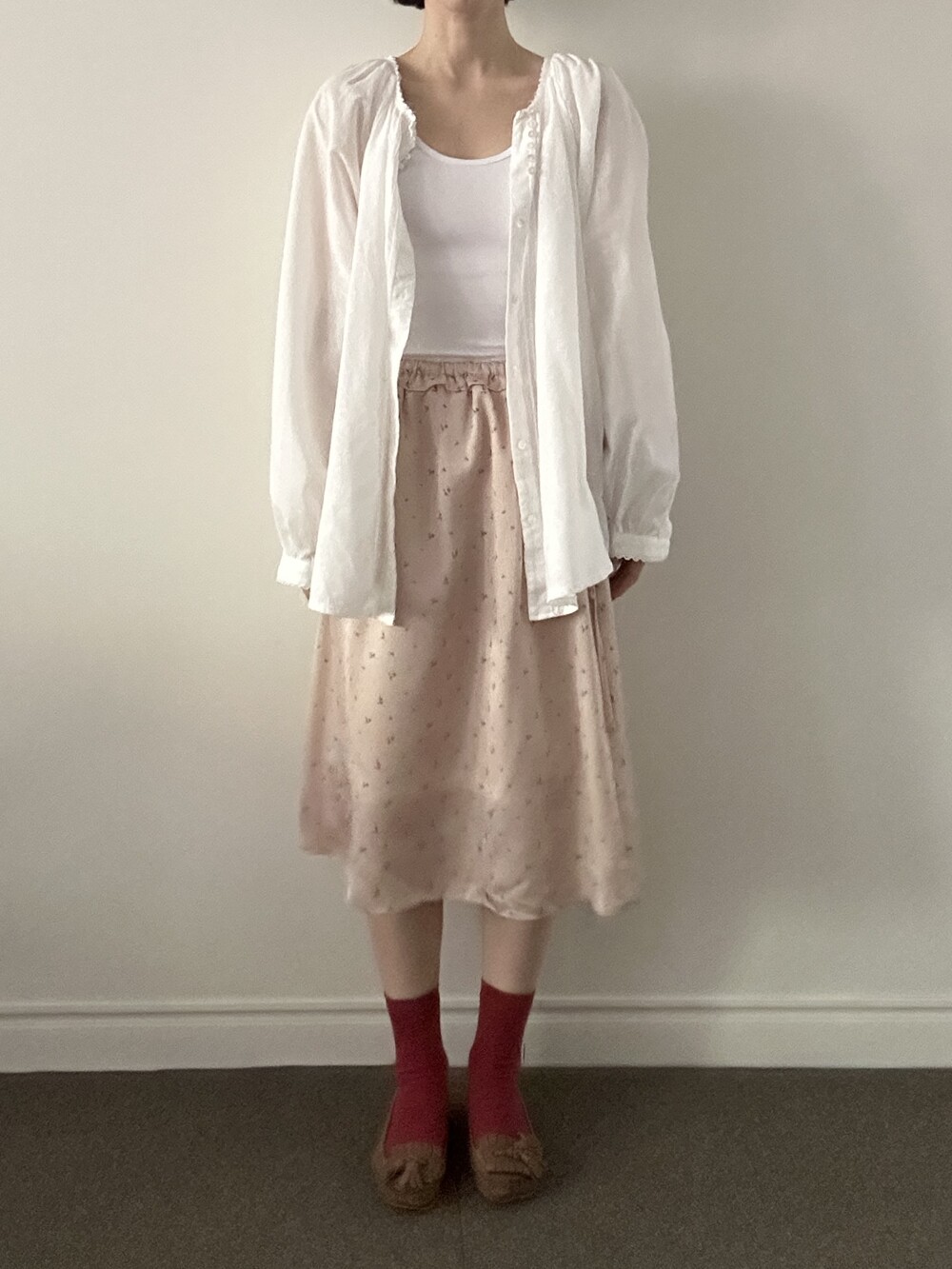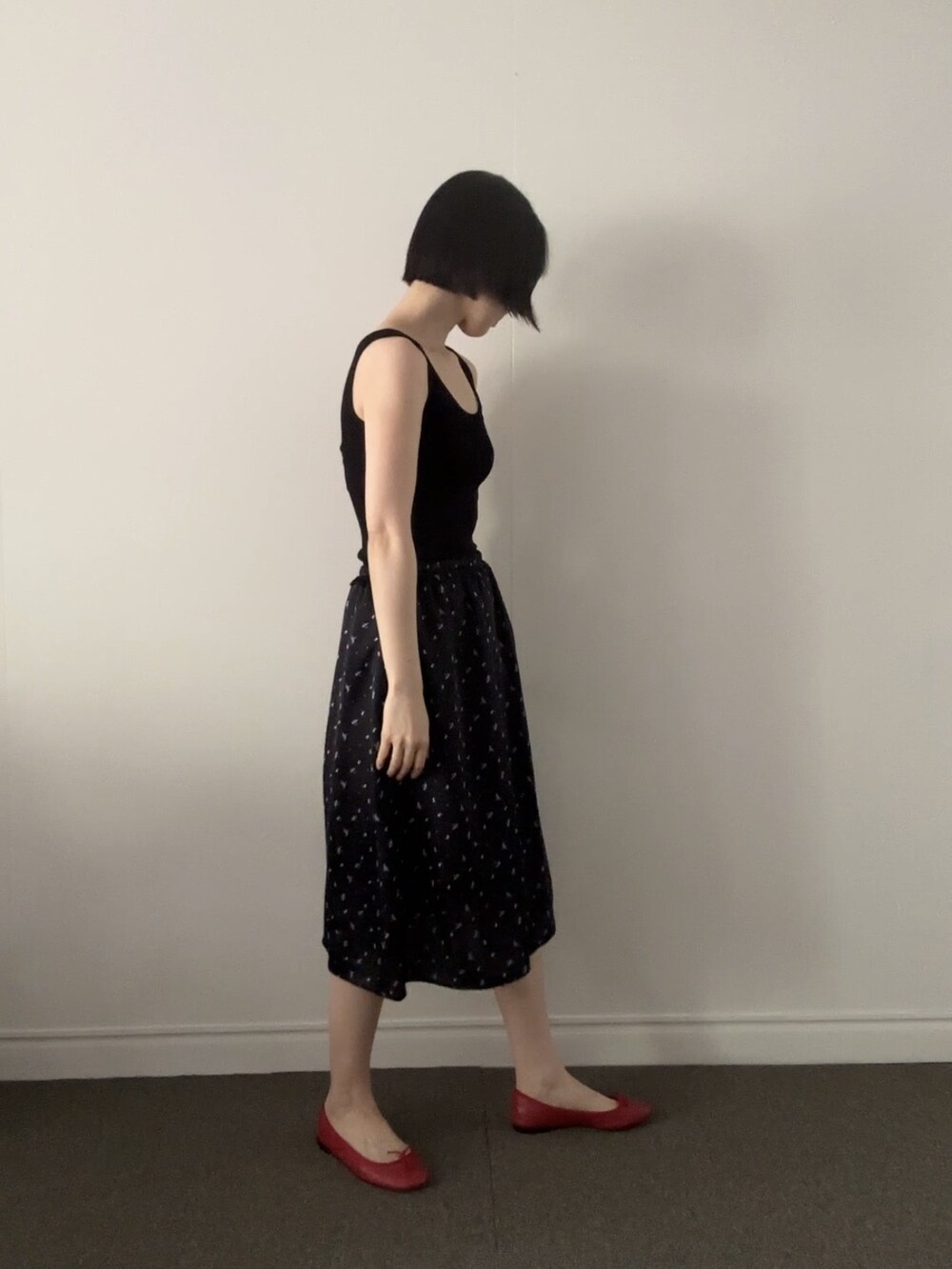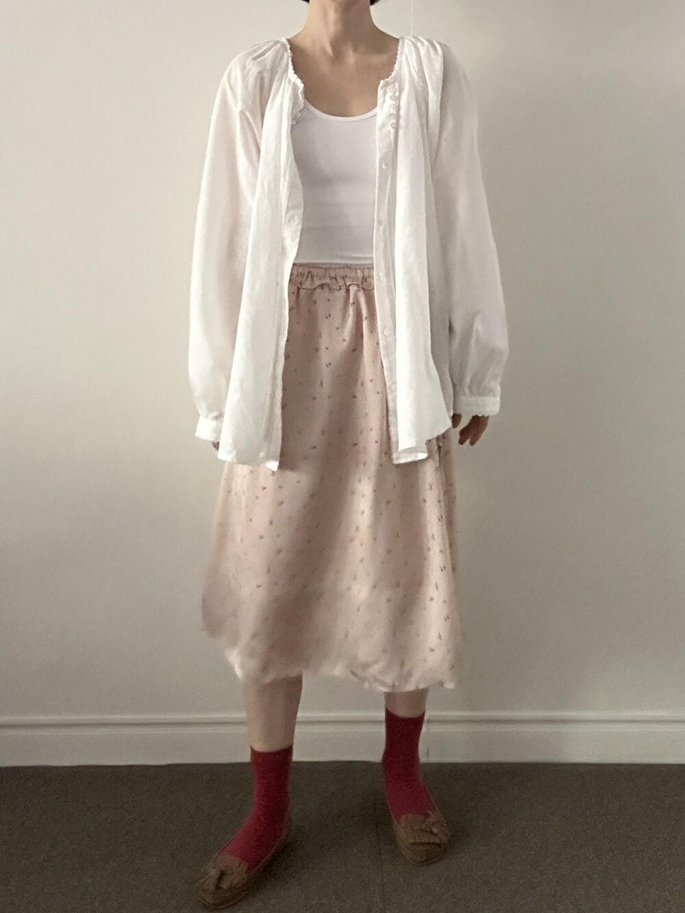 무릎을 살짝 덮는 적당한 미디 기장에 밑단으로 갈수록 퍼지는 A라인 실루엣이 하체 라인을 자연스럽게 커버하며 여성스러운 분위기를 줍니다.