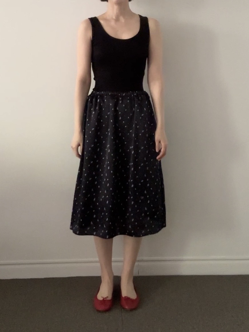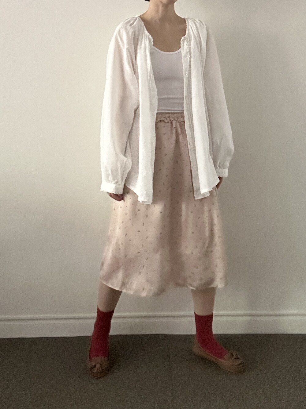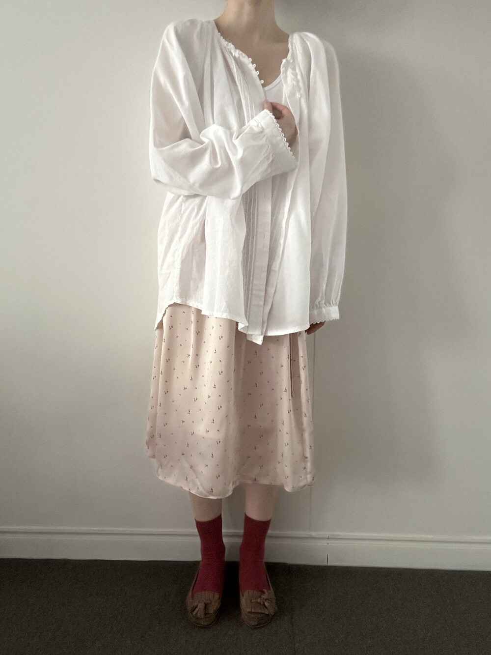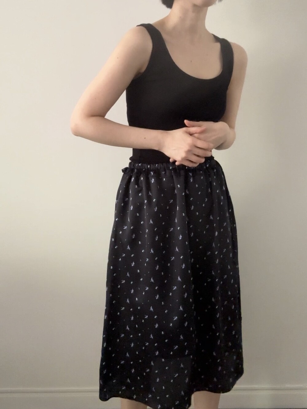 무릎을 살짝 덮는 적당한 미디 기장에 밑단으로 갈수록 퍼지는 A라인 실루엣이 하체 라인을 자연스럽게 커버하며 여성스러운 분위기를 줍니다.