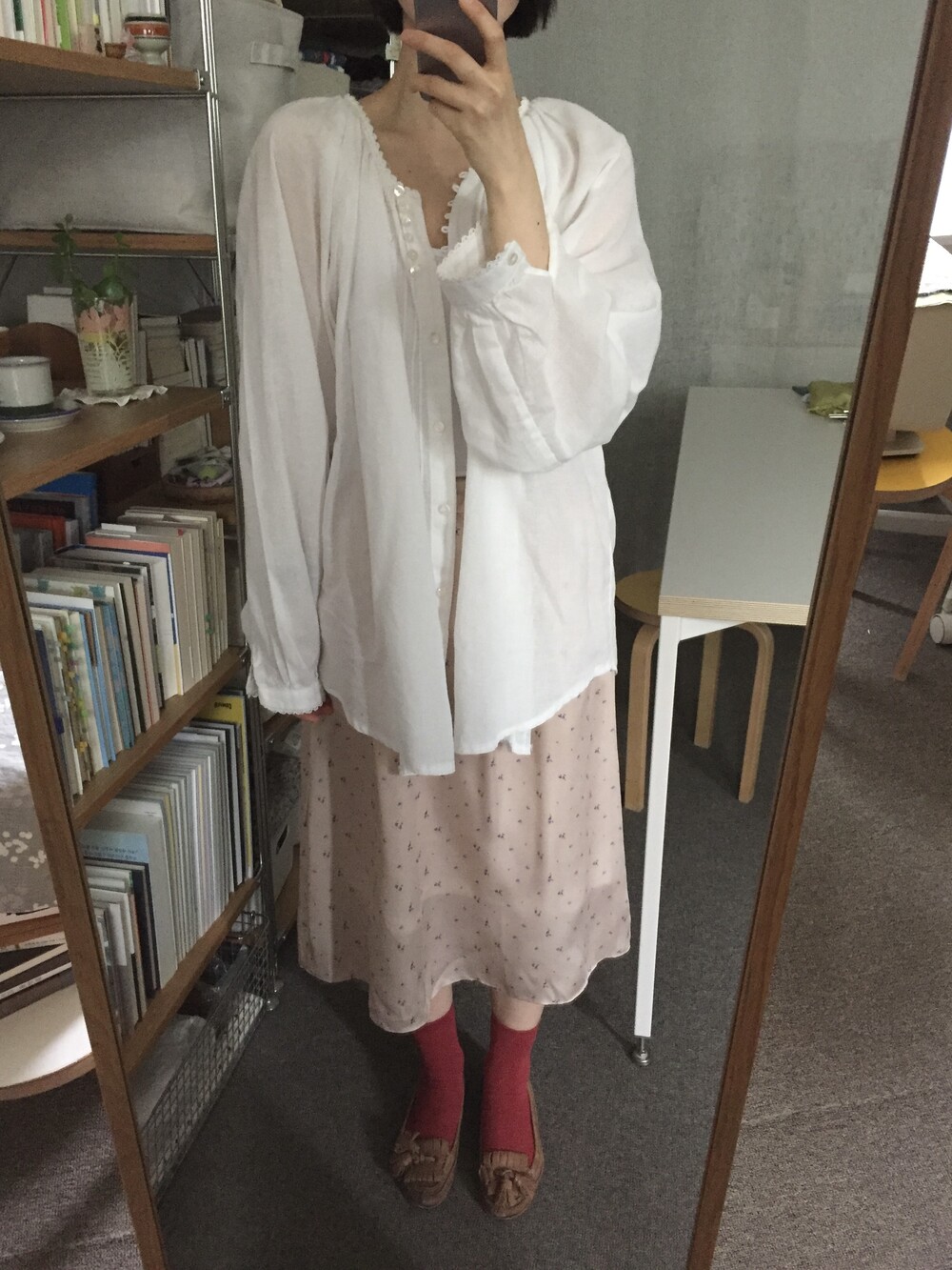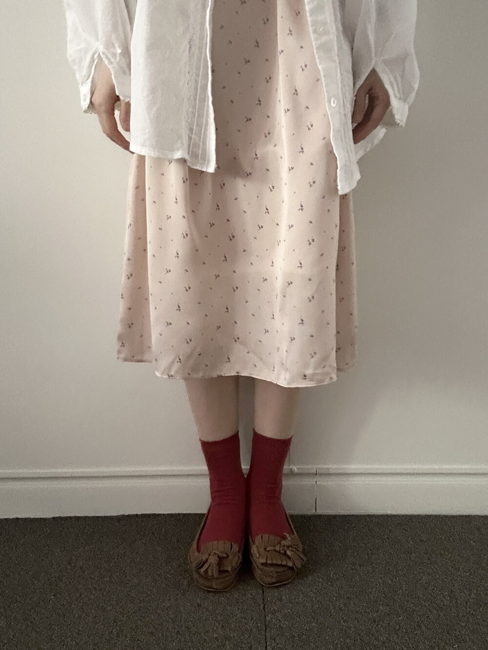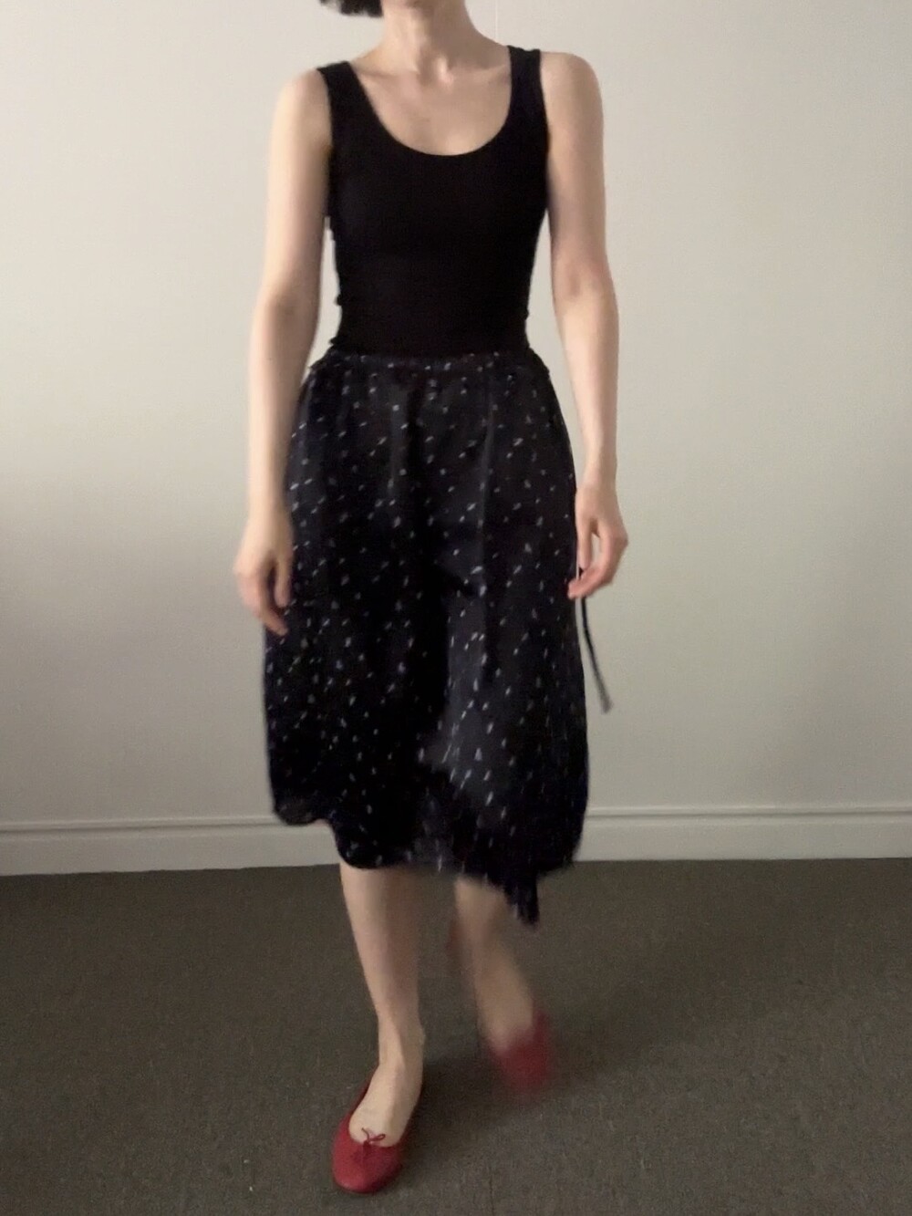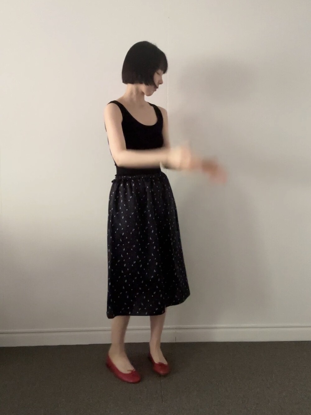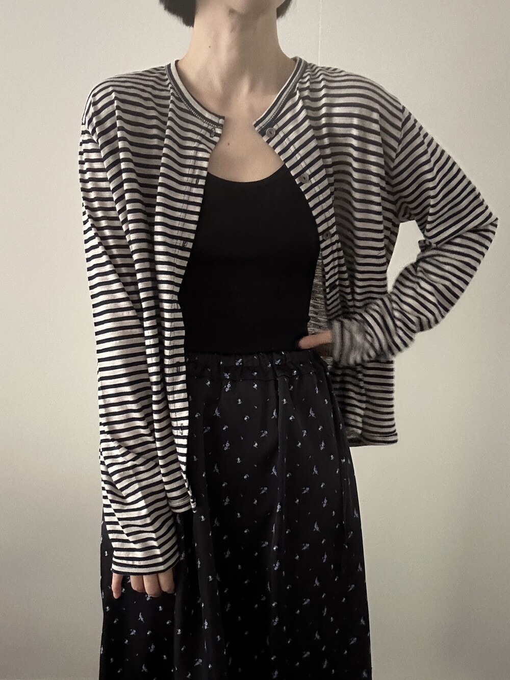 무릎을 살짝 덮는 적당한 미디 기장에 밑단으로 갈수록 퍼지는 A라인 실루엣이 하체 라인을 자연스럽게 커버하며 여성스러운 분위기를 줍니다.