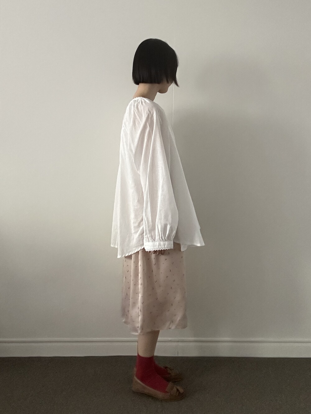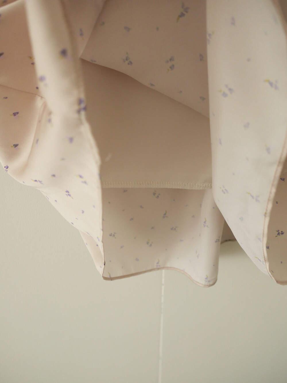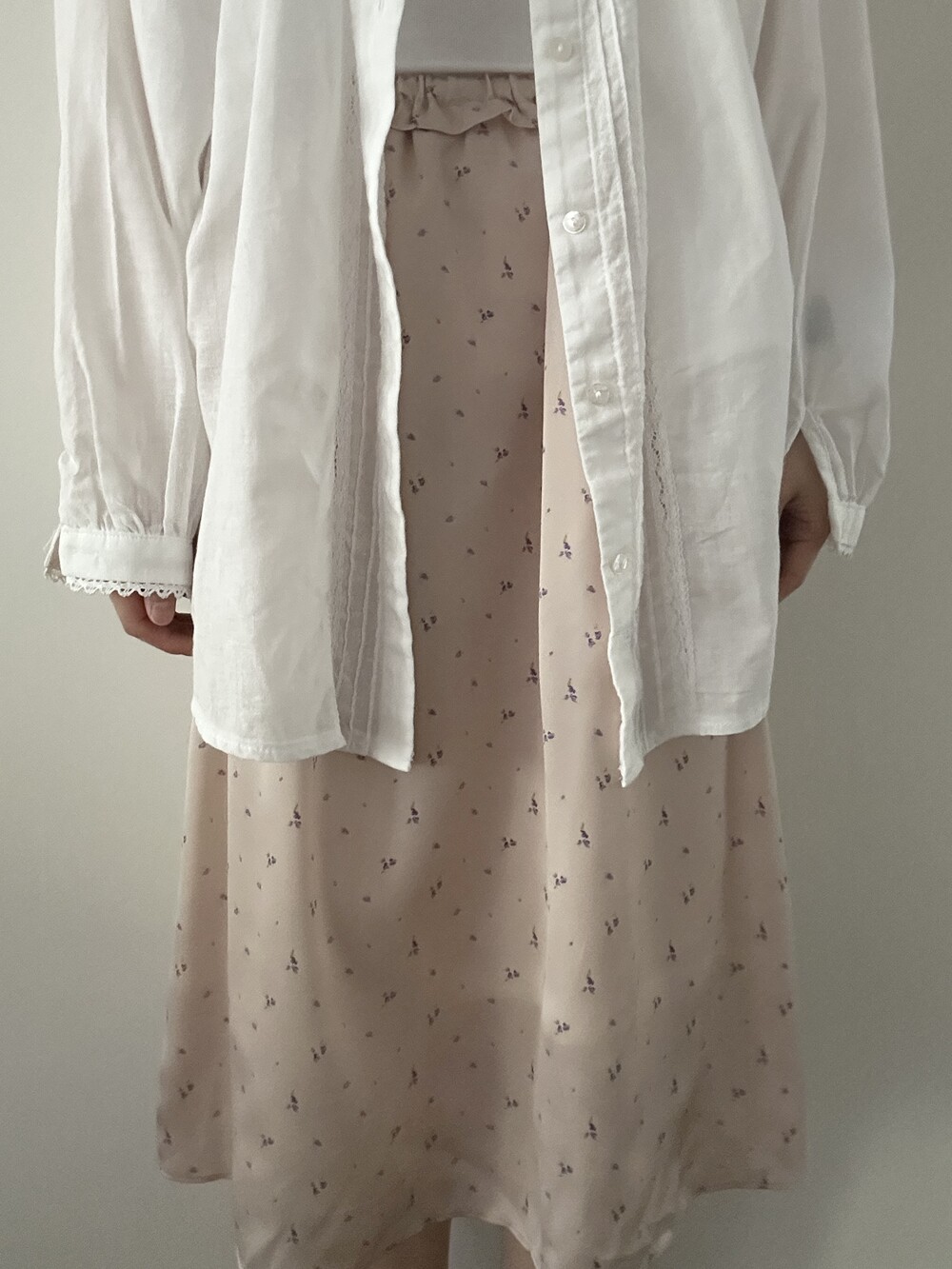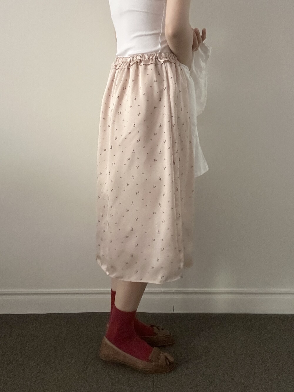 차분한 플라워 패턴과 허리 라인의 프릴 포인트가 조화로워, 심플한 상의와 매치해도 충분히 사랑스러운 룩을 완성해 줍니다.