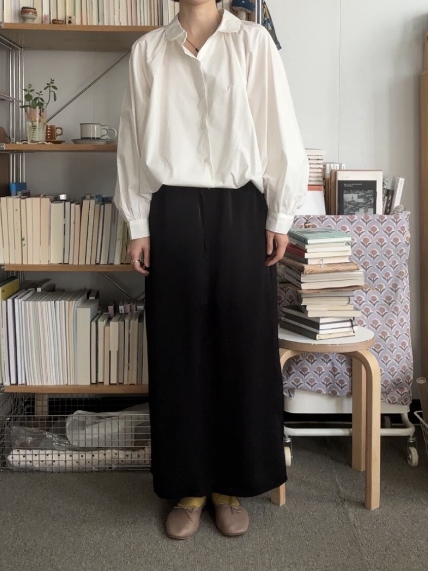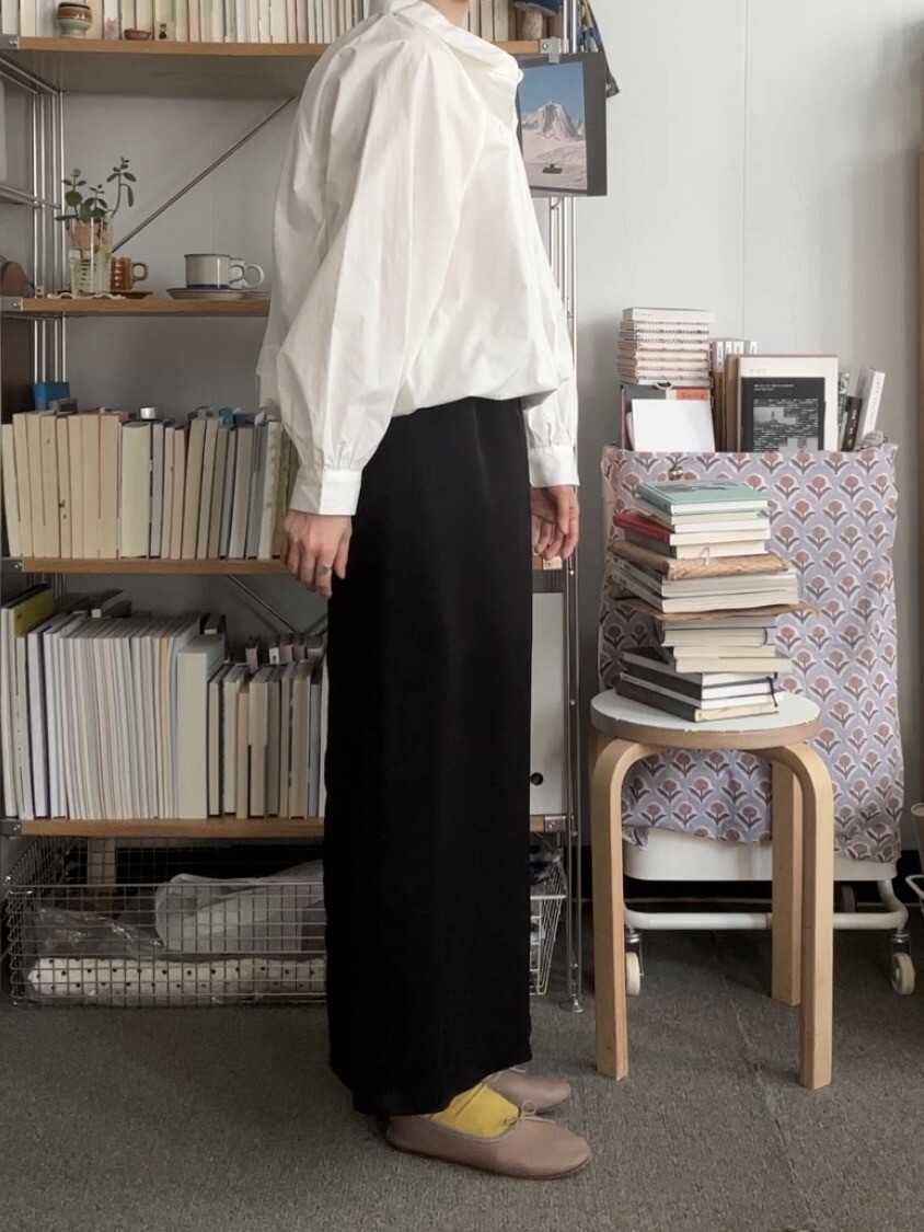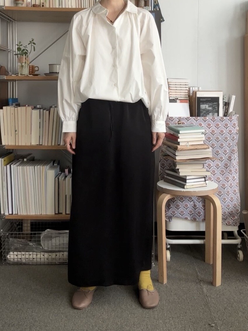 두께감이 있는 니트와 믹스매치하여 소재의 대비를 즐기거나, 심플한 블라우스나 셔츠와 매치하기 좋습니다. 또한 가벼운 티셔츠 한 장에도 드레스업한 느낌을 주는 기특한 스커트입니다.