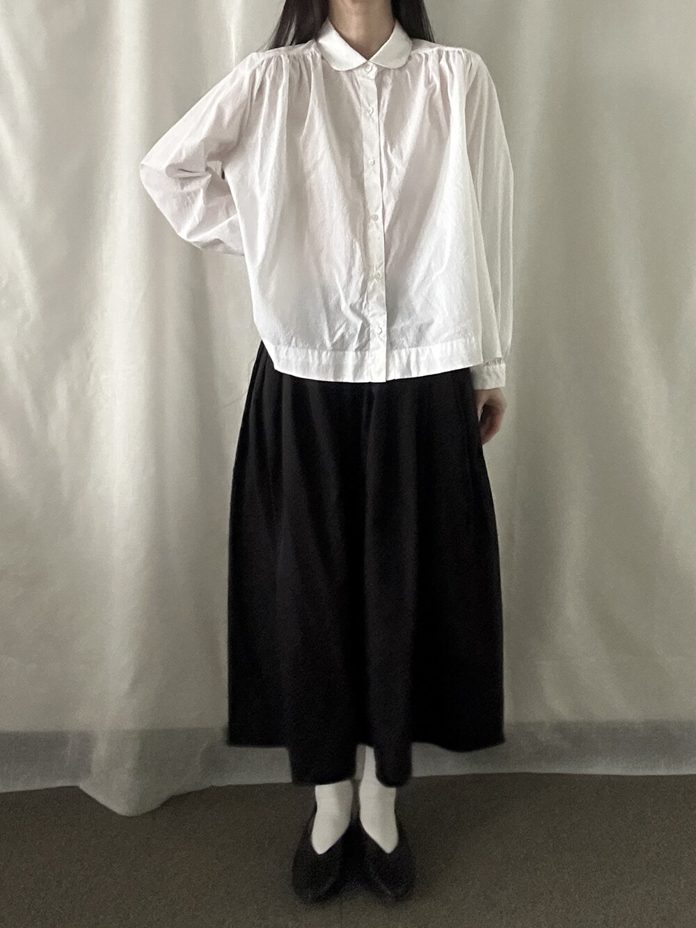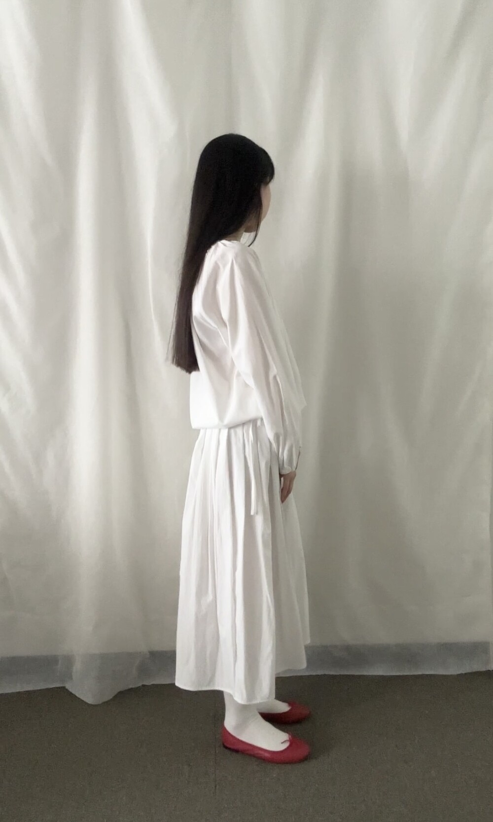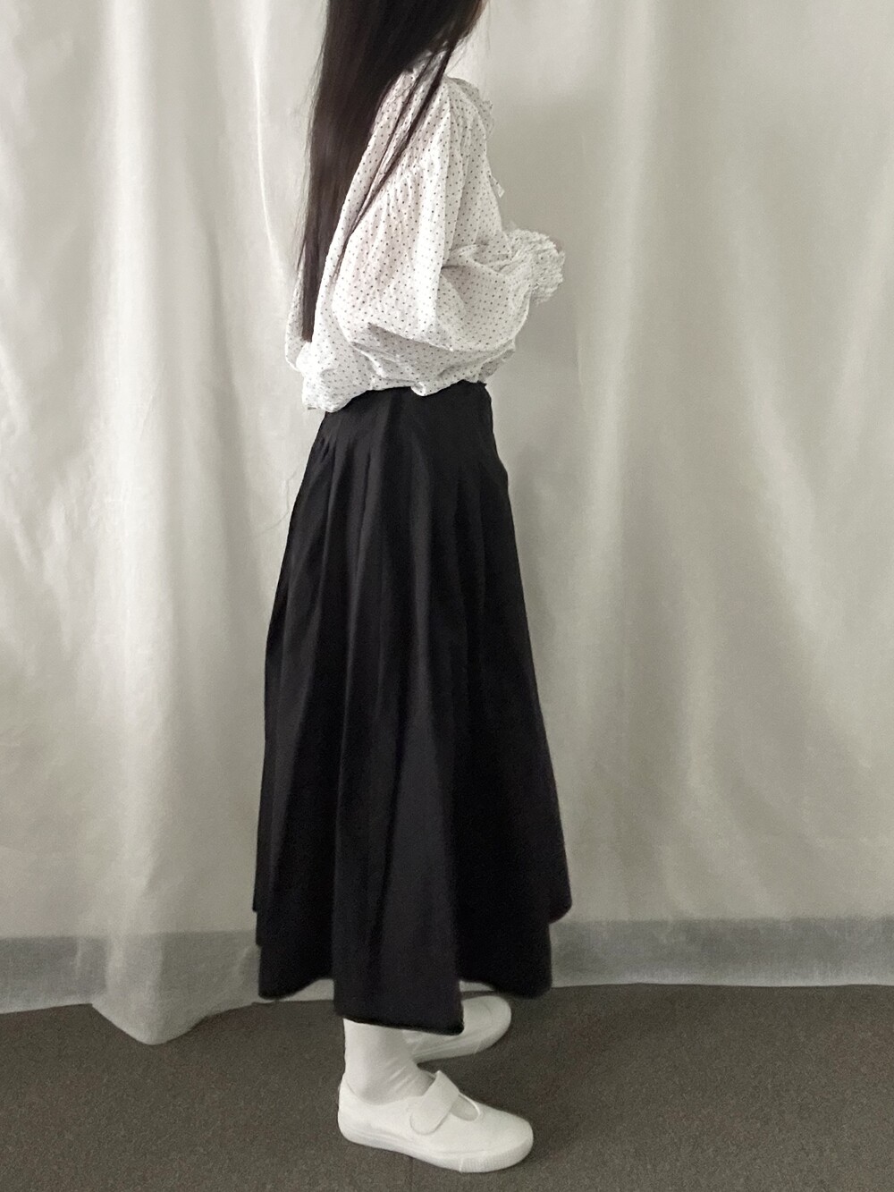 골반 라인까지 핀턱 라인을 따라 스티치로 눌러주어 전체적으로 붕 뜨는 걸 방지해 주고 밑단으로 갈수록 퍼지는 프린세스 라인이 참 예쁜 스커트입니다.