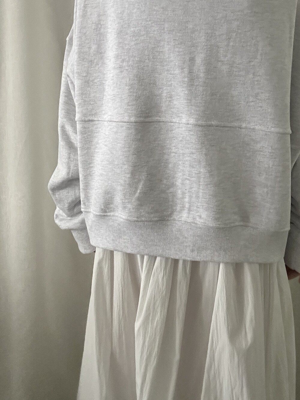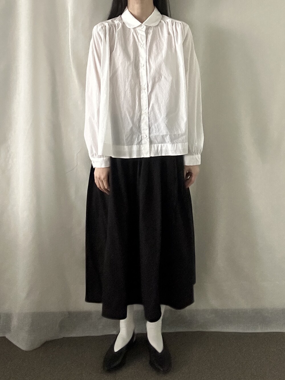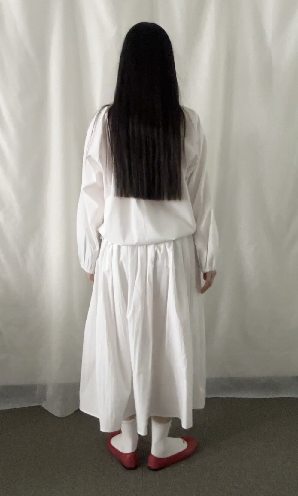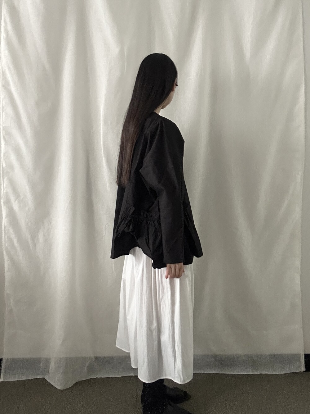 골반 라인까지 핀턱 라인을 따라 스티치로 눌러주어 전체적으로 붕 뜨는 걸 방지해 주고 밑단으로 갈수록 퍼지는 프린세스 라인이 참 예쁜 스커트입니다.