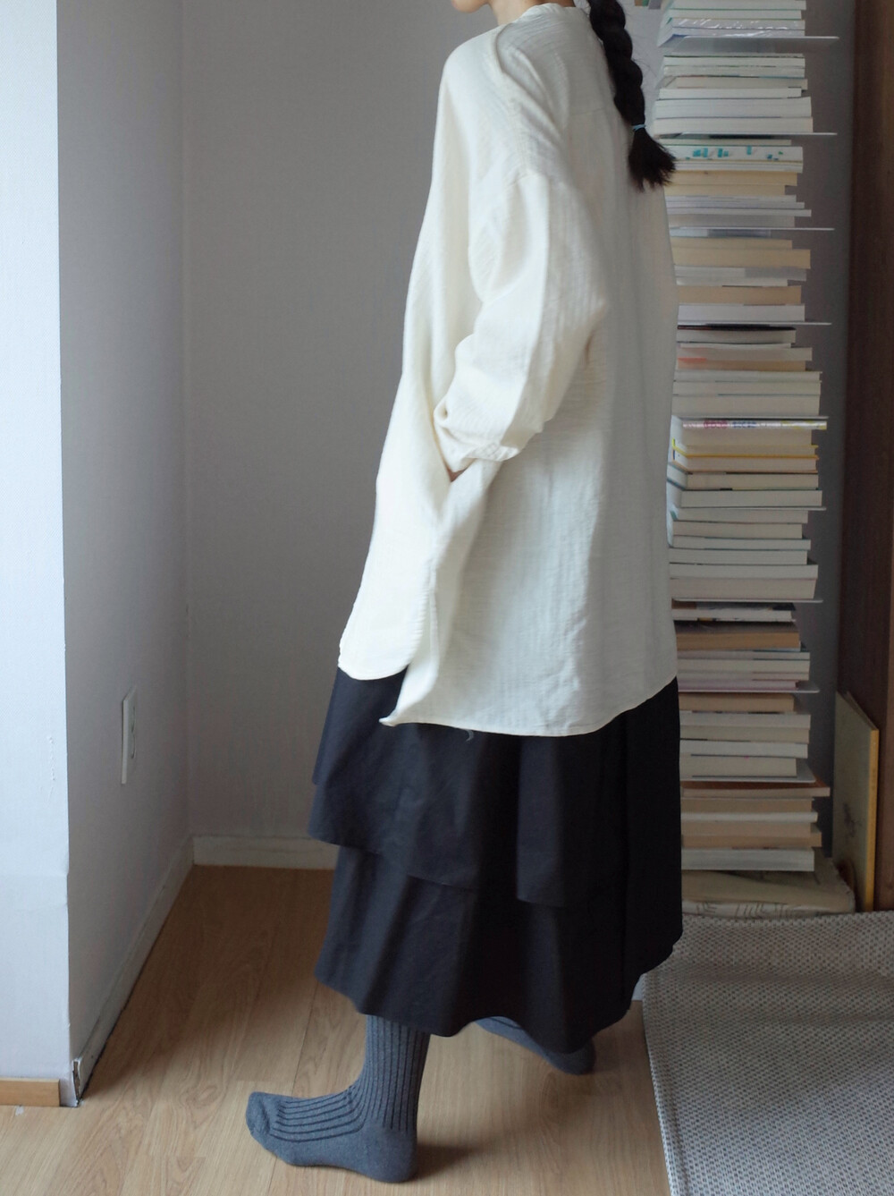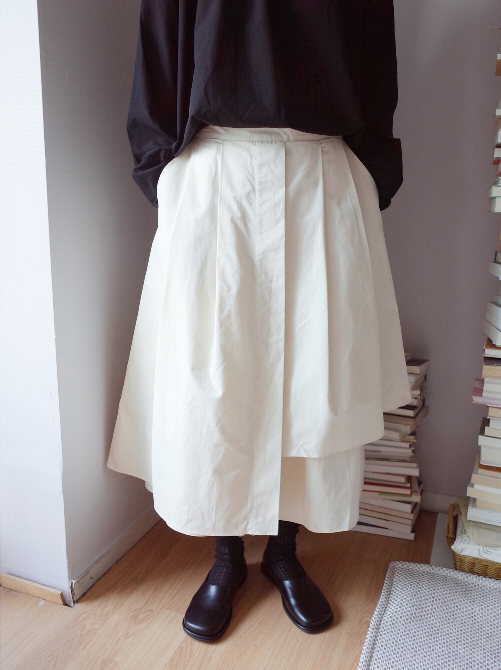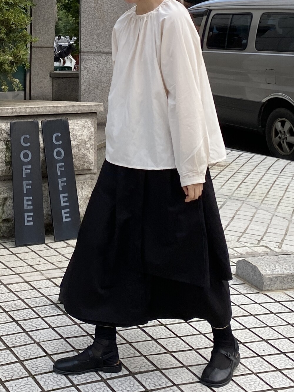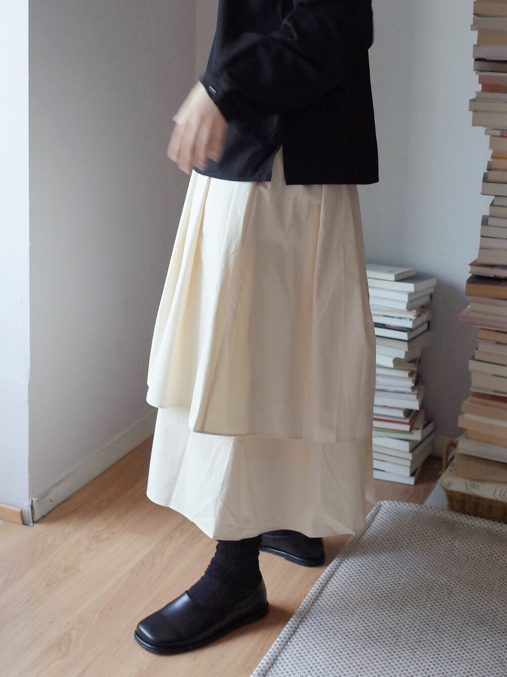 앞뒤 언발란스한 디자인과 다른 길이감의 티어드 스커트로 아방가르드한 무드를 느낄 수 있습니다.이중으로 디자인이 되어 있어 무게감은 좀 있지만 그만큼 보온성이 좋은 편입니다.