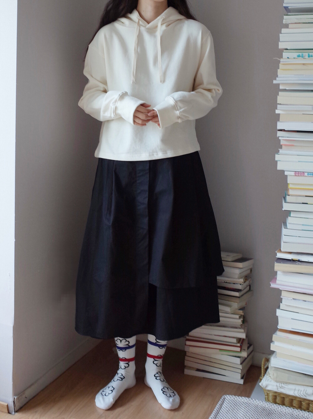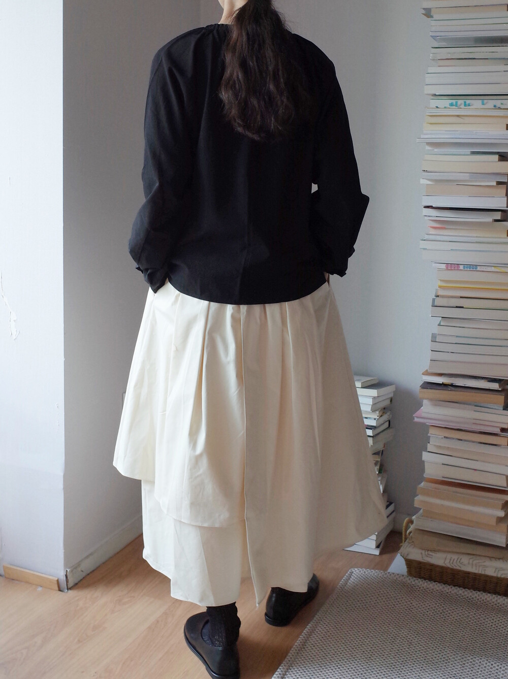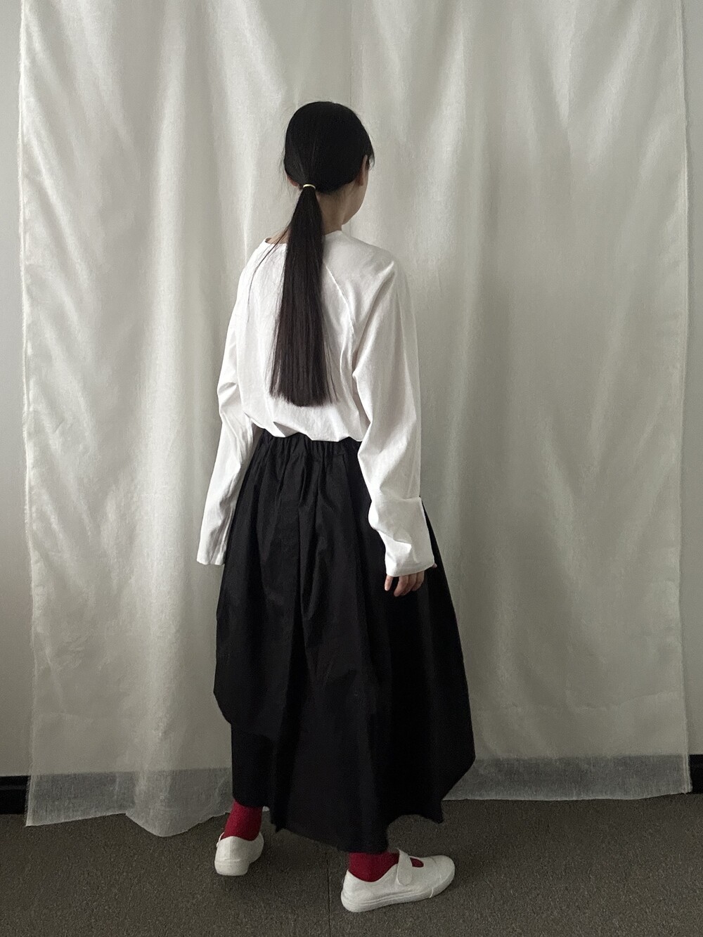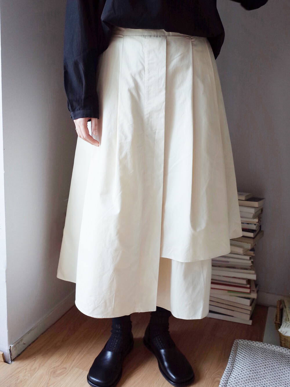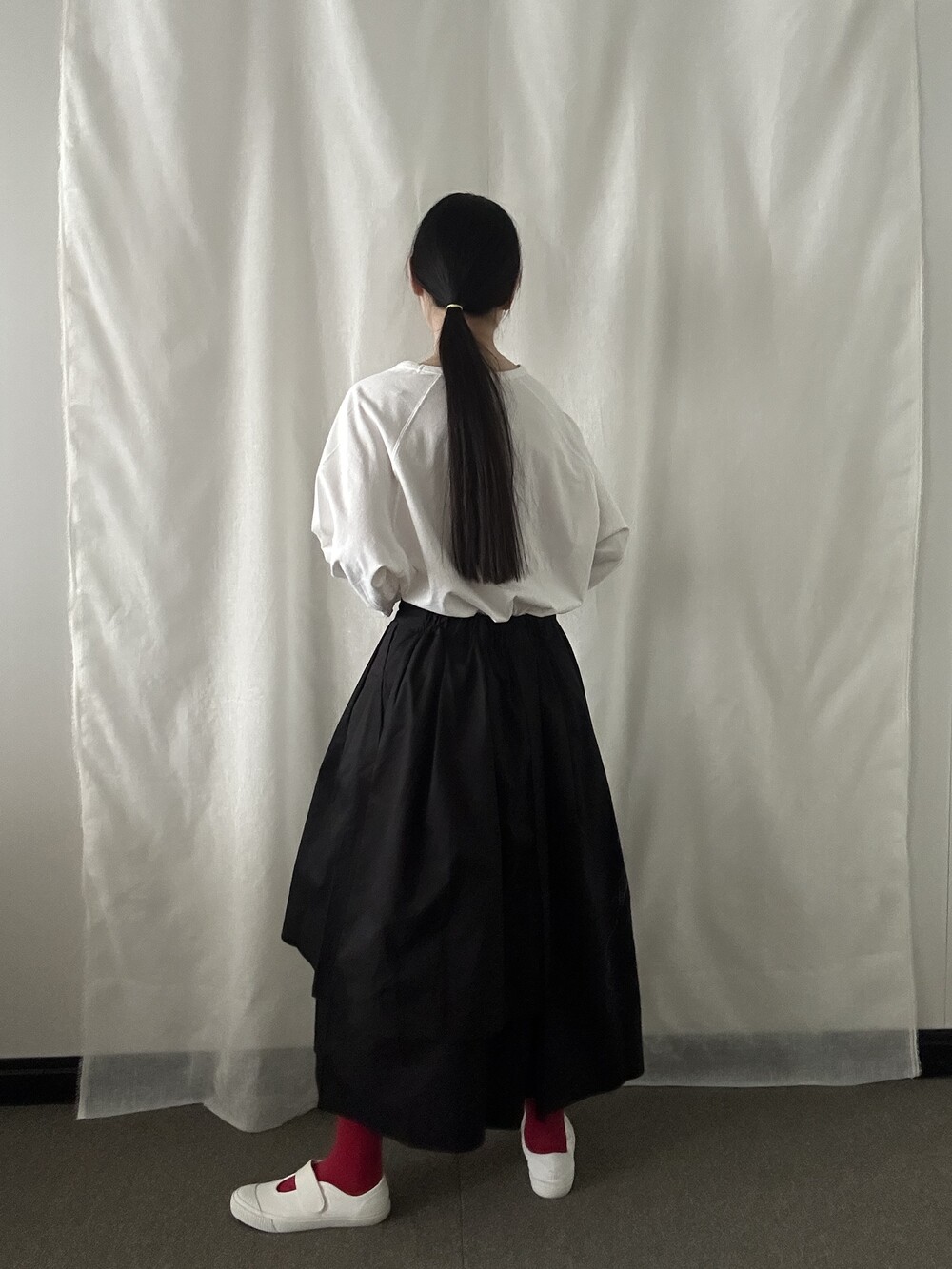 앞뒤 언발란스한 디자인과 다른 길이감의 티어드 스커트로 아방가르드한 무드를 느낄 수 있습니다.이중으로 디자인이 되어 있어 무게감은 좀 있지만 그만큼 보온성이 좋은 편입니다.