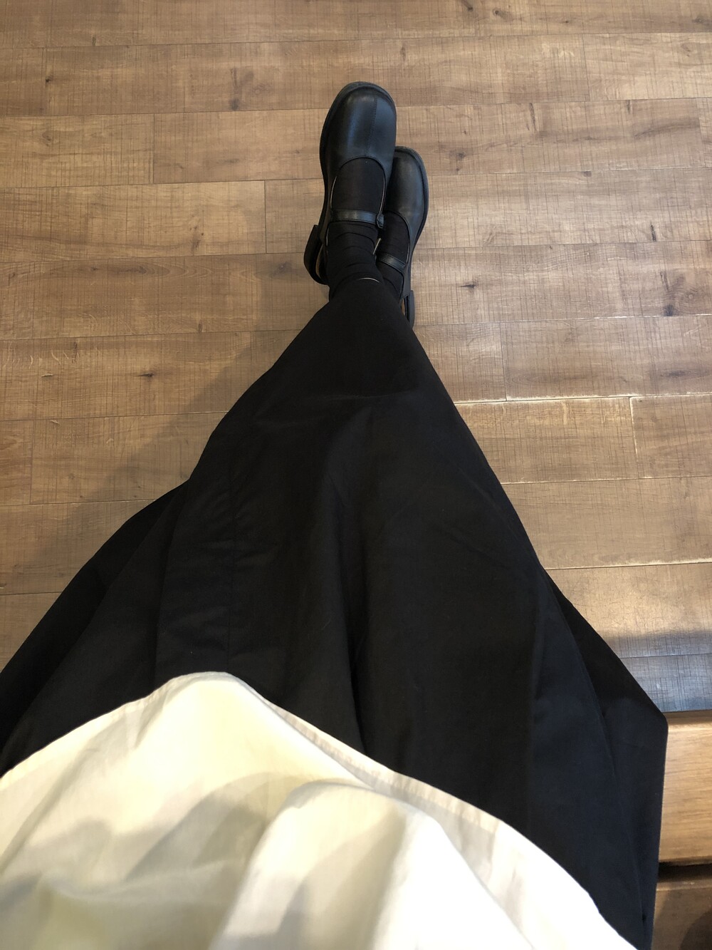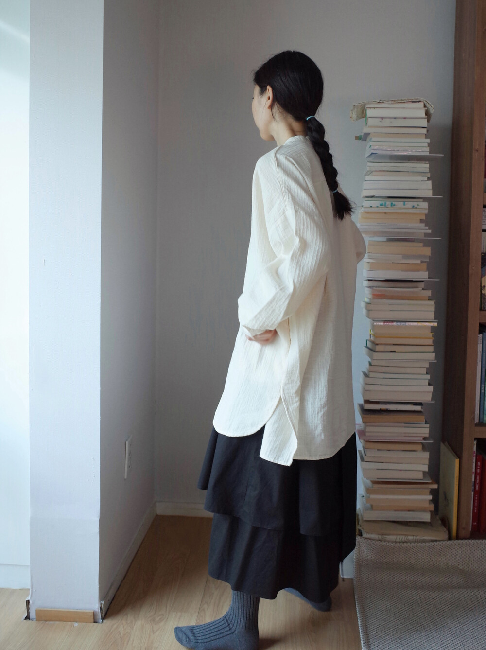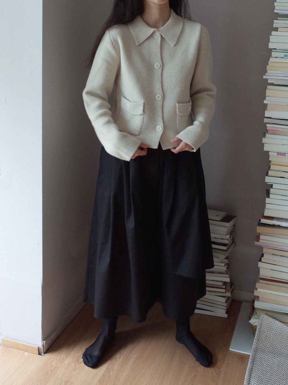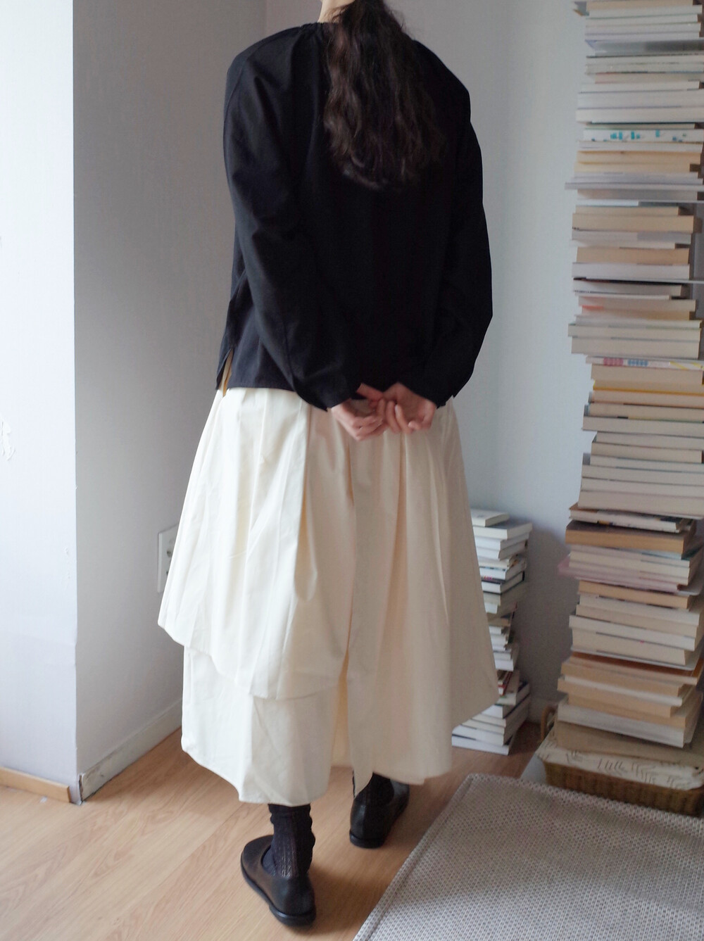 앞뒤 언발란스한 디자인과 다른 길이감의 티어드 스커트로 아방가르드한 무드를 느낄 수 있습니다.이중으로 디자인이 되어 있어 무게감은 좀 있지만 그만큼 보온성이 좋은 편입니다.
