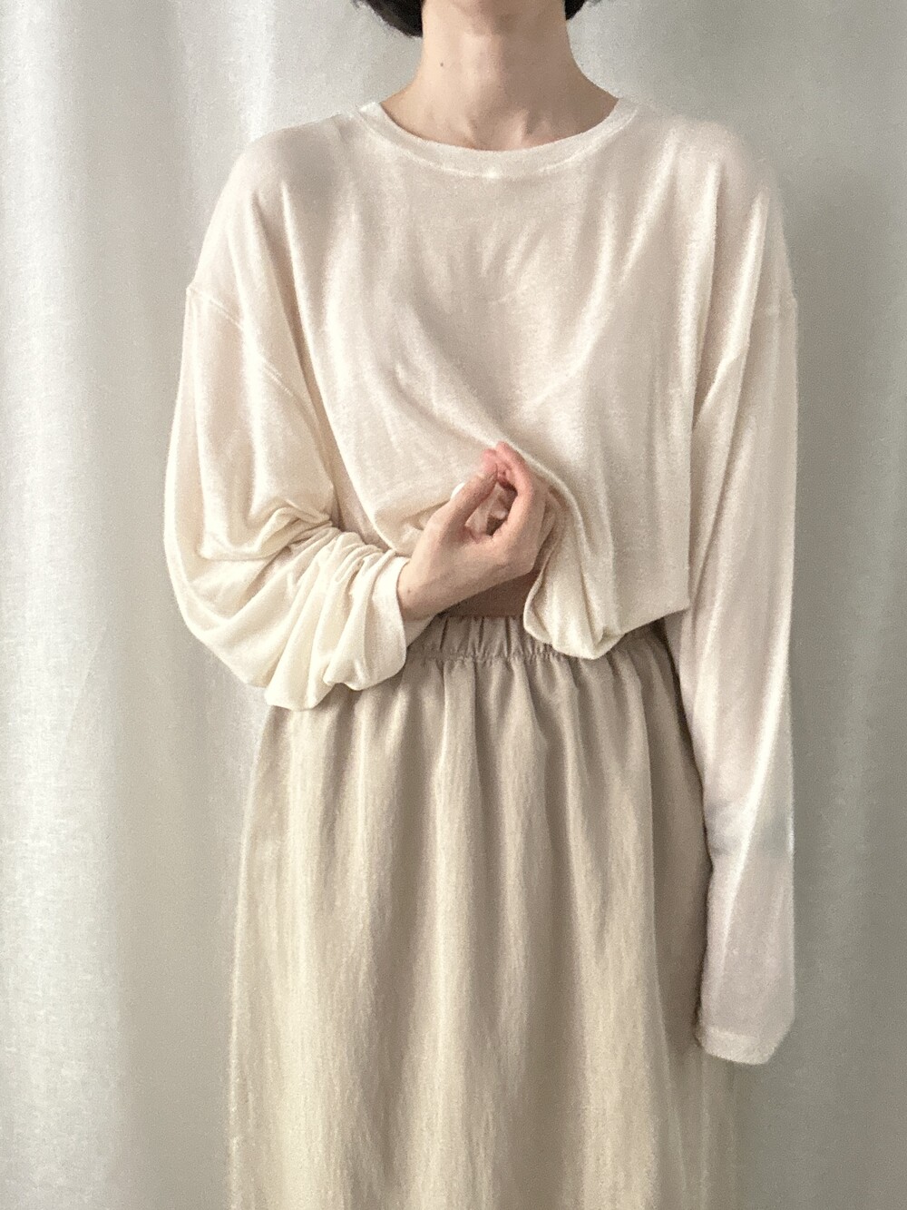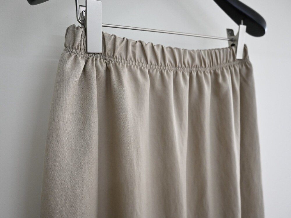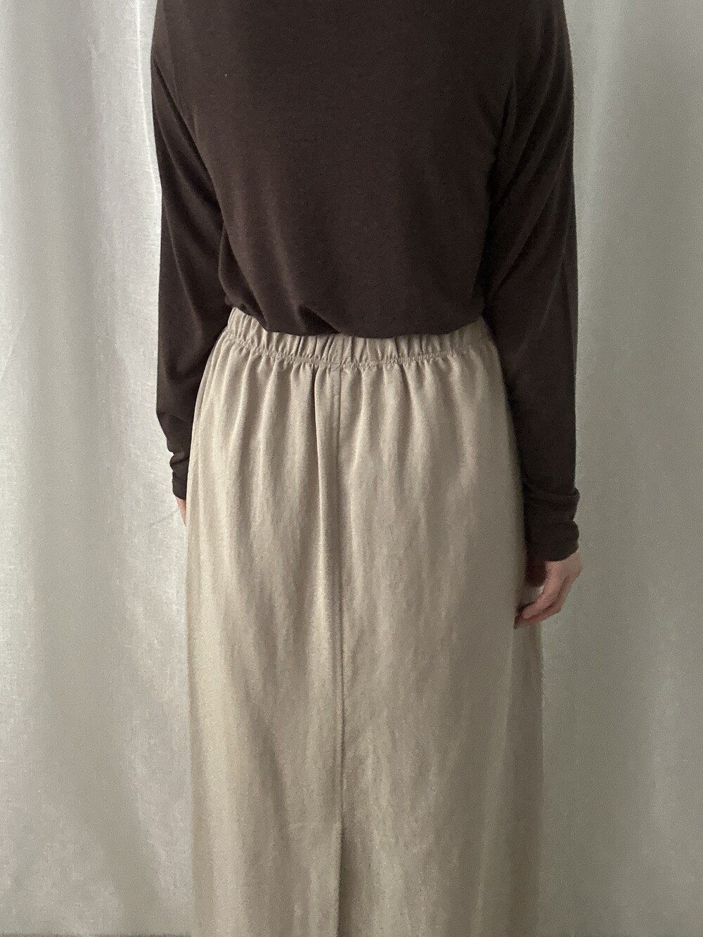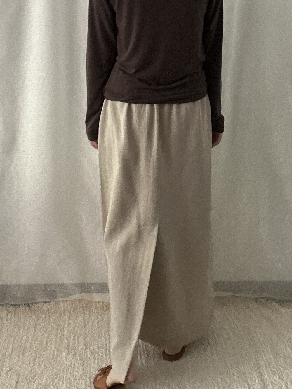 허리는 밴딩으로 되어있어 편안한 착용감은 여성스러운 느낌의 소재감으로 오피스룩까지 자연스럽게 소화합니다. 가벼운 라이오셀 혼방 소재와 조이지 않는 허리 밴딩으로 어디서나 편안하면서도 고급스러운 분위기를 연출할 수 있는 스커트입니다. 실키한 드레이프와 자연스러운 광택감이 롱기장의 스커트 디자인과 잘 어울리고 뒤트임이 있어 움직임이 편안합니다.