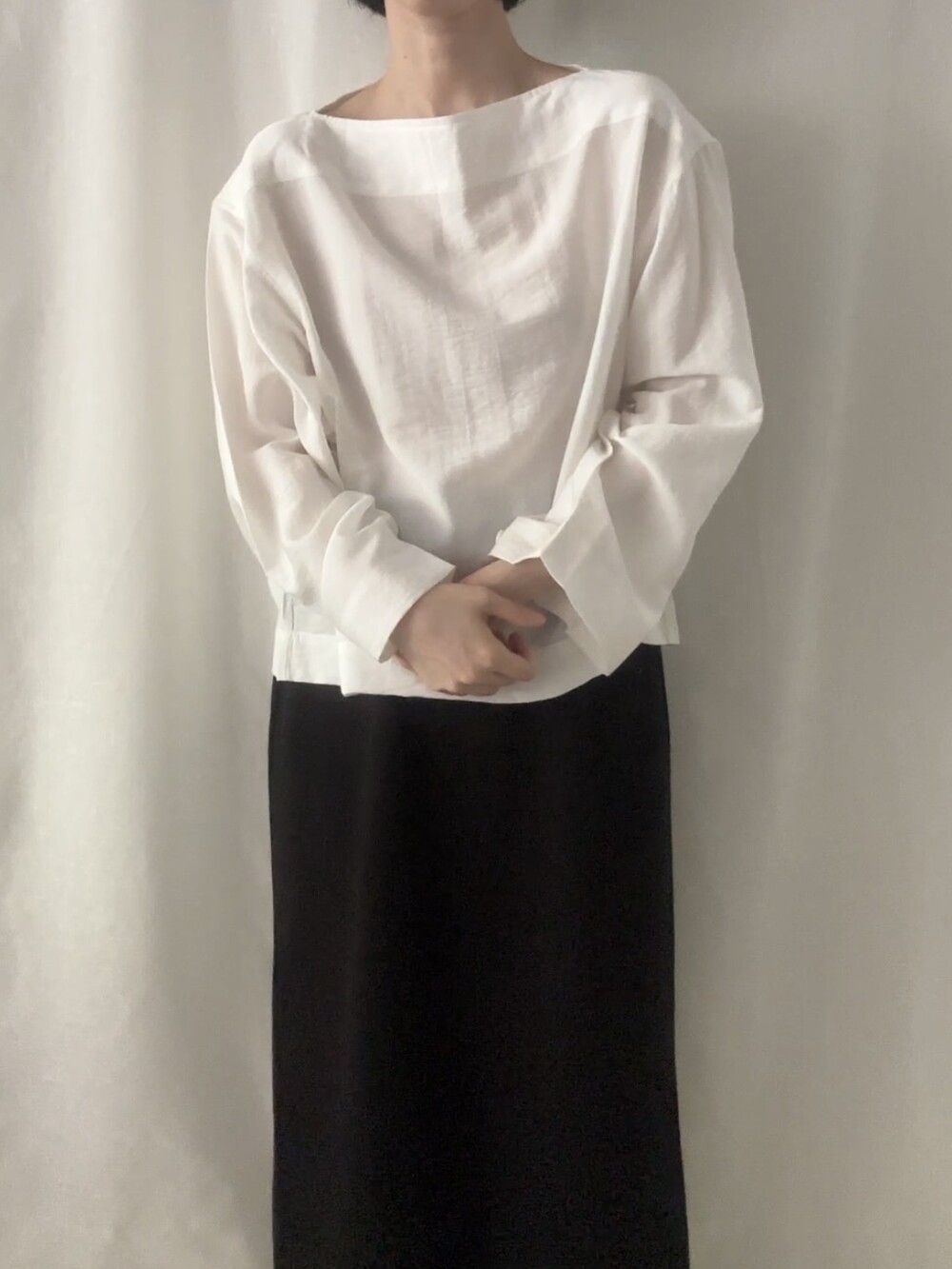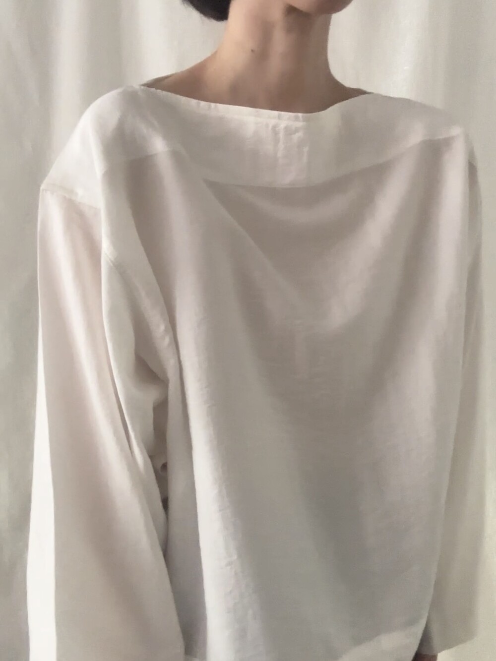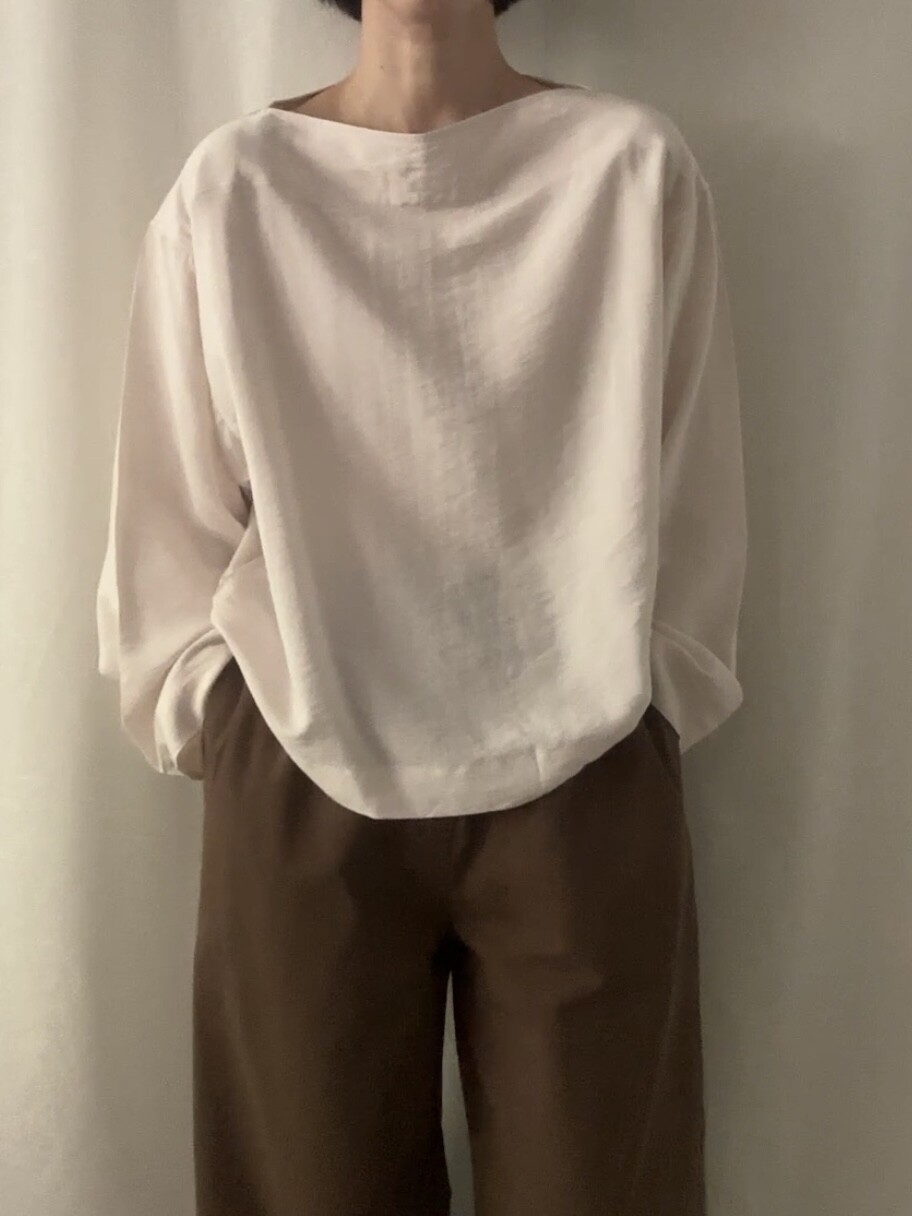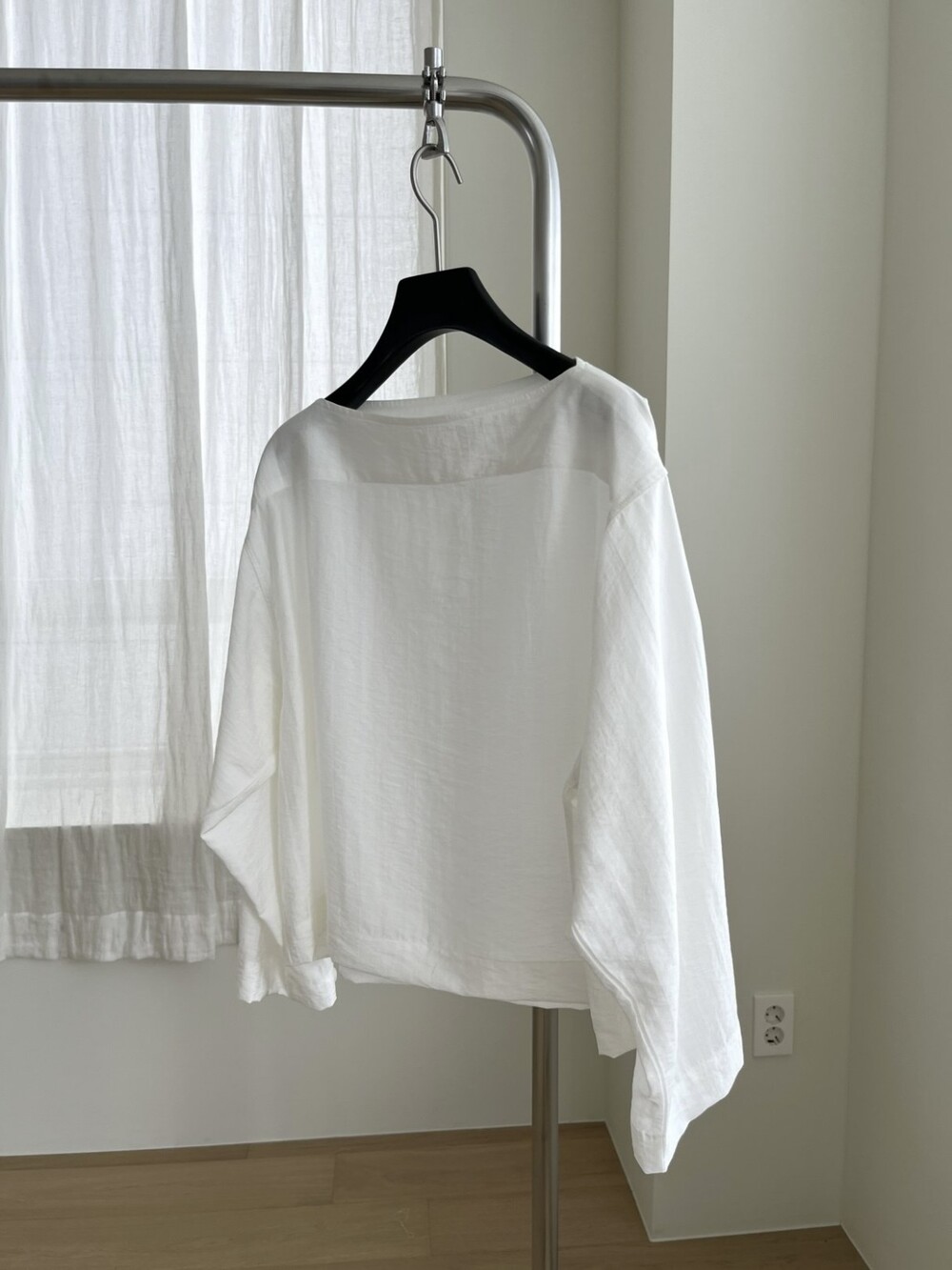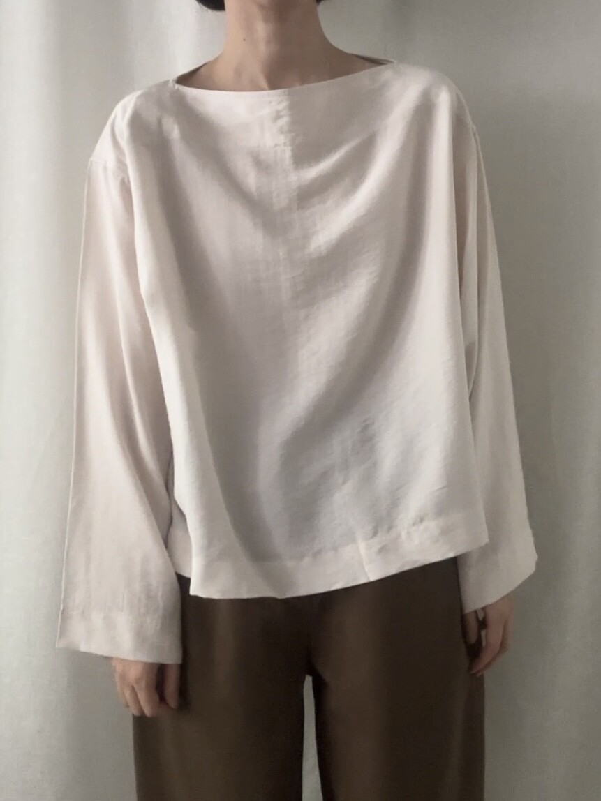 보트넥 디자인이 멋스럽고 고급스러운 블라우스입니다. 텐셀, 레이온 혼방의 얇고 쉬어한 소재가 시원해 보이고 넥 라인이 자연스럽게 드레이핑 되어 유니크합니다. 전체적으로 여유 있는 사이즈에 길이감도 적당해 하의에 넣거나 넣지 않아도 어색함이 없습니다.