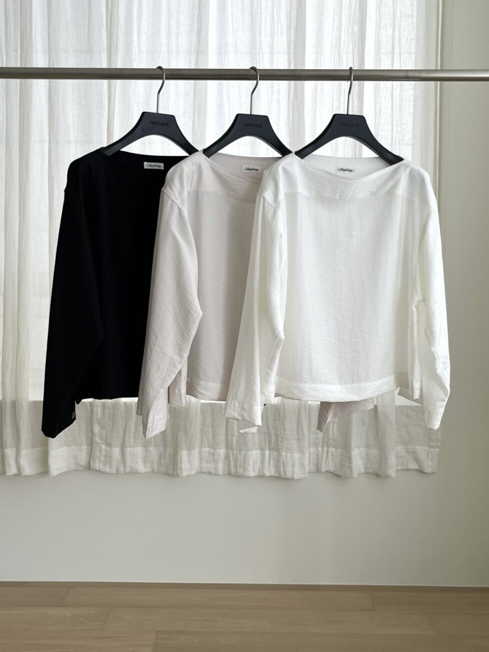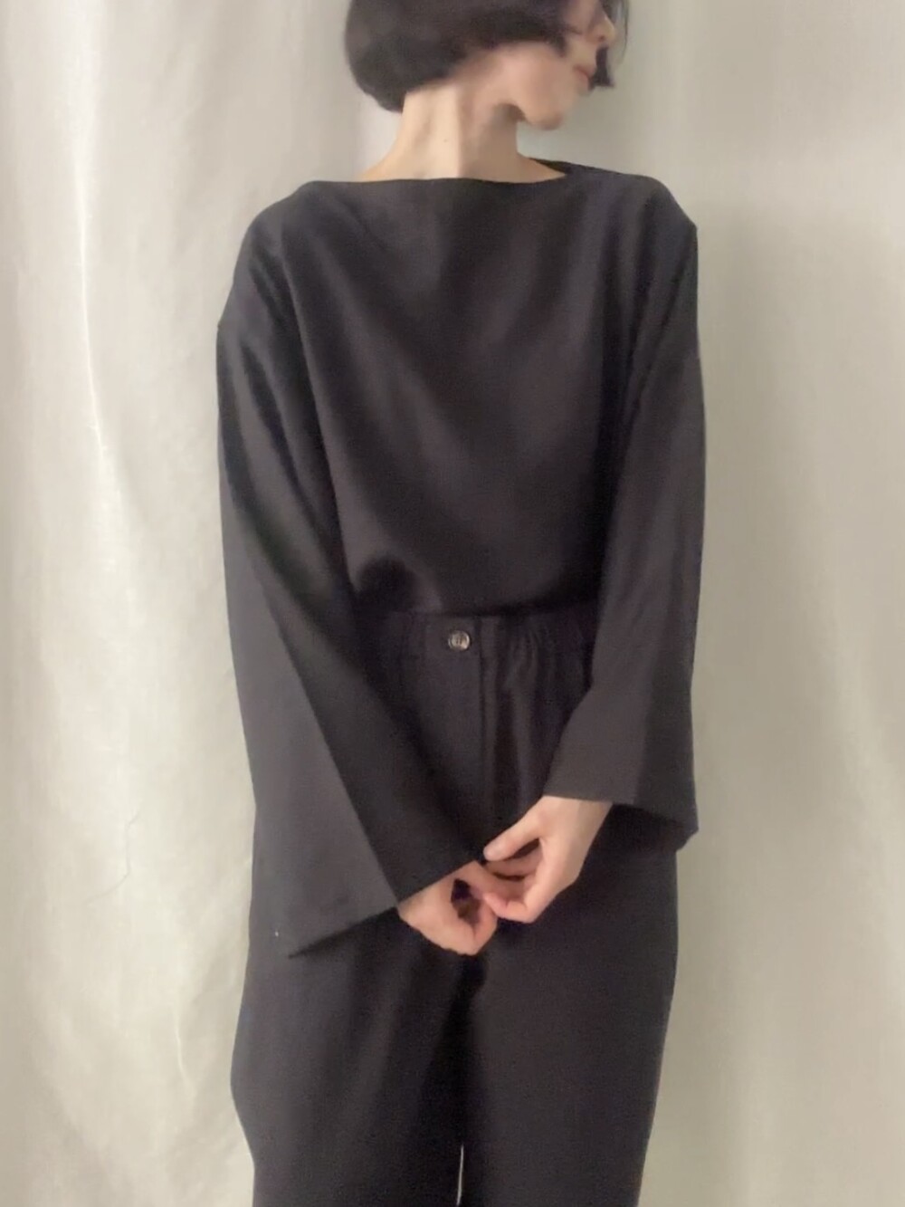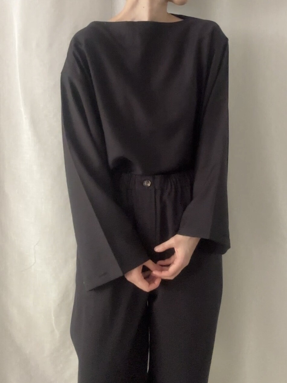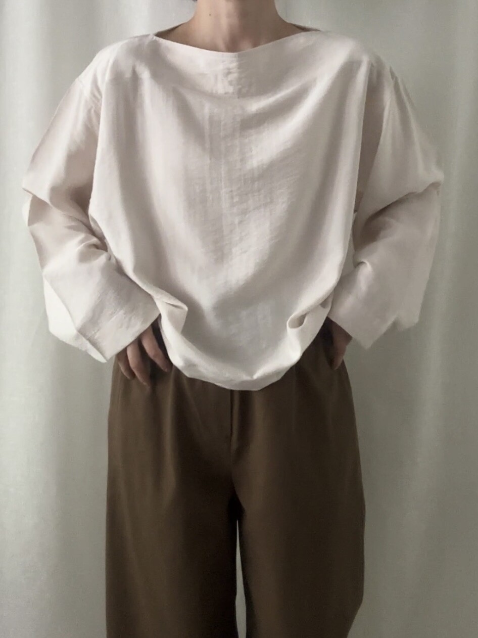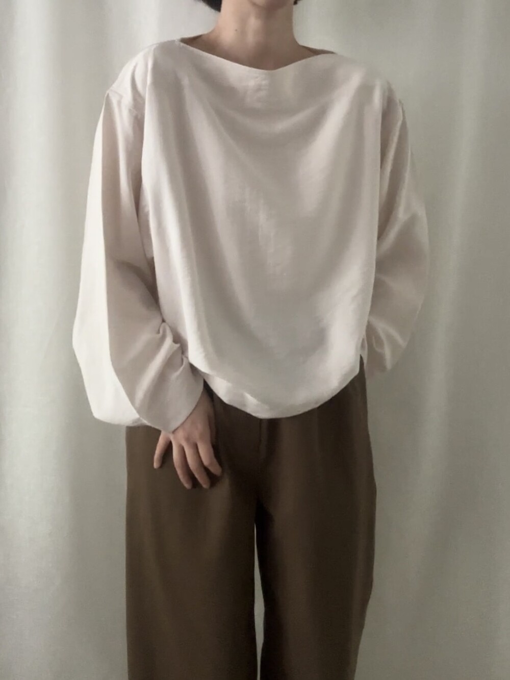보트넥 디자인이 멋스럽고 고급스러운 블라우스입니다. 텐셀, 레이온 혼방의 얇고 쉬어한 소재가 시원해 보이고 넥 라인이 자연스럽게 드레이핑 되어 유니크합니다. 전체적으로 여유 있는 사이즈에 길이감도 적당해 하의에 넣거나 넣지 않아도 어색함이 없습니다.