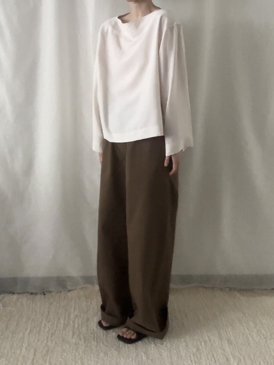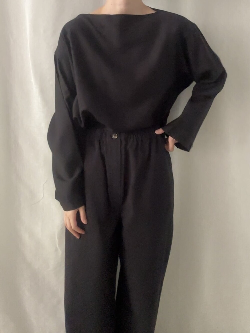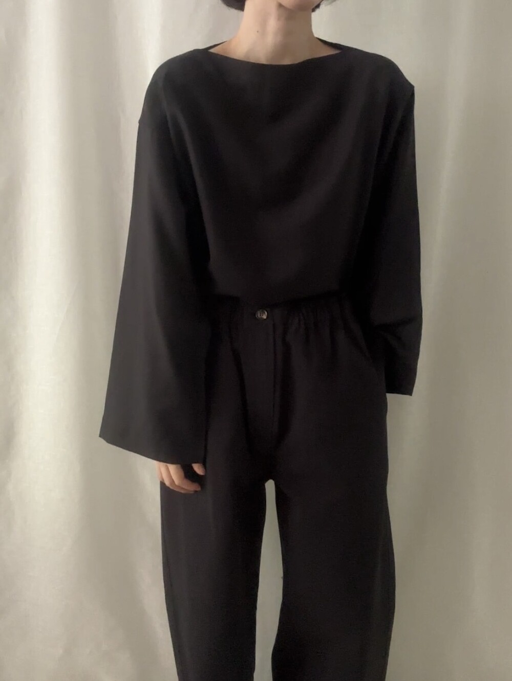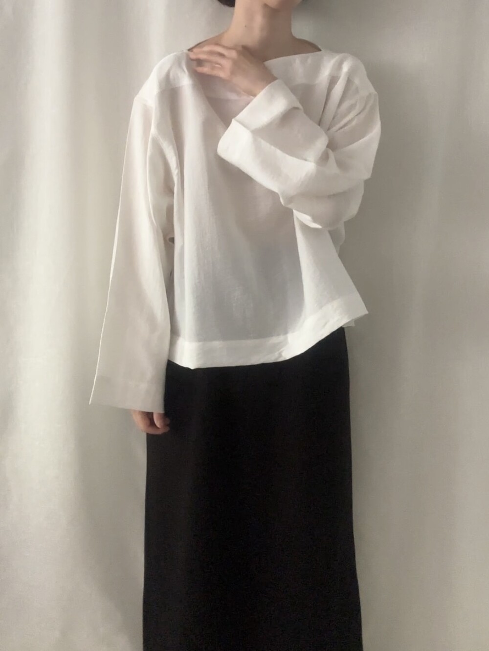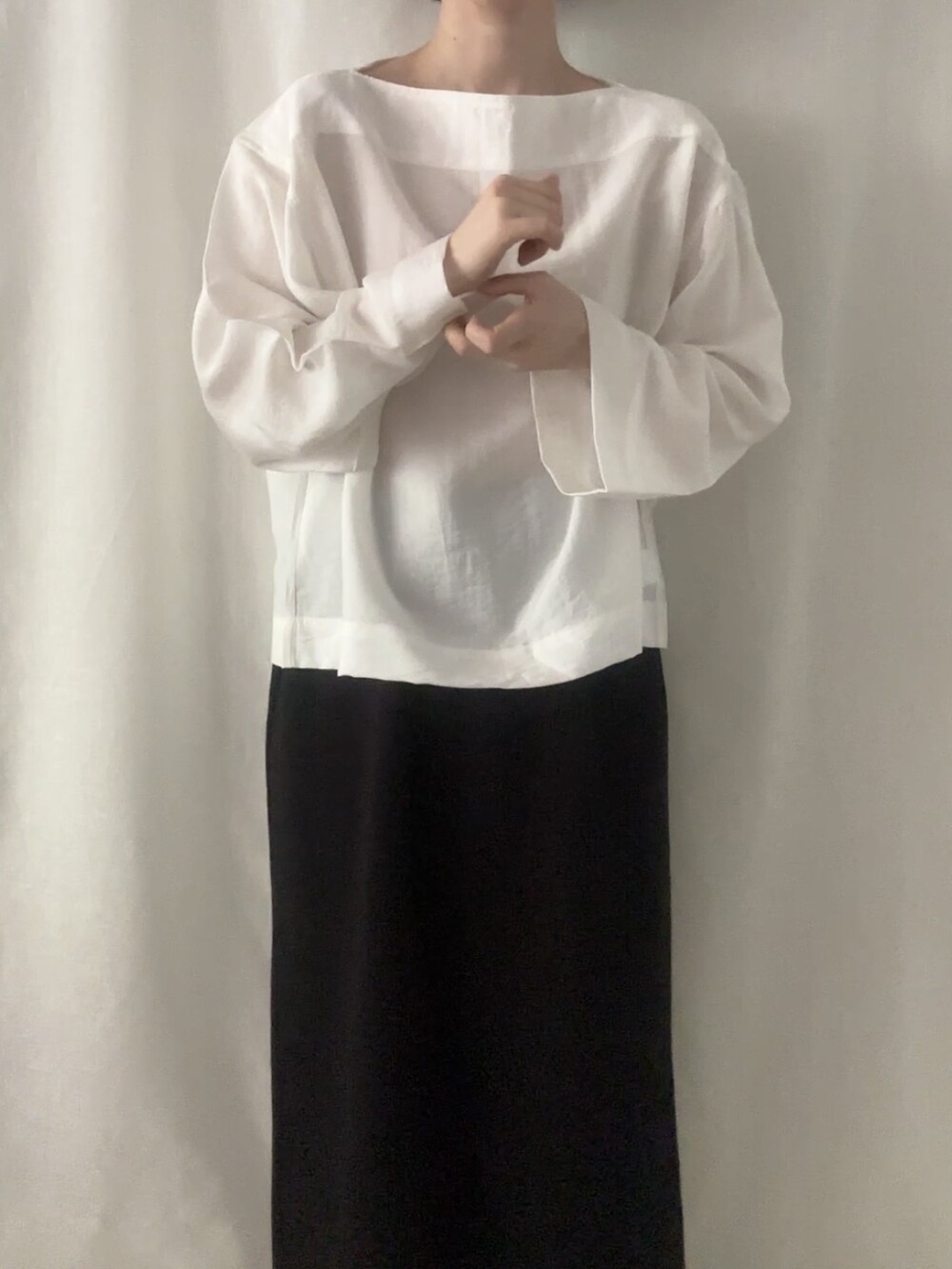 보트넥 디자인이 멋스럽고 고급스러운 블라우스입니다. 텐셀, 레이온 혼방의 얇고 쉬어한 소재가 시원해 보이고 넥 라인이 자연스럽게 드레이핑 되어 유니크합니다. 전체적으로 여유 있는 사이즈에 길이감도 적당해 하의에 넣거나 넣지 않아도 어색함이 없습니다.