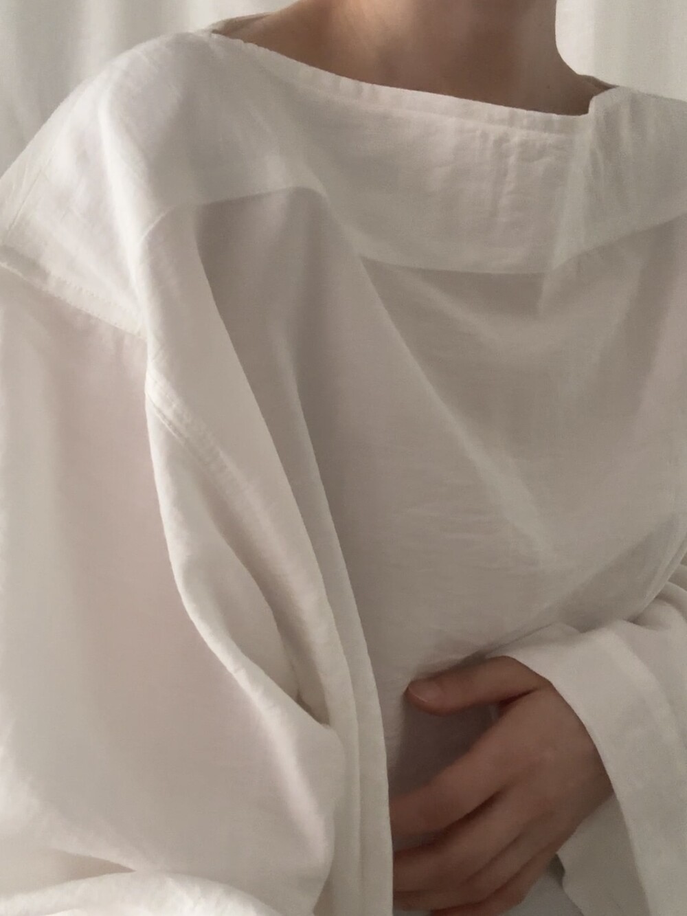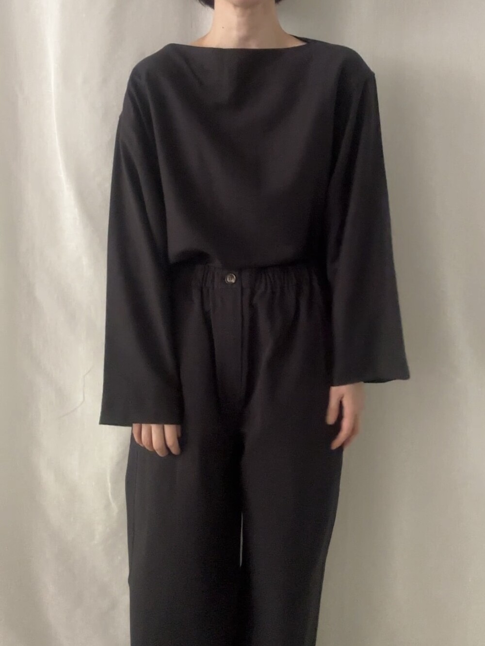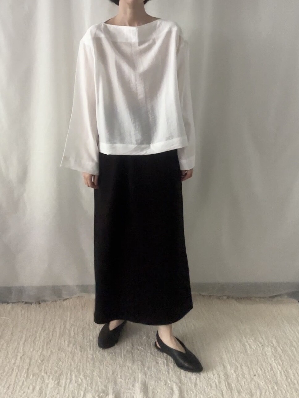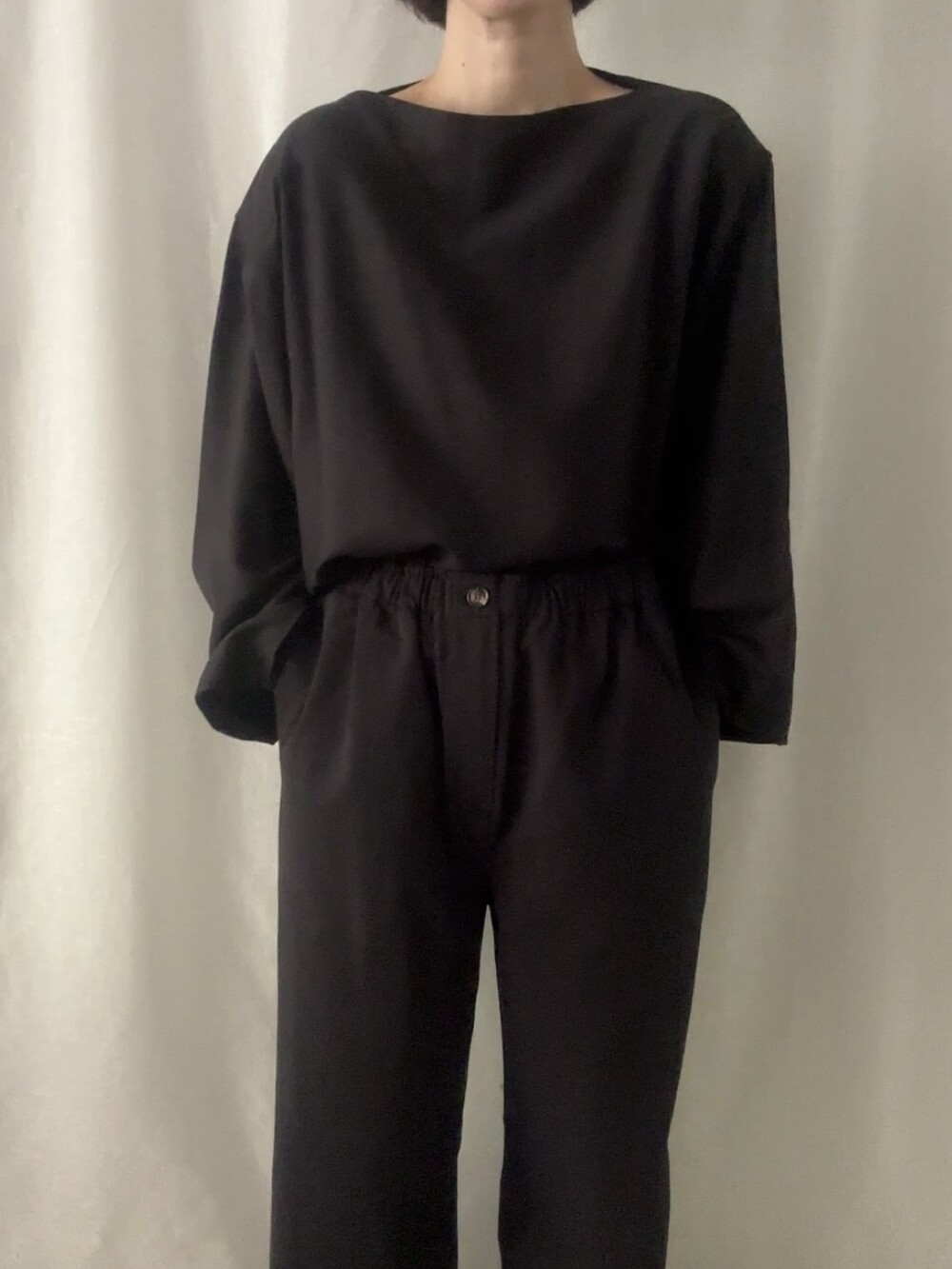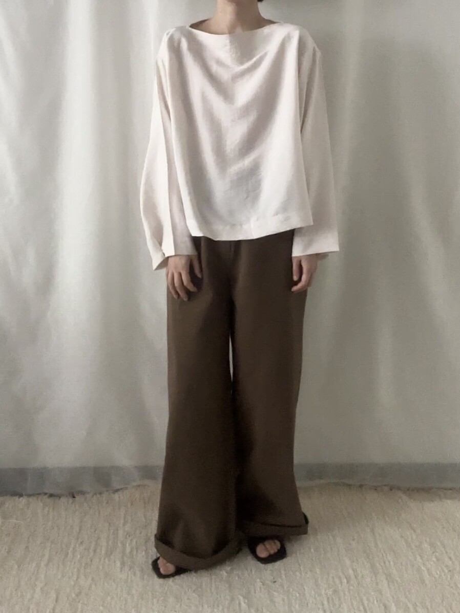 보트넥 디자인이 멋스럽고 고급스러운 블라우스입니다. 텐셀, 레이온 혼방의 얇고 쉬어한 소재가 시원해 보이고 넥 라인이 자연스럽게 드레이핑 되어 유니크합니다. 전체적으로 여유 있는 사이즈에 길이감도 적당해 하의에 넣거나 넣지 않아도 어색함이 없습니다.