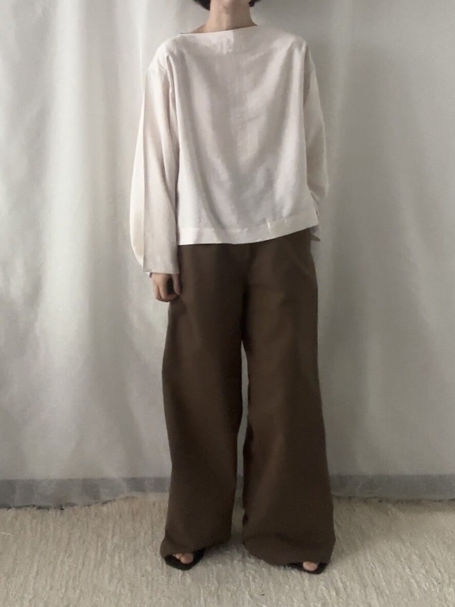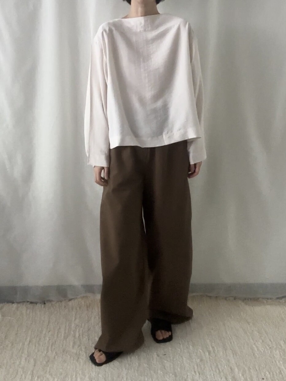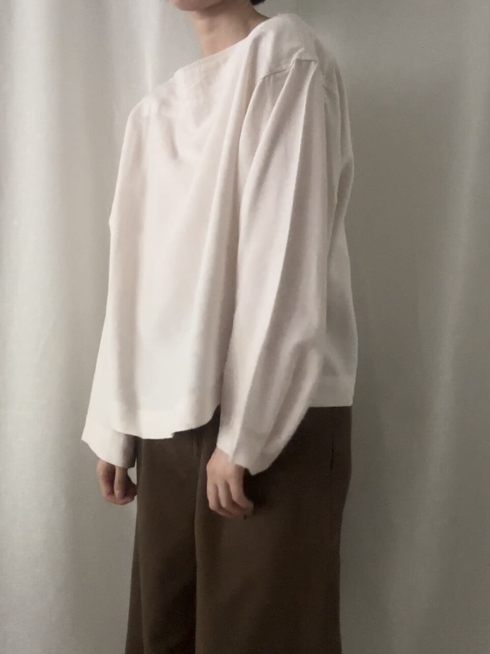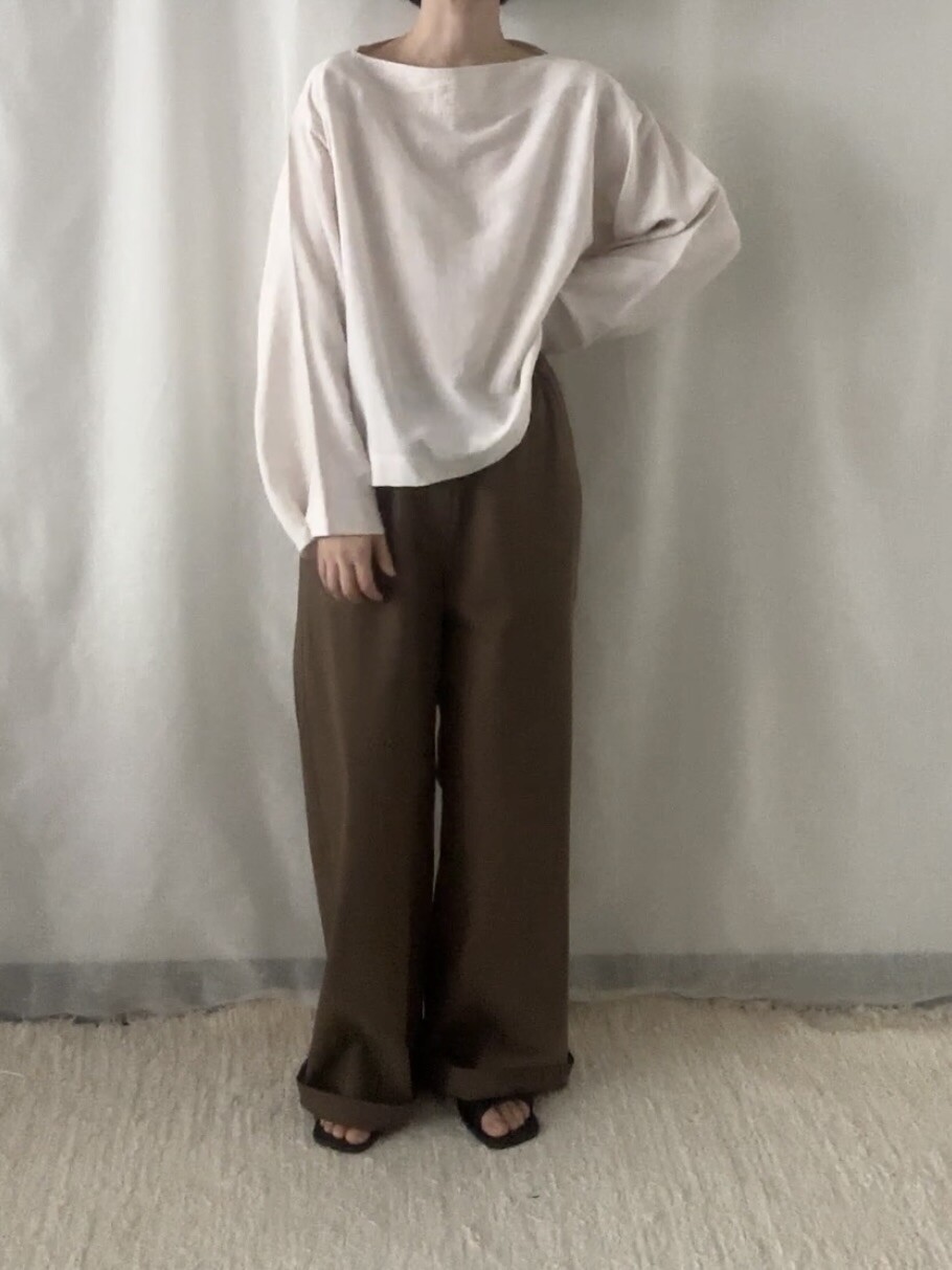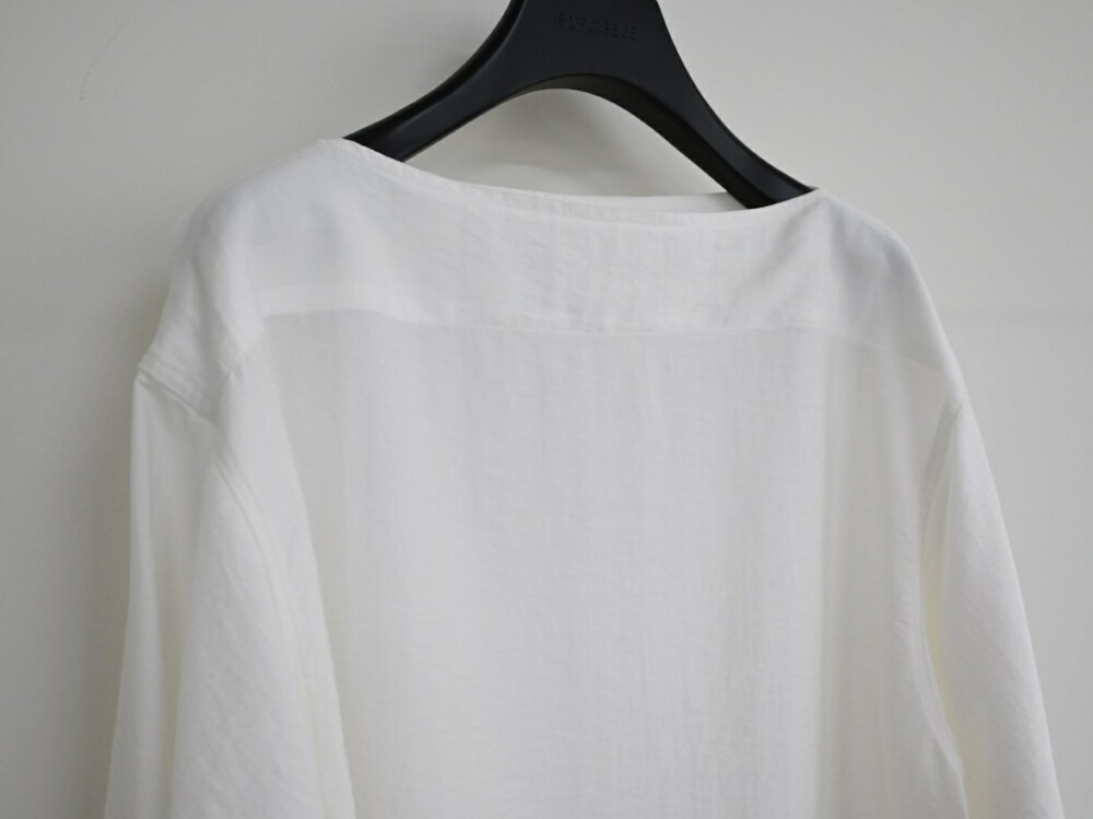 보트넥 디자인이 멋스럽고 고급스러운 블라우스입니다. 텐셀, 레이온 혼방의 얇고 쉬어한 소재가 시원해 보이고 넥 라인이 자연스럽게 드레이핑 되어 유니크합니다. 전체적으로 여유 있는 사이즈에 길이감도 적당해 하의에 넣거나 넣지 않아도 어색함이 없습니다.