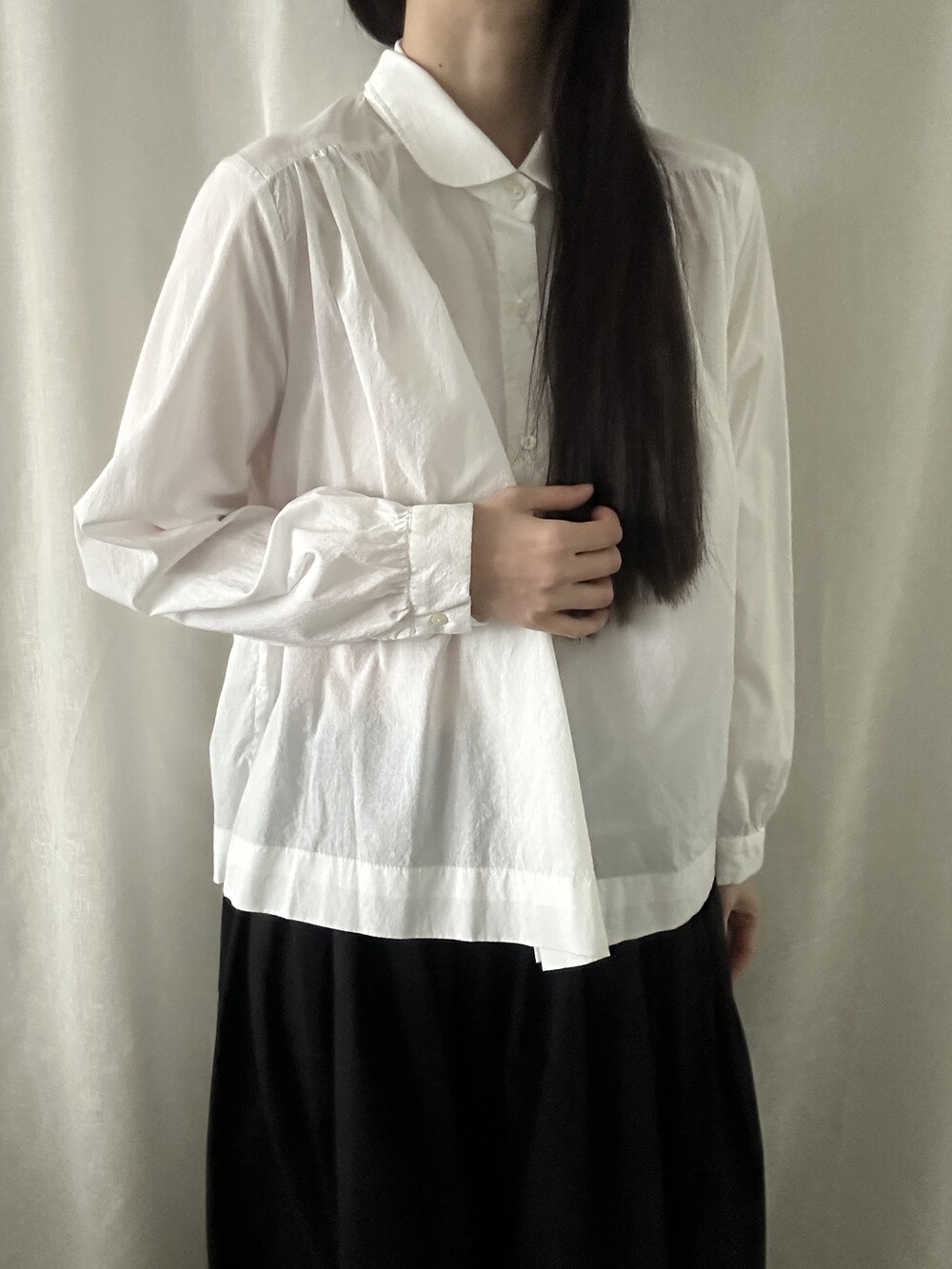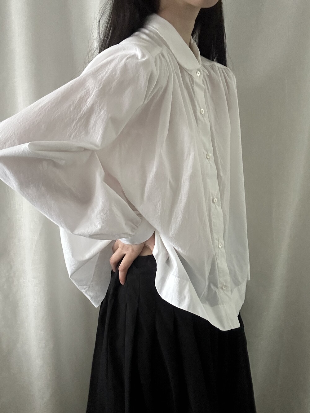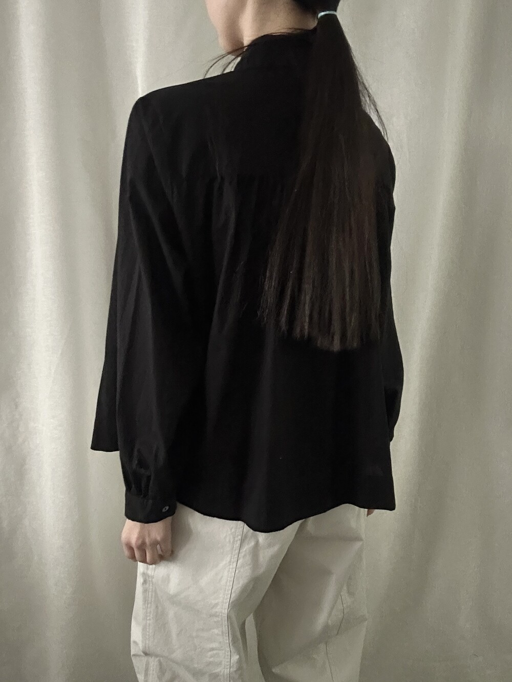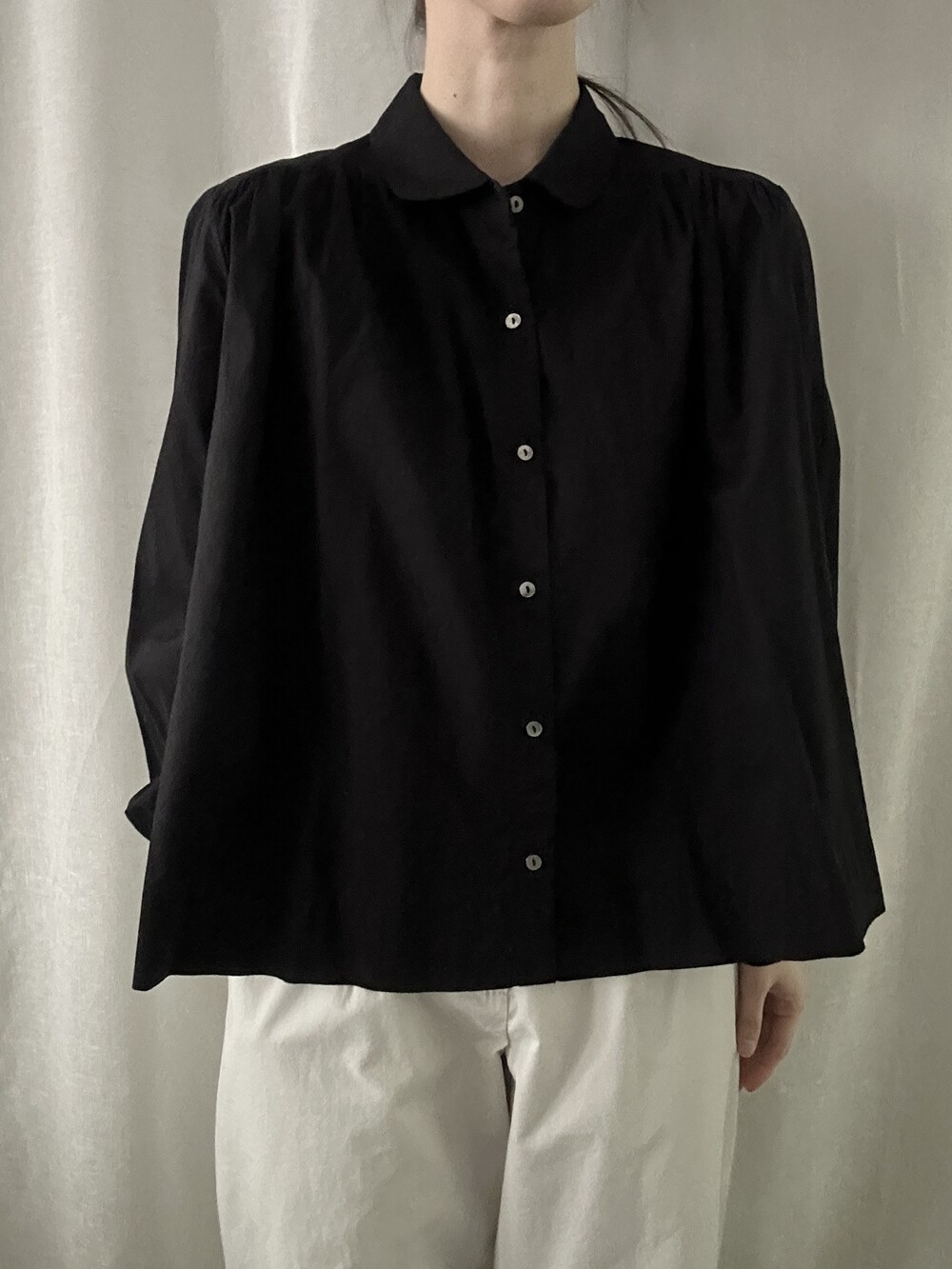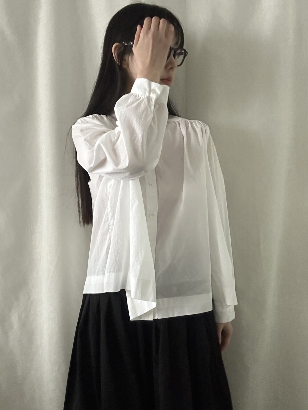 밑단을 넓게 봉제하여 캐주얼한 셔츠 느낌보다 고급스러운 블라우스 느낌을 주며 자개단추, 소매단 셔링까지 디테일과 전체적인 밸런스가 좋은 제품입니다.