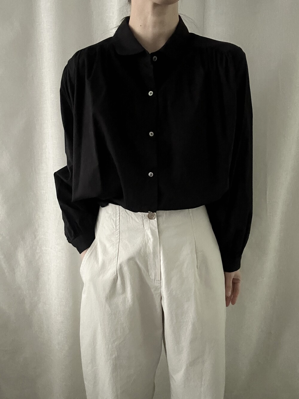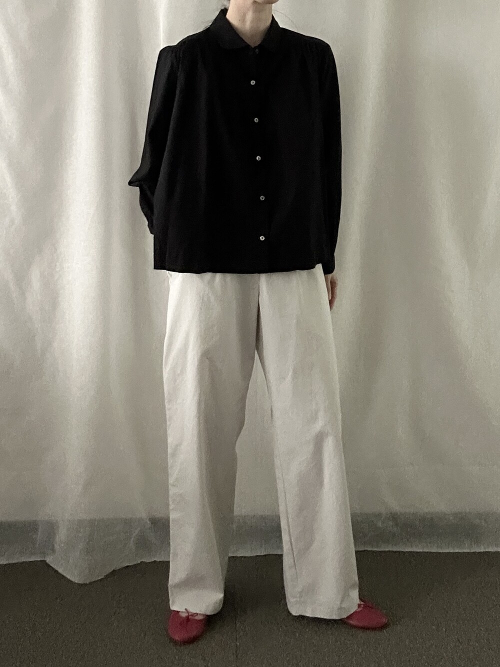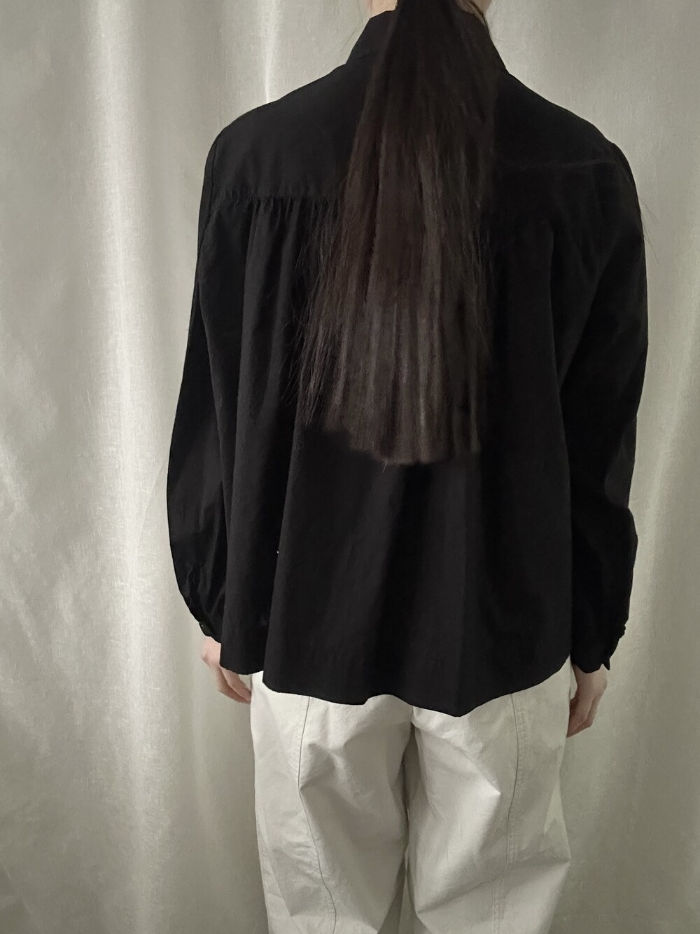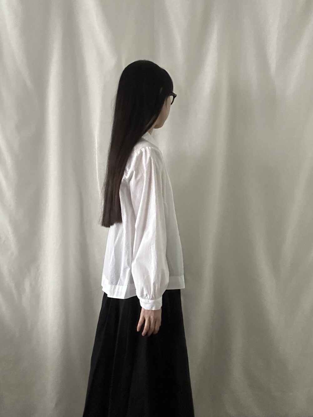 밑단을 넓게 봉제하여 캐주얼한 셔츠 느낌보다 고급스러운 블라우스 느낌을 주며 자개단추, 소매단 셔링까지 디테일과 전체적인 밸런스가 좋은 제품입니다.