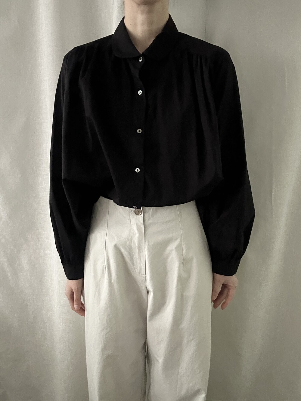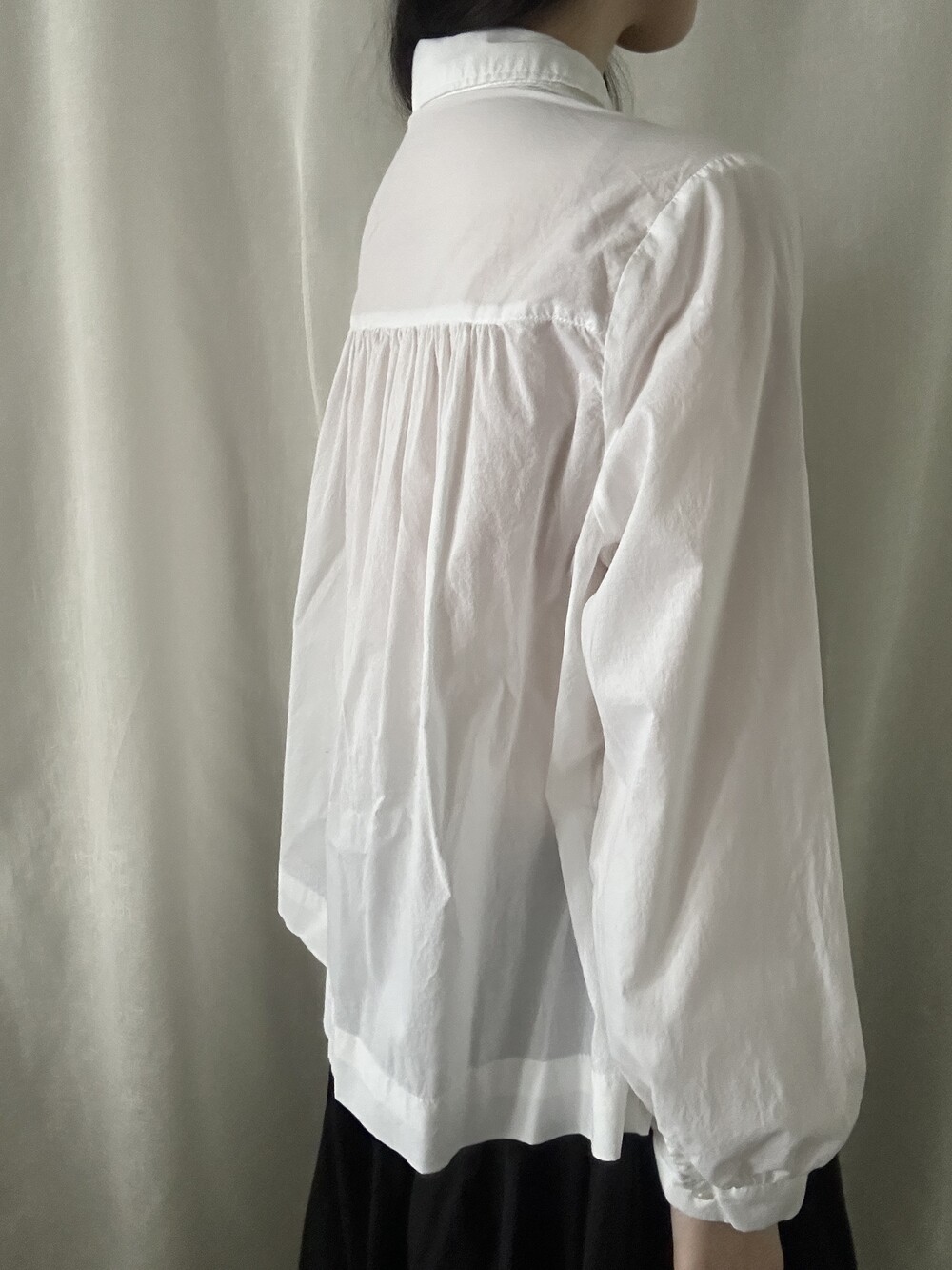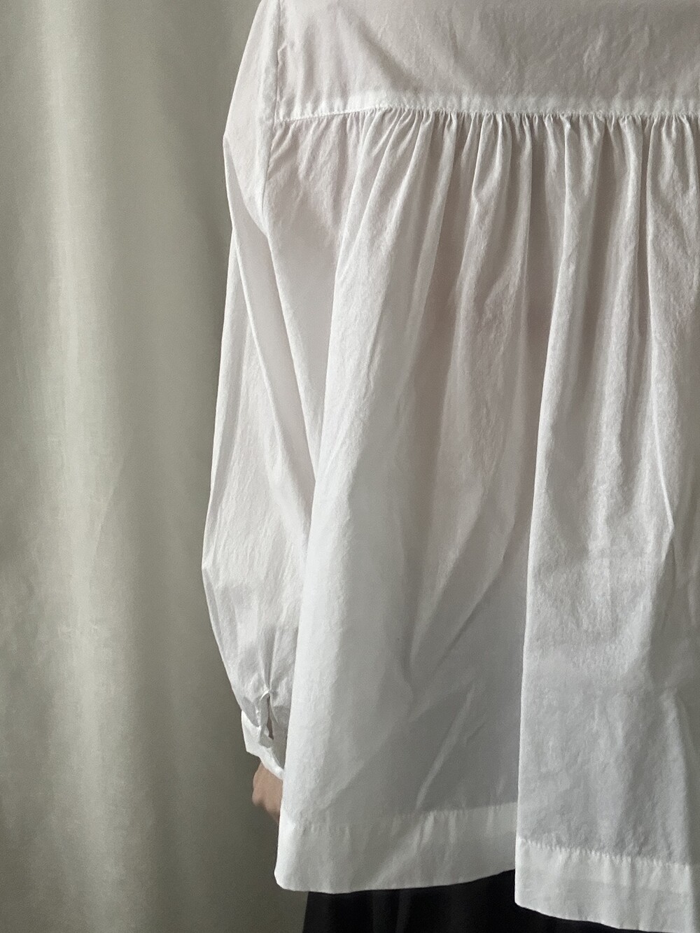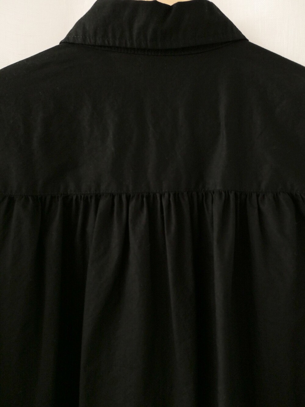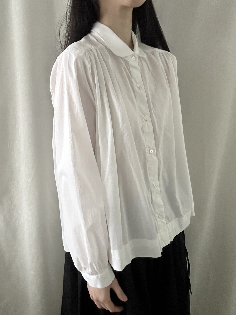 밑단을 넓게 봉제하여 캐주얼한 셔츠 느낌보다 고급스러운 블라우스 느낌을 주며 자개단추, 소매단 셔링까지 디테일과 전체적인 밸런스가 좋은 제품입니다.