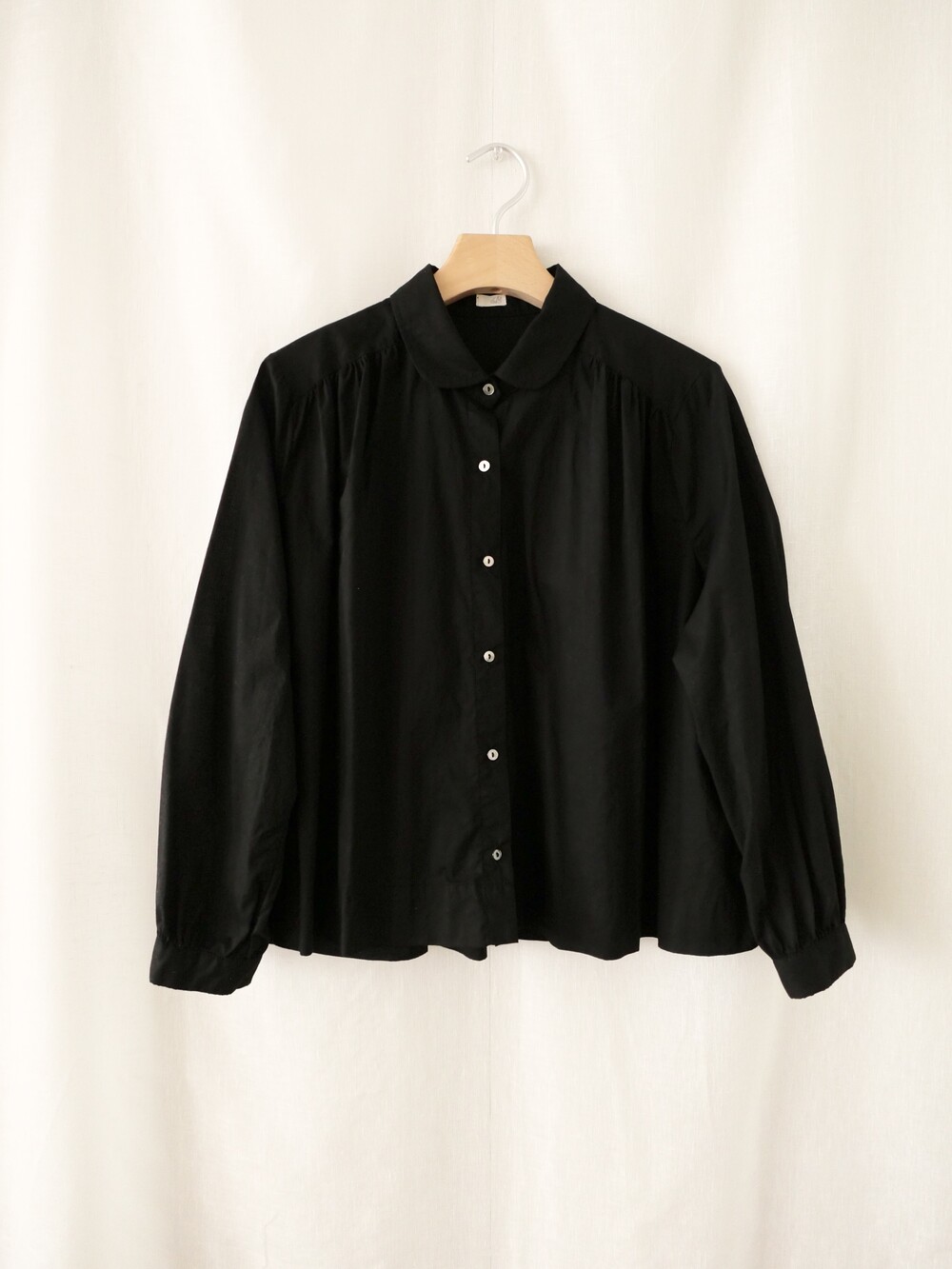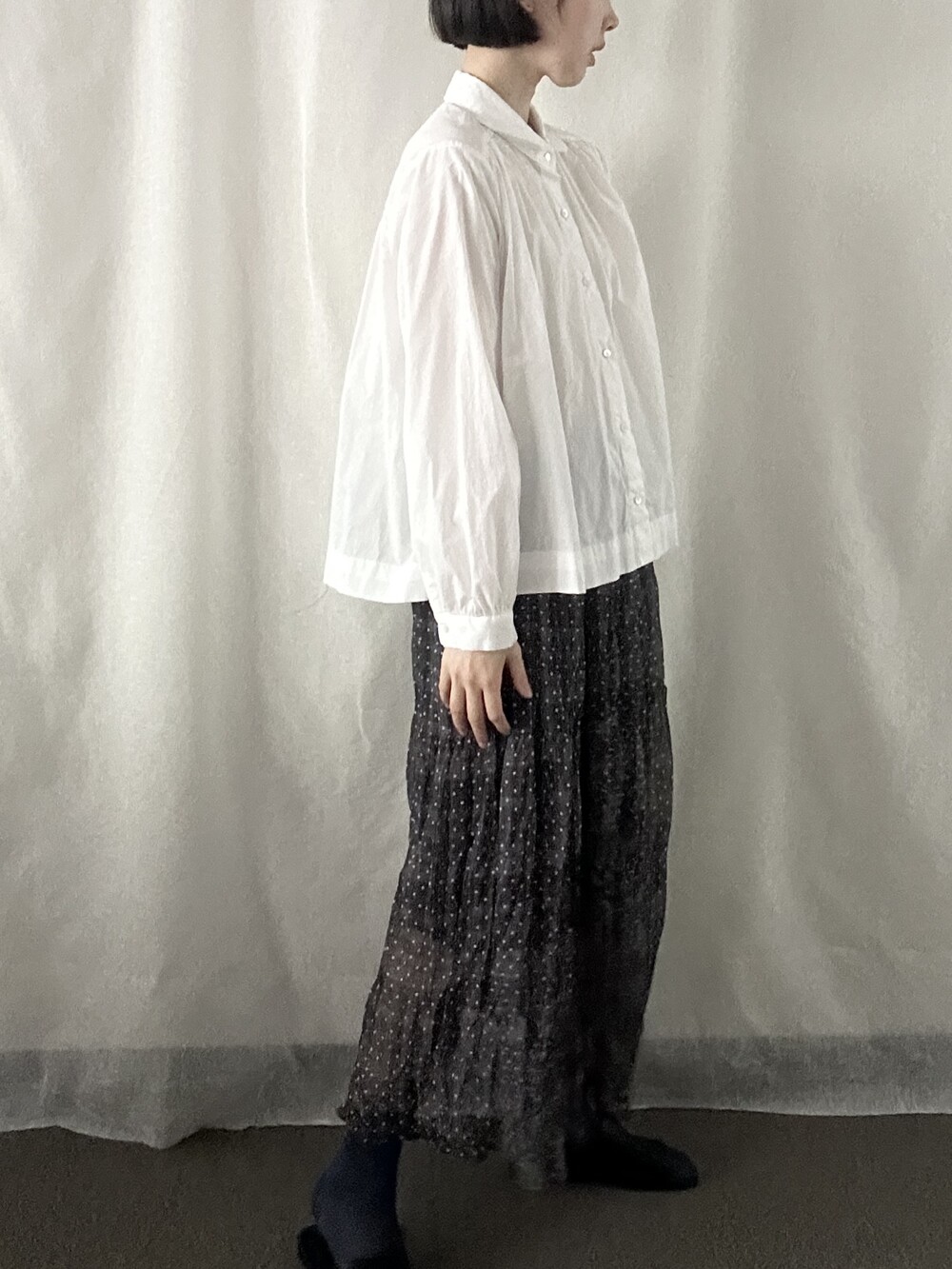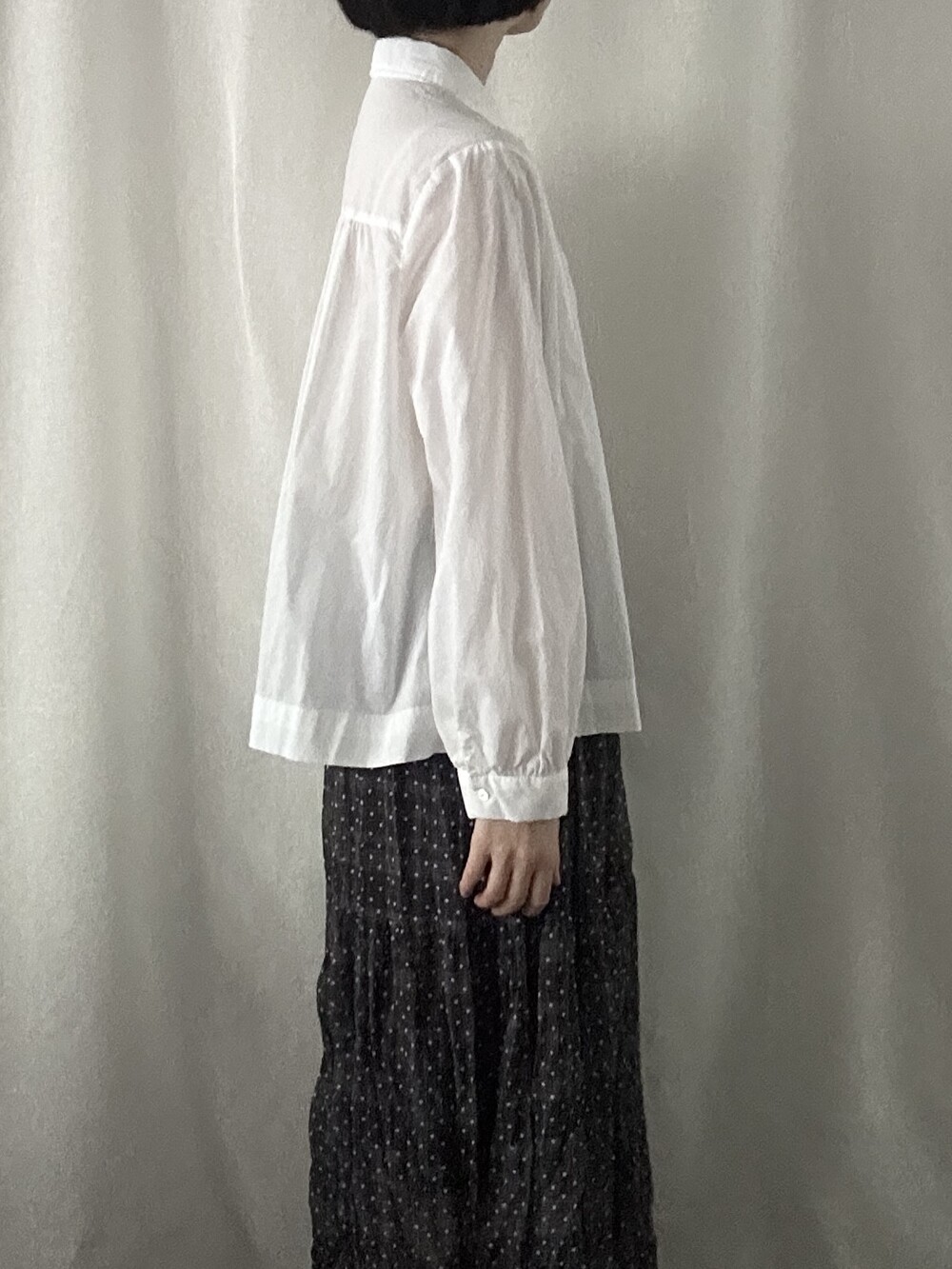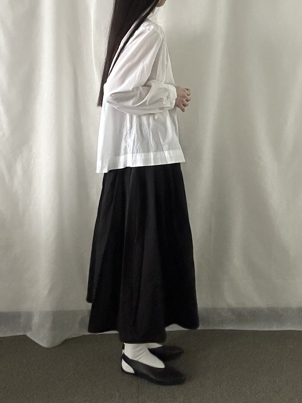 밑단을 넓게 봉제하여 캐주얼한 셔츠 느낌보다 고급스러운 블라우스 느낌을 주며 자개단추, 소매단 셔링까지 디테일과 전체적인 밸런스가 좋은 제품입니다.