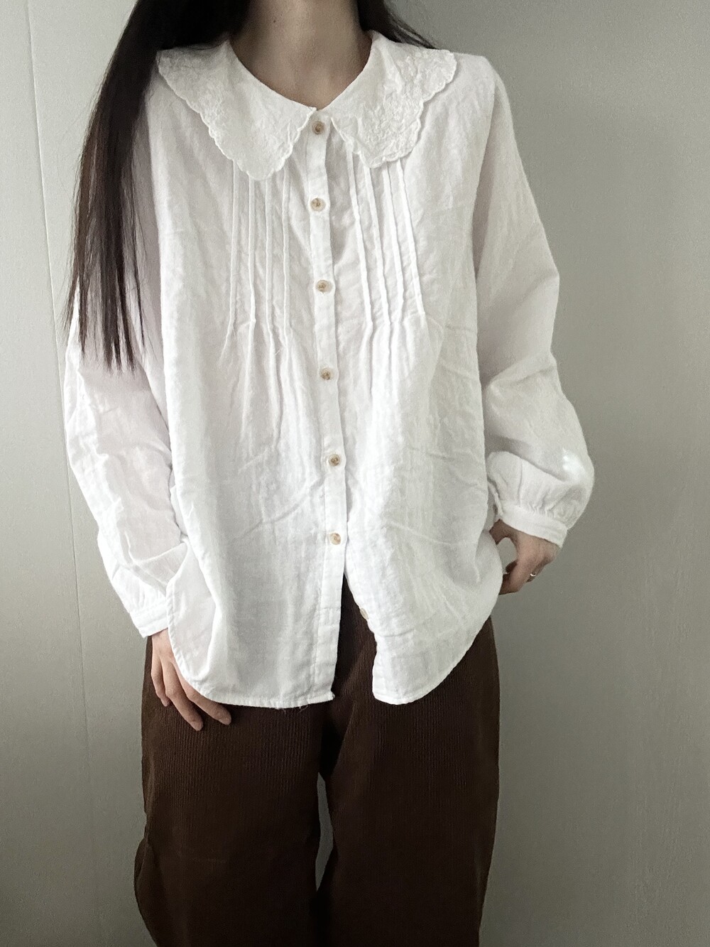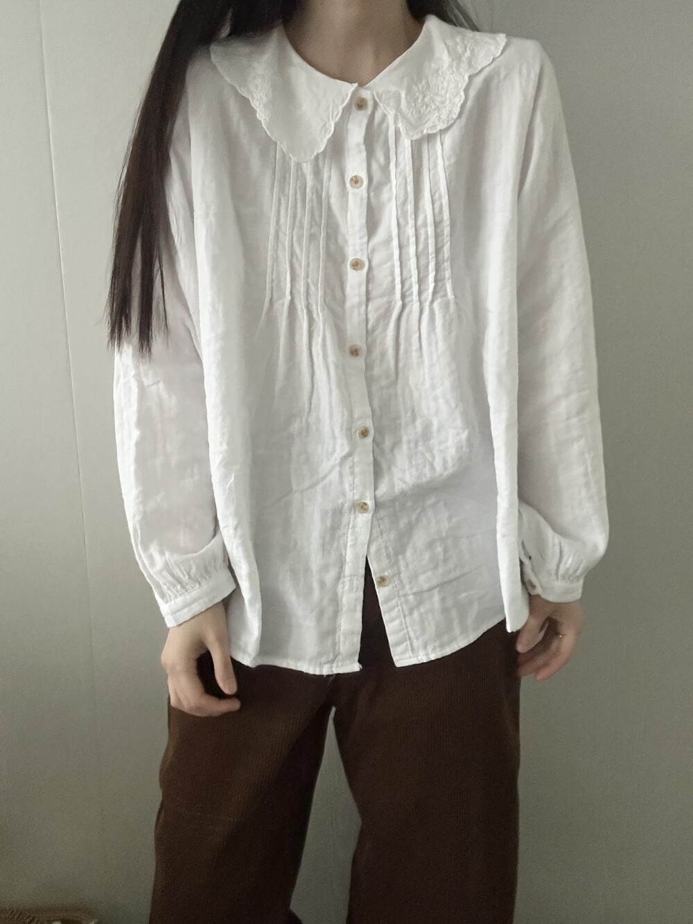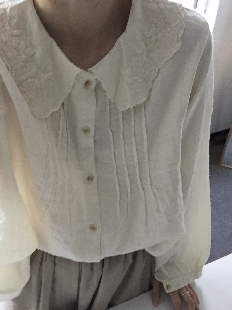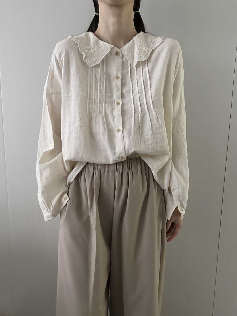 핀턱 디자인 , 뒷 요크 주름 , 소매단에 들어간 셔링 , 레이스 카라까지 사랑스러운 디테일이 과하지 않게 조화를 이루고 있습니다.