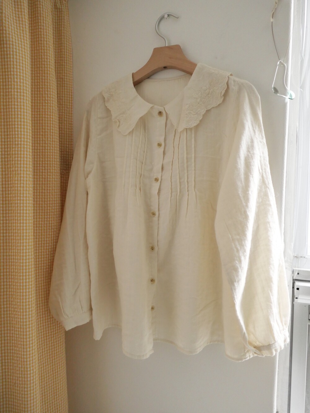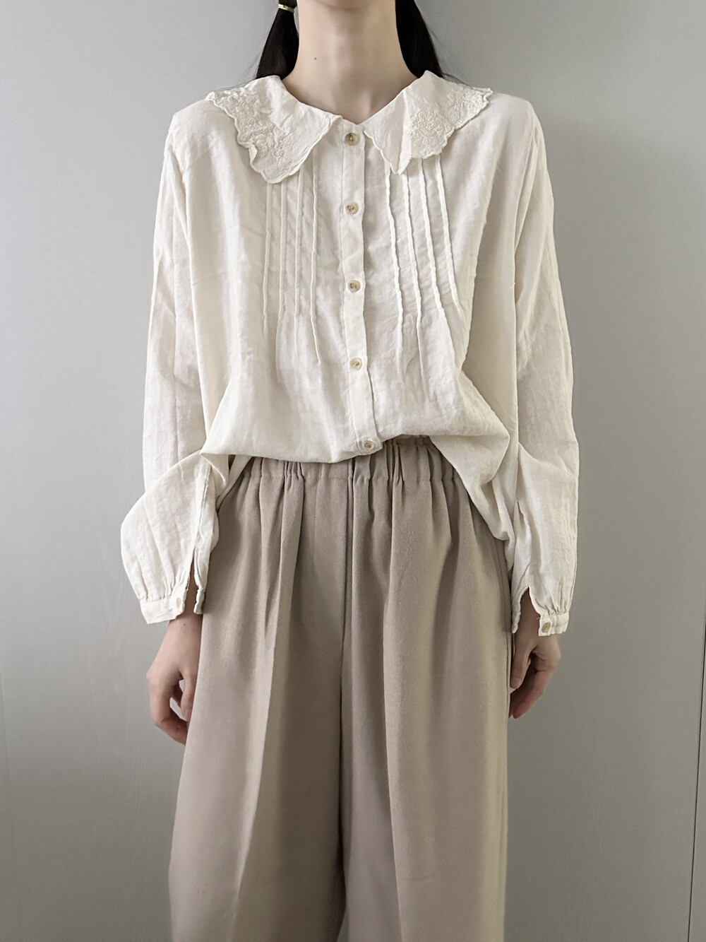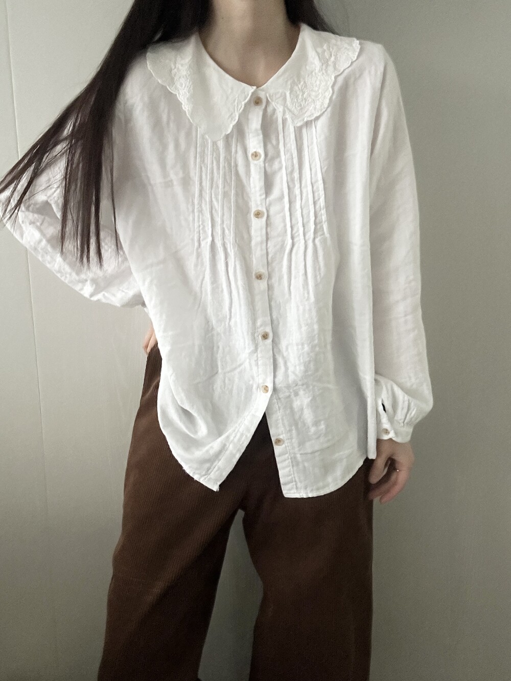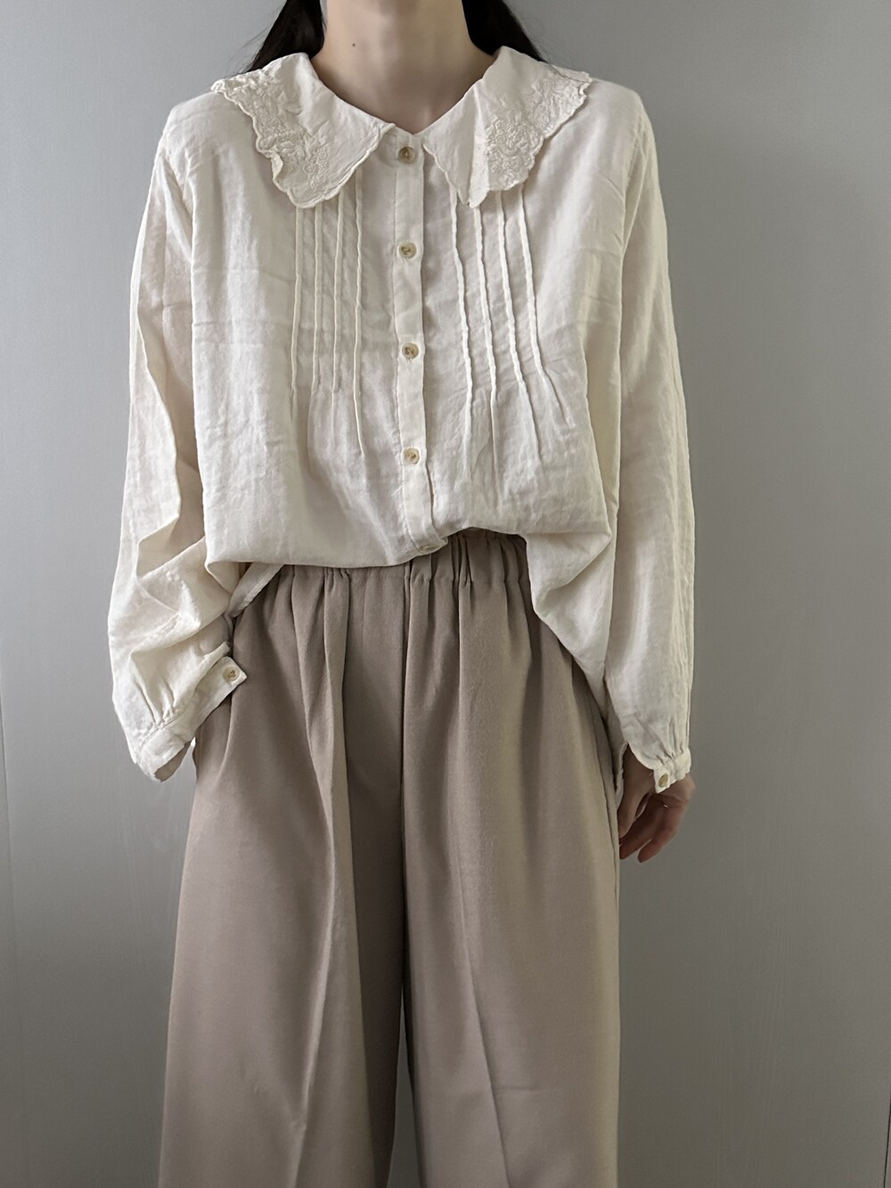 핀턱 디자인 , 뒷 요크 주름 , 소매단에 들어간 셔링 , 레이스 카라까지 사랑스러운 디테일이 과하지 않게 조화를 이루고 있습니다.