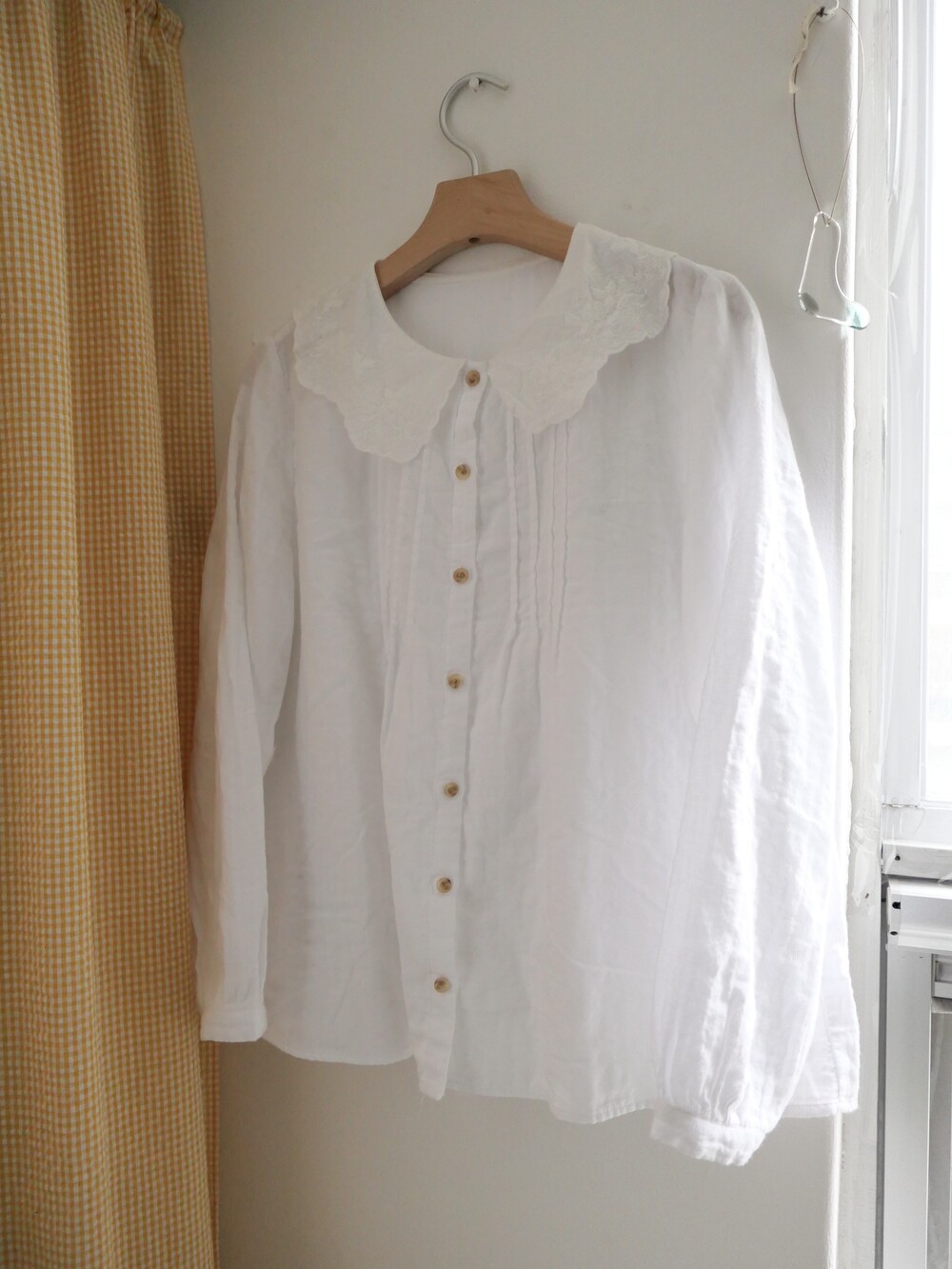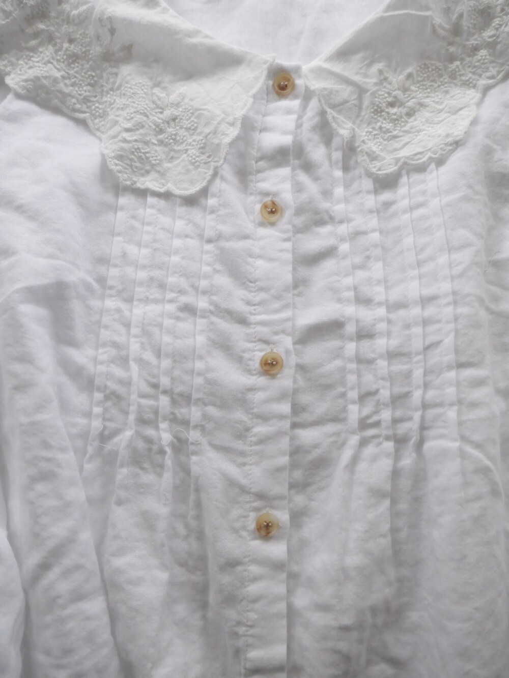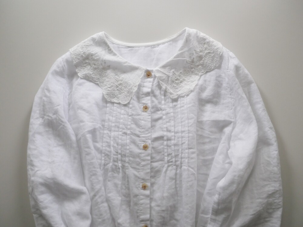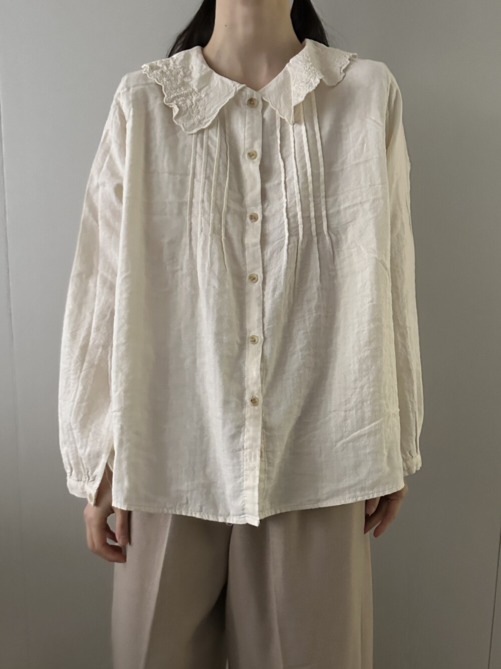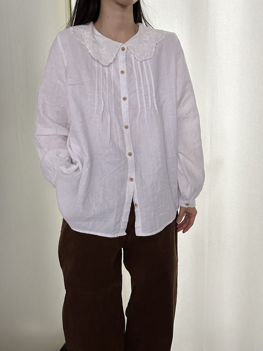 핀턱 디자인 , 뒷 요크 주름 , 소매단에 들어간 셔링 , 레이스 카라까지 사랑스러운 디테일이 과하지 않게 조화를 이루고 있습니다.