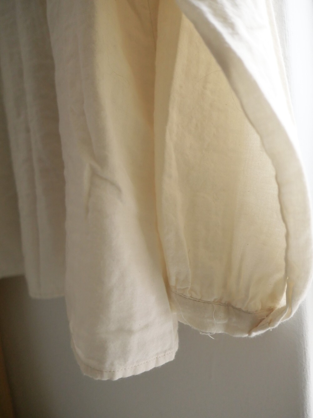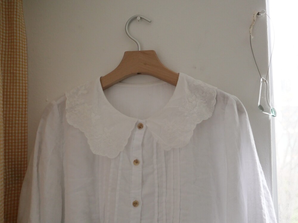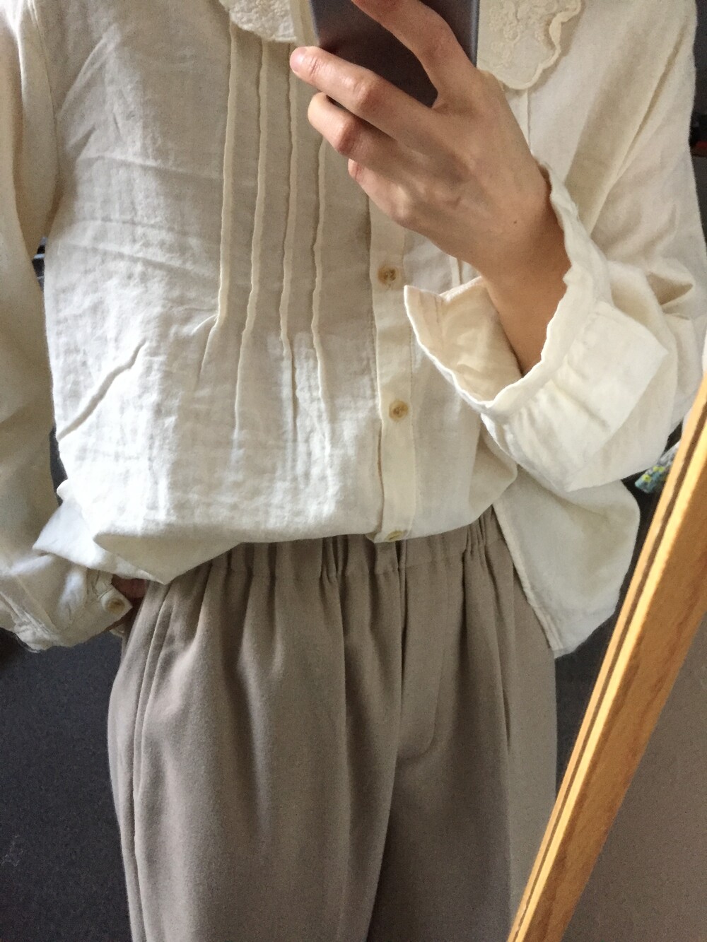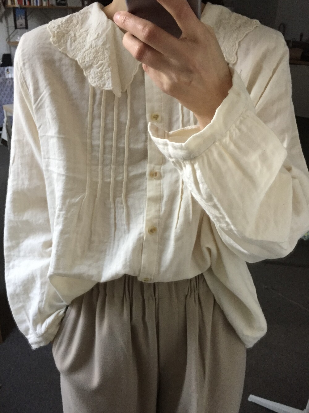 핀턱 디자인 , 뒷 요크 주름 , 소매단에 들어간 셔링 , 레이스 카라까지 사랑스러운 디테일이 과하지 않게 조화를 이루고 있습니다.