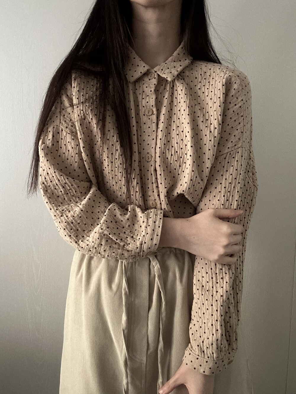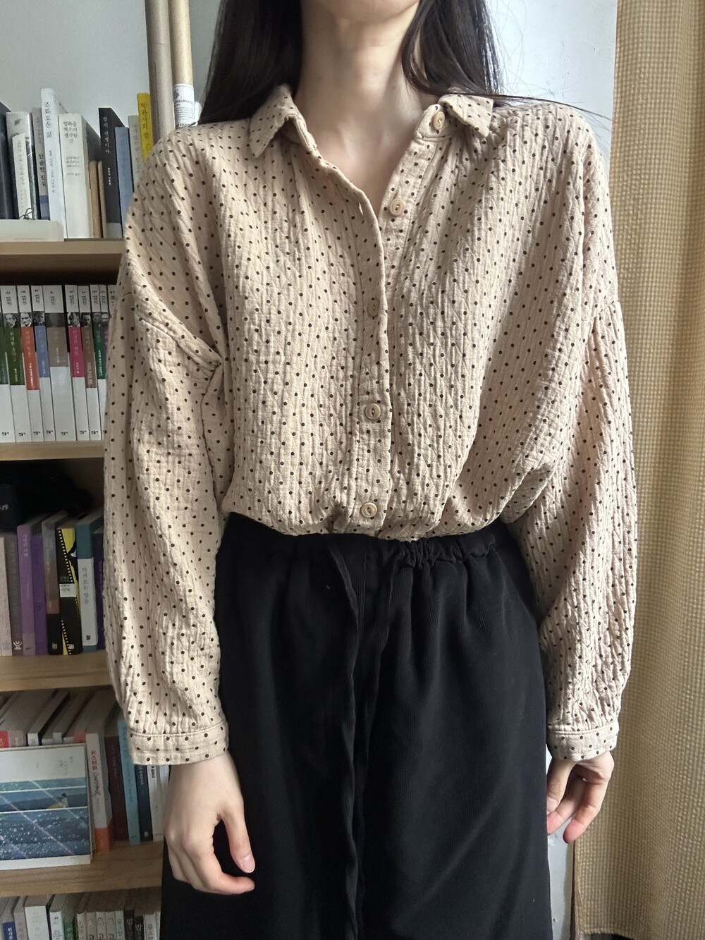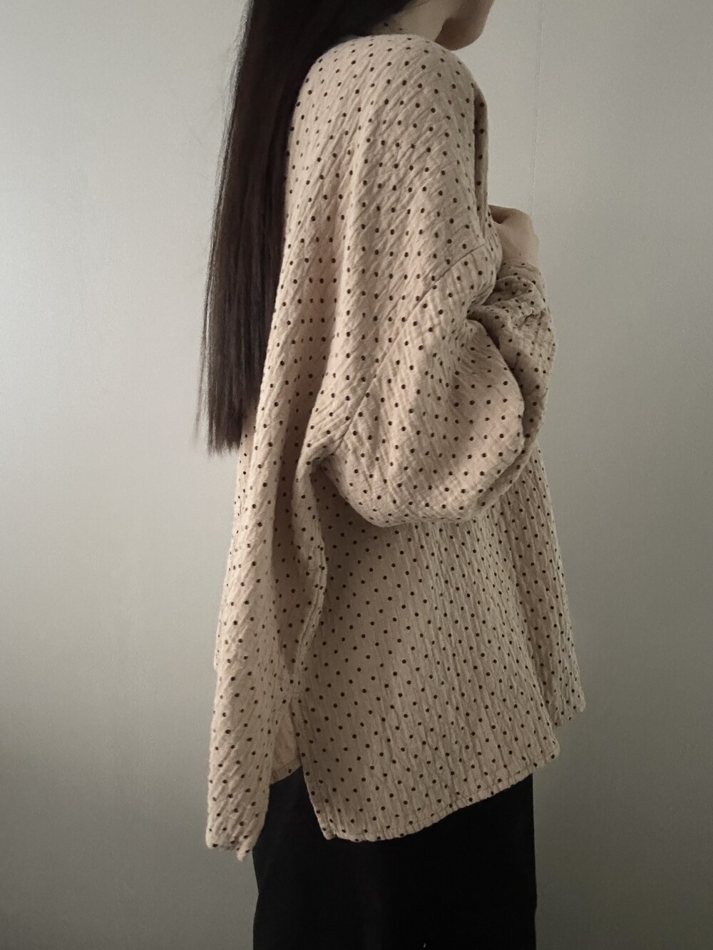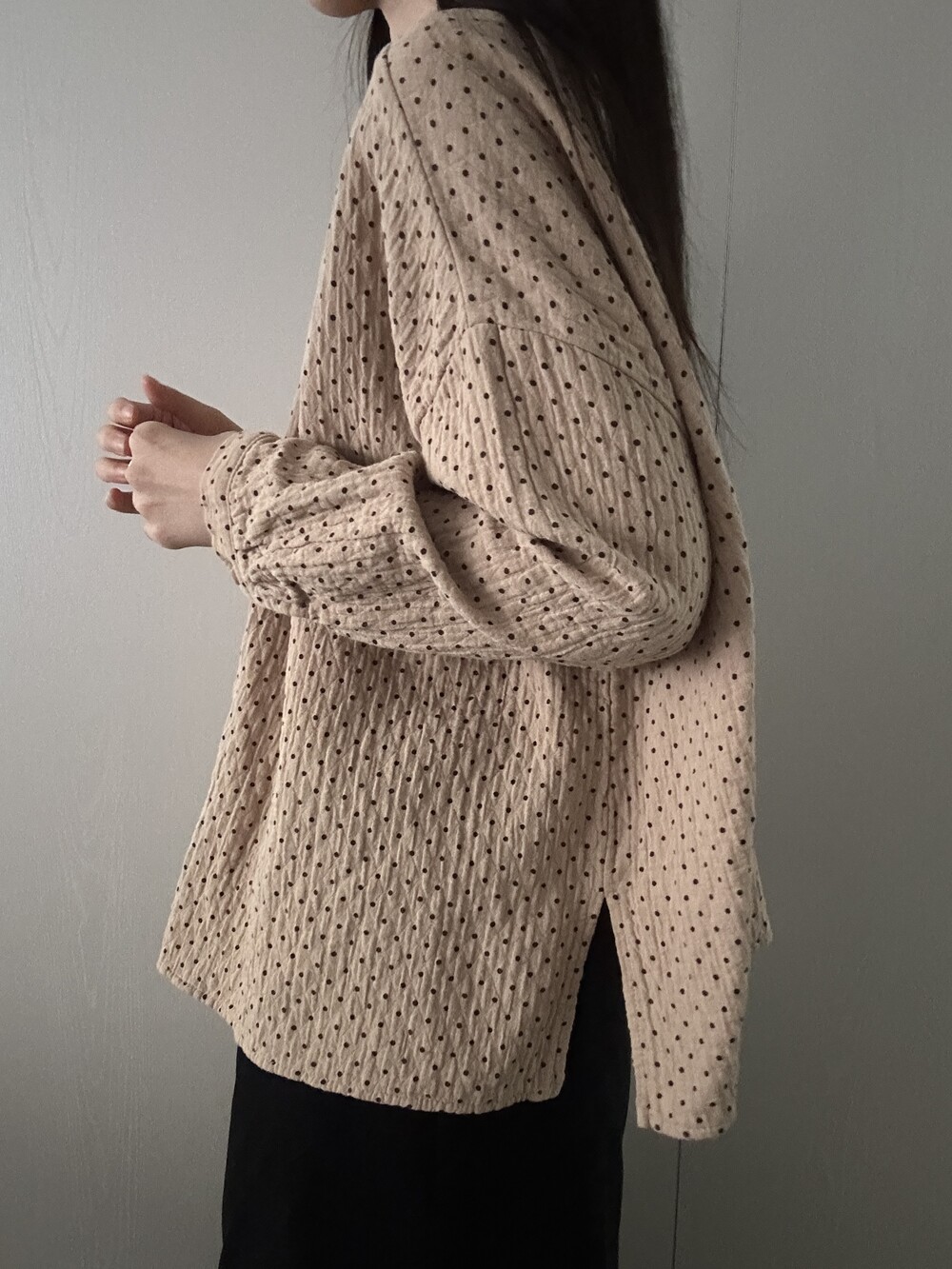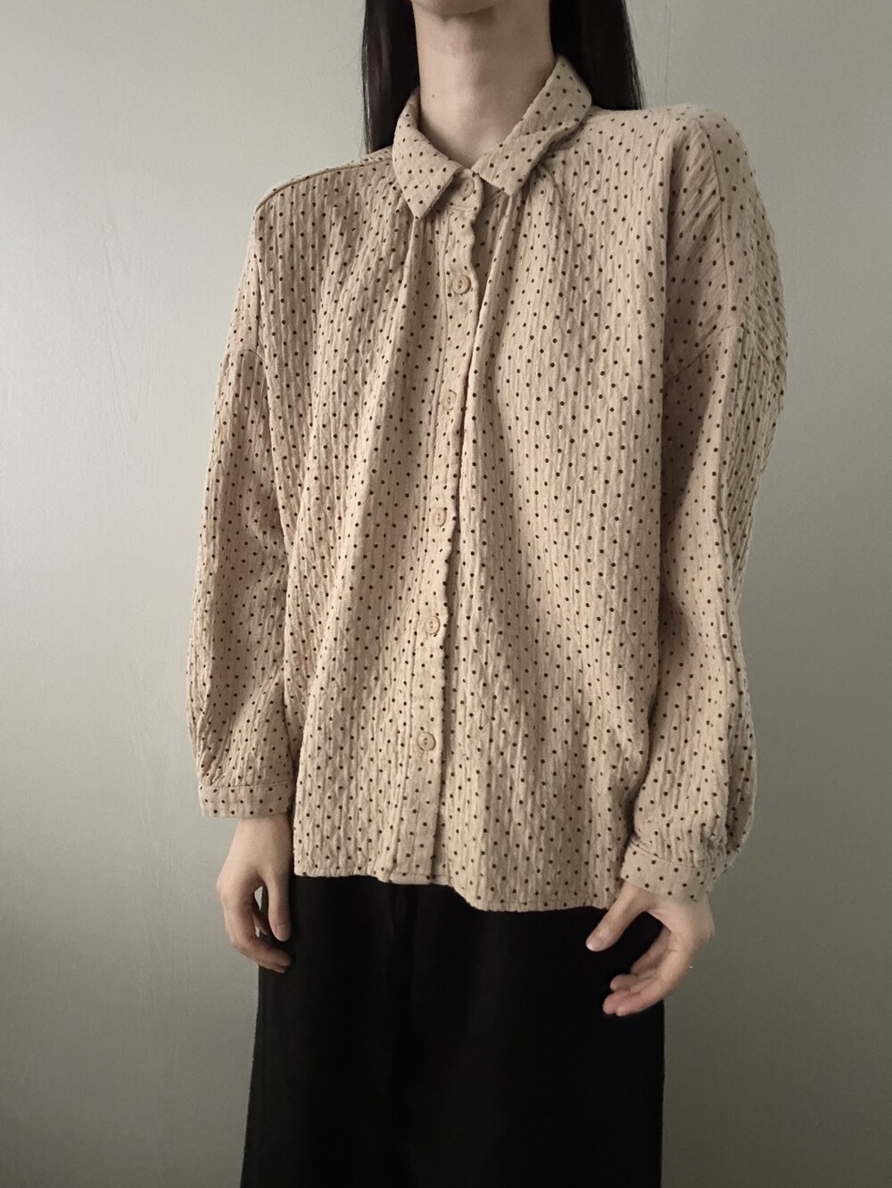 빈티지한 작은 도트 패턴에 깔끔한 카라 , 아방한 오버핏 디자인으로 유니크한 요소를 갖고 있어요.