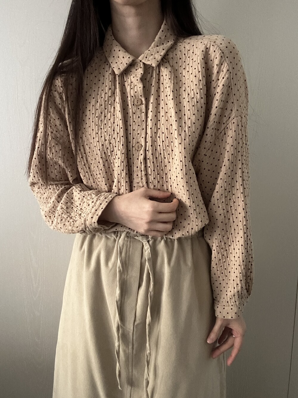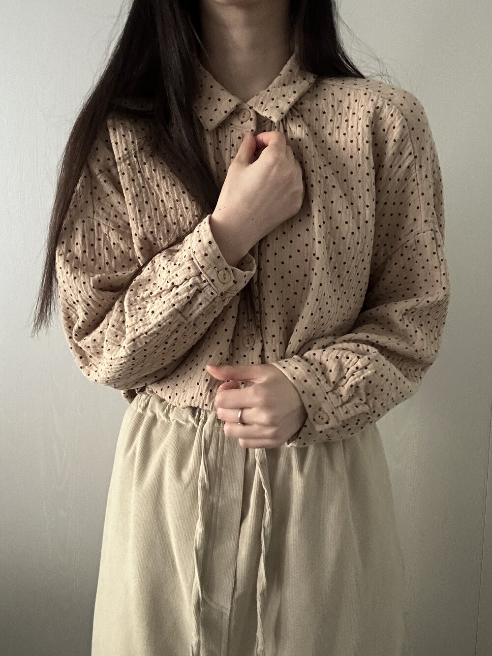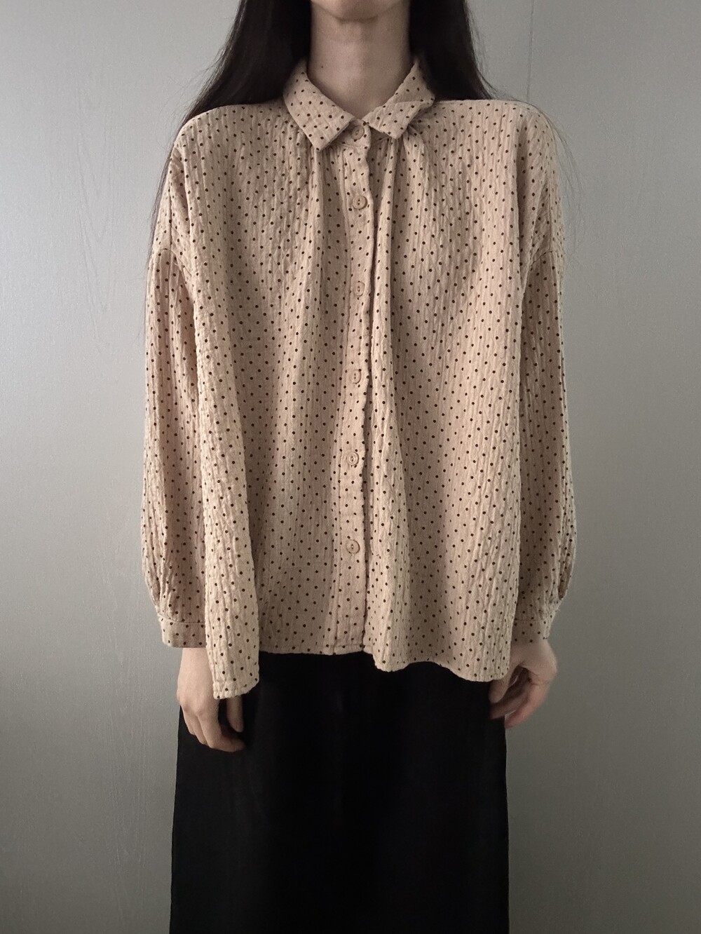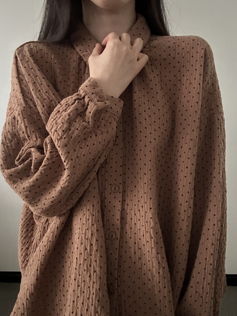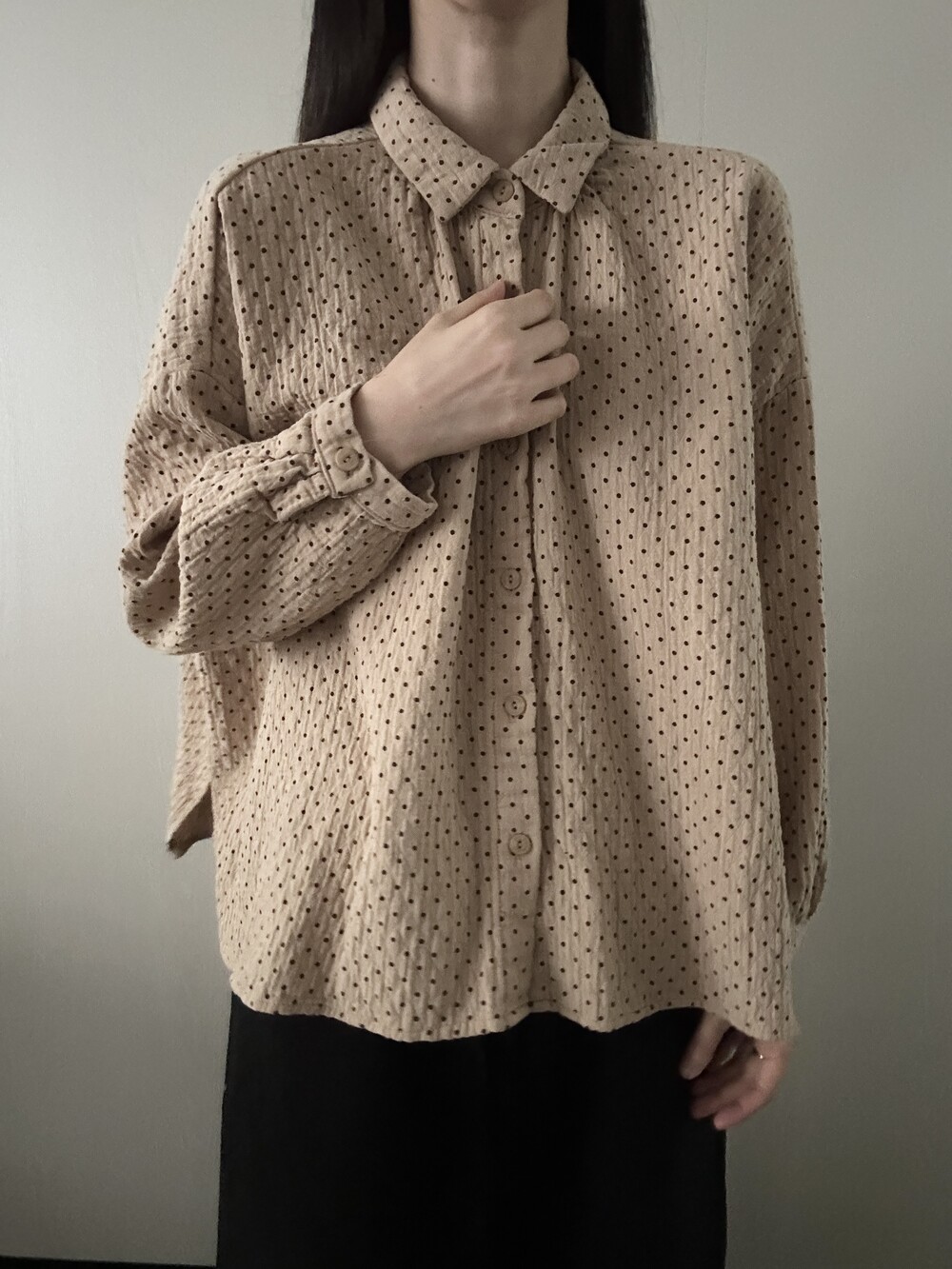 빈티지한 작은 도트 패턴에 깔끔한 카라 , 아방한 오버핏 디자인으로 유니크한 요소를 갖고 있어요.
