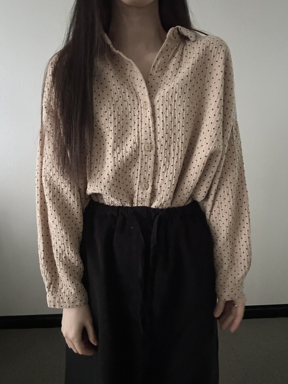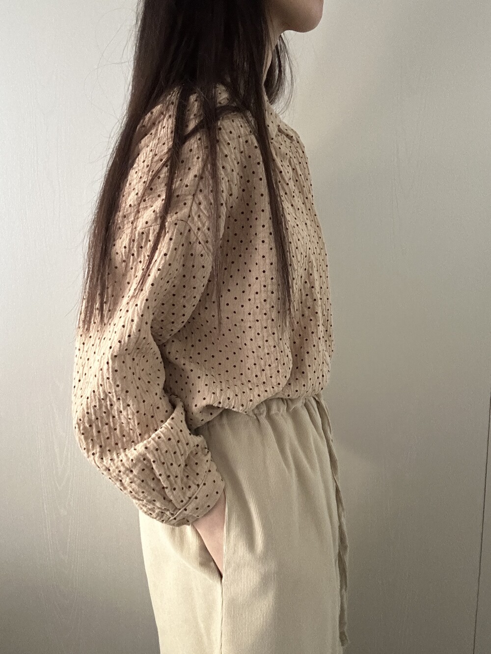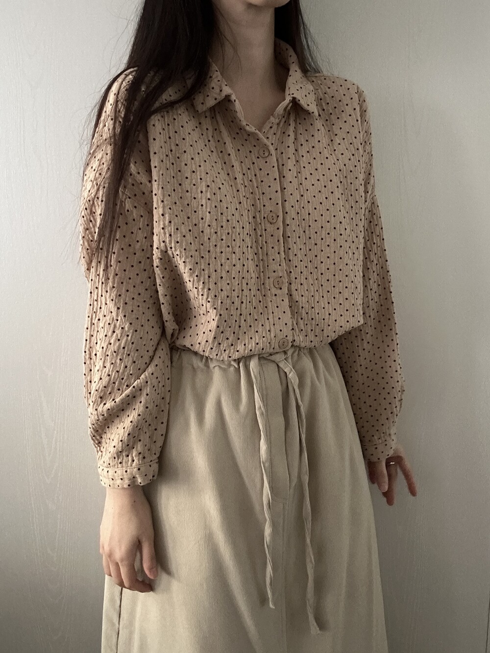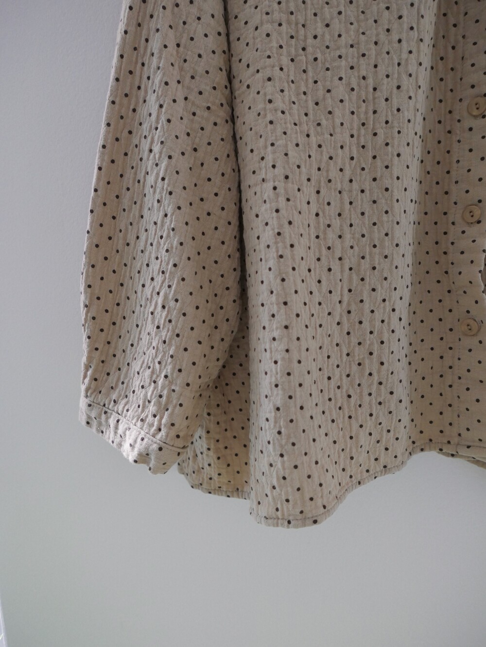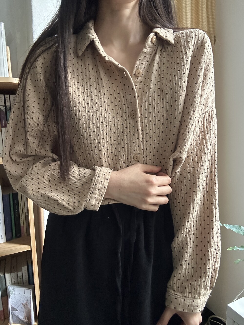 빈티지한 작은 도트 패턴에 깔끔한 카라 , 아방한 오버핏 디자인으로 유니크한 요소를 갖고 있어요.