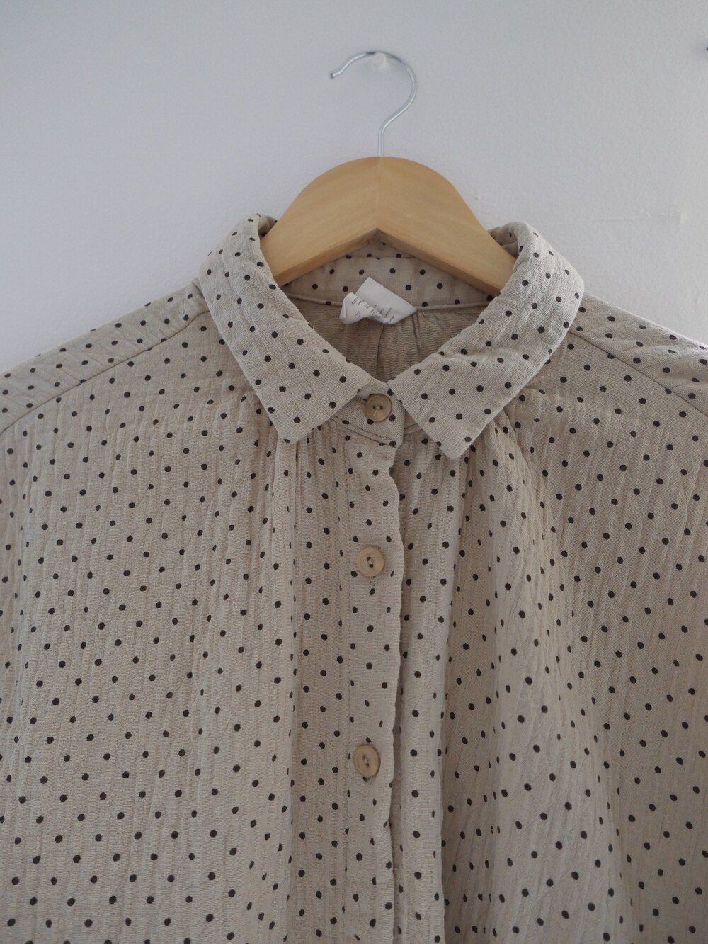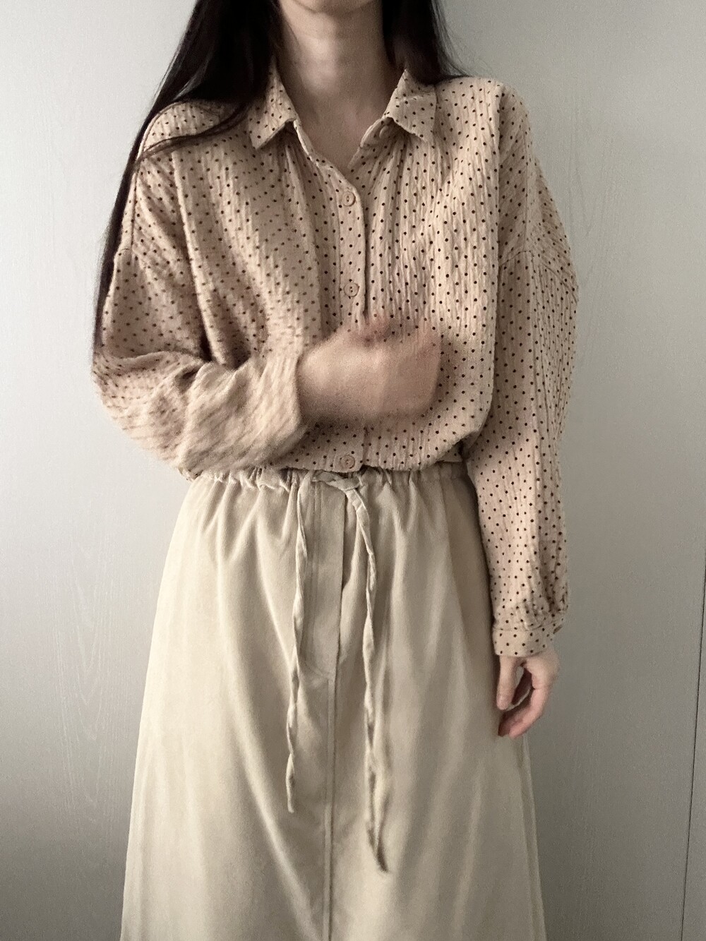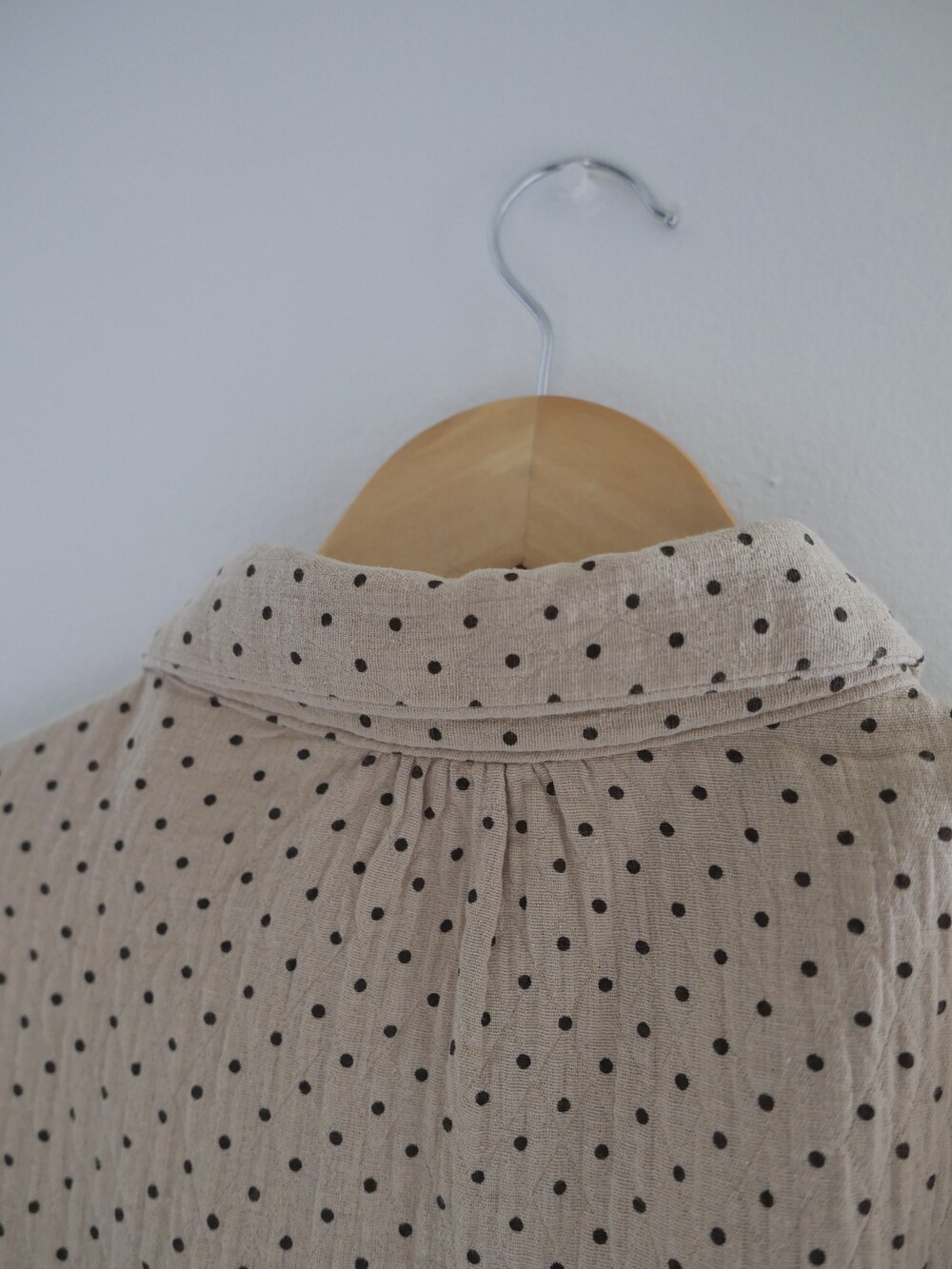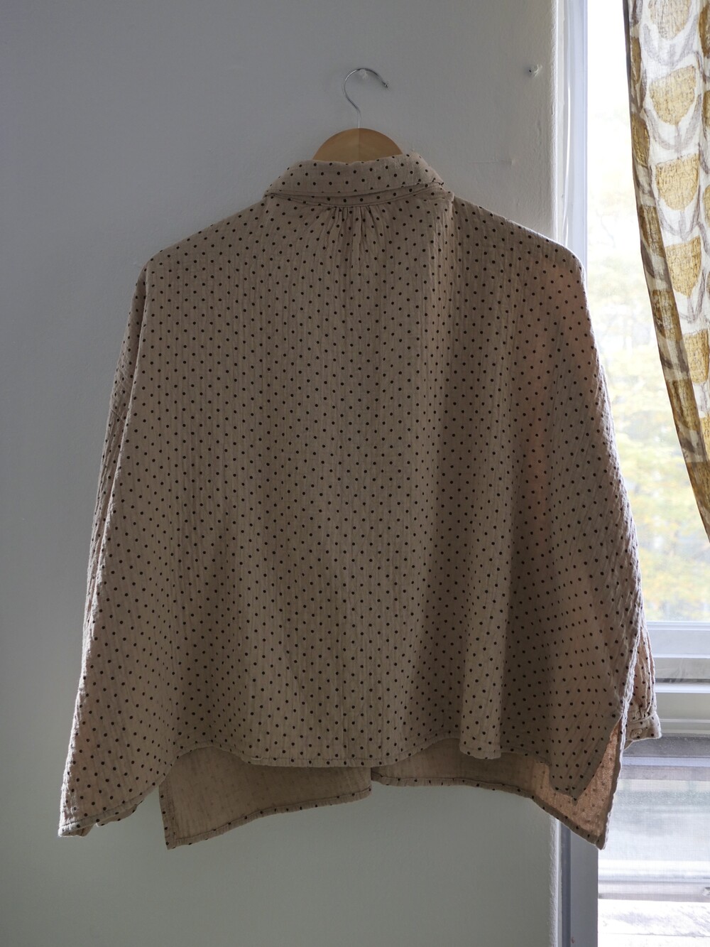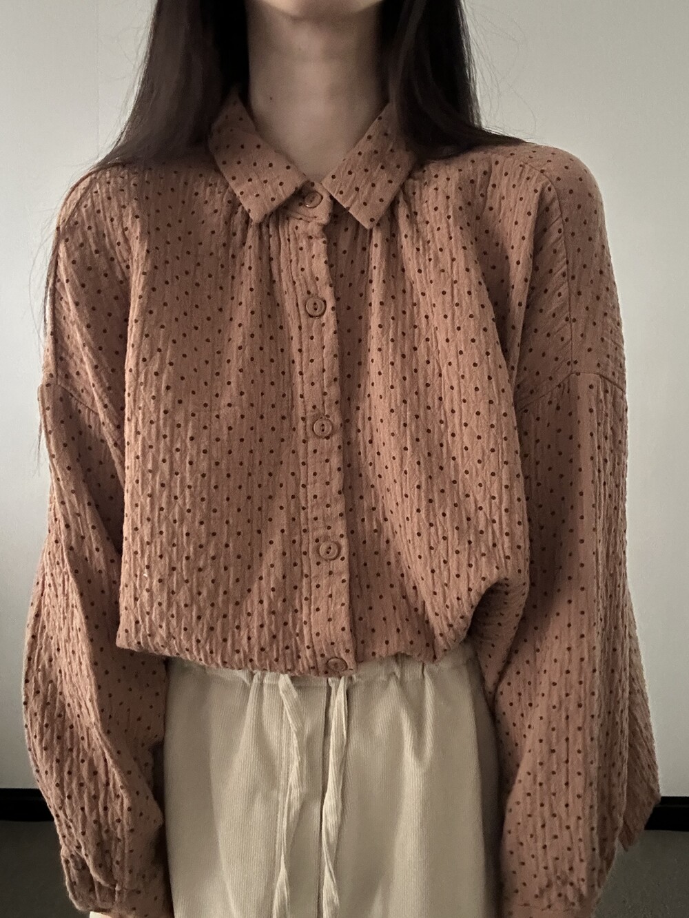 빈티지한 작은 도트 패턴에 깔끔한 카라 , 아방한 오버핏 디자인으로 유니크한 요소를 갖고 있어요.