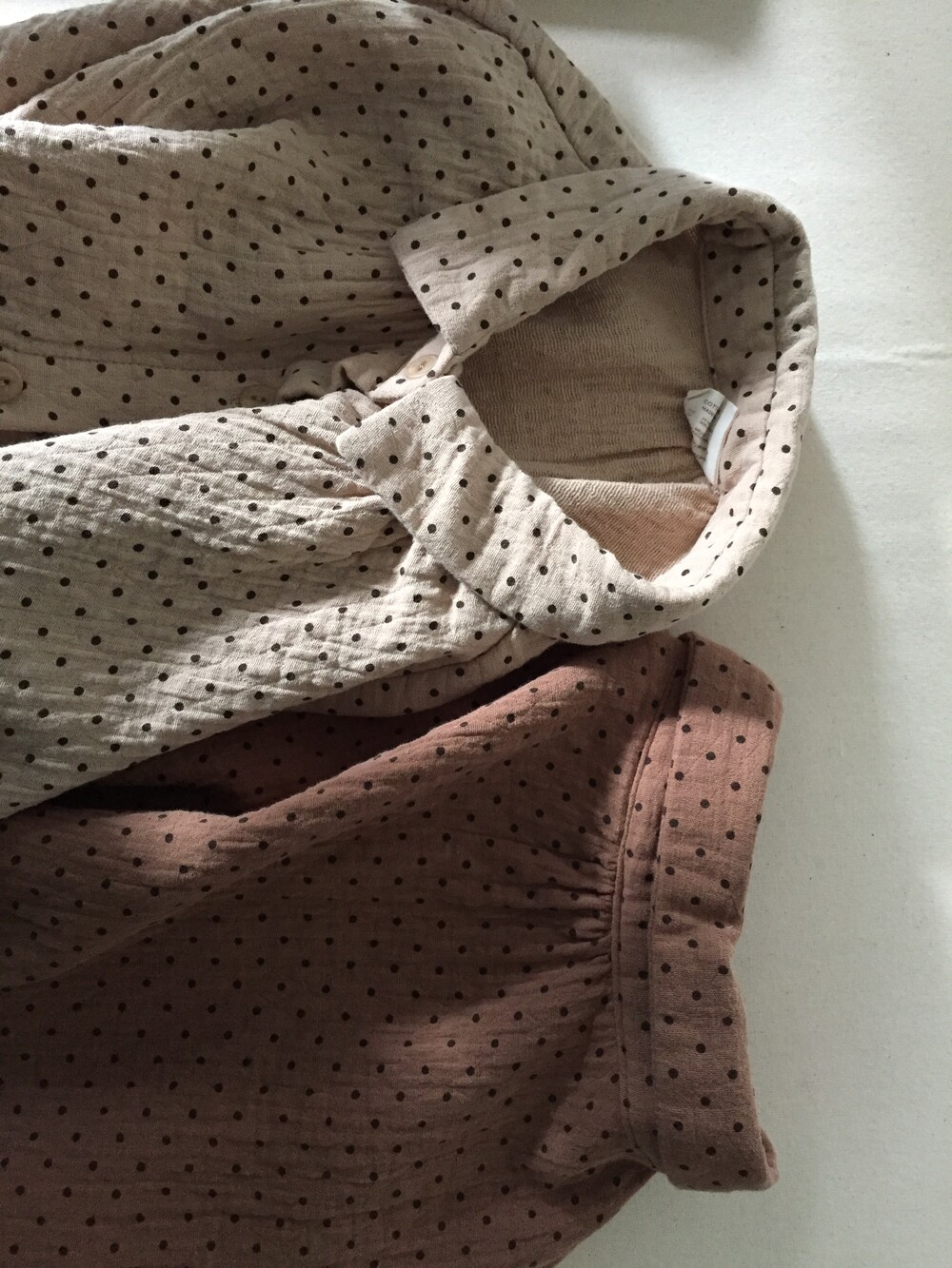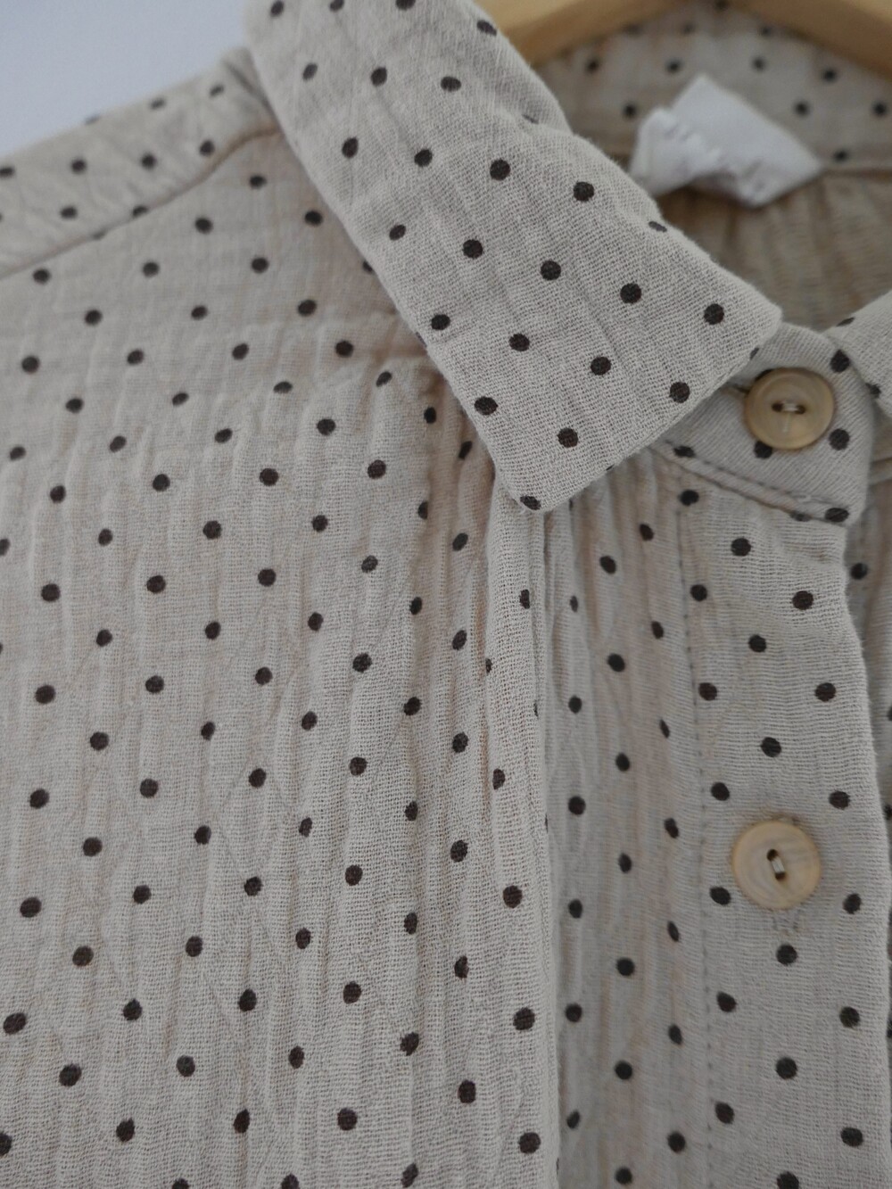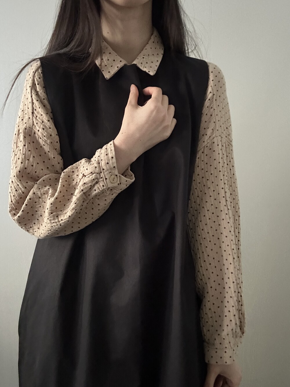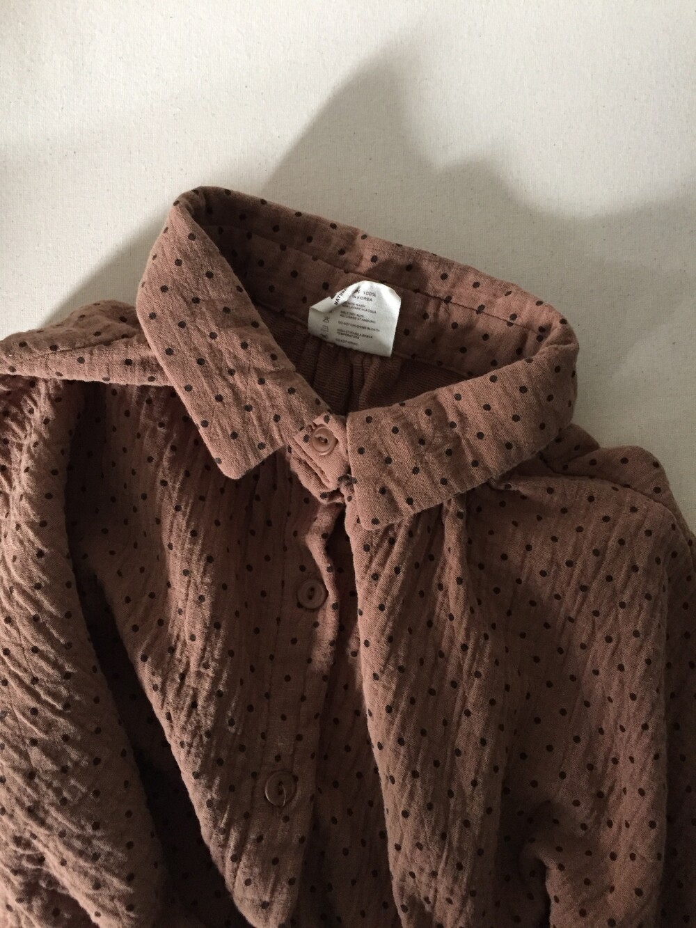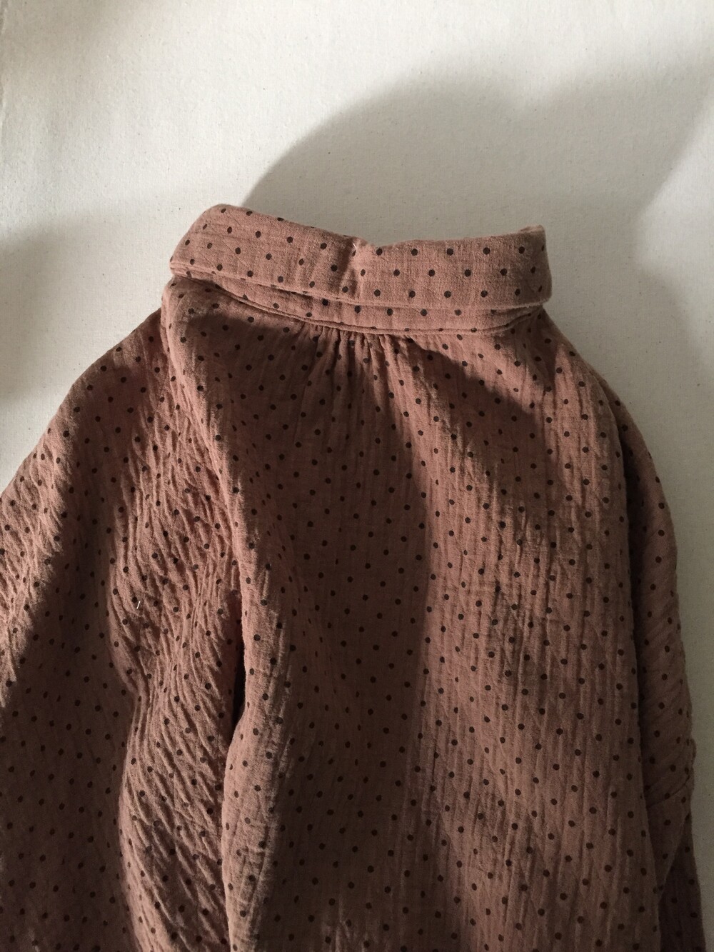 빈티지한 작은 도트 패턴에 깔끔한 카라 , 아방한 오버핏 디자인으로 유니크한 요소를 갖고 있어요.