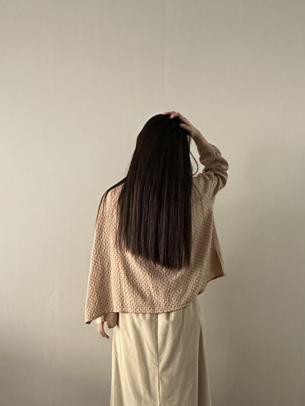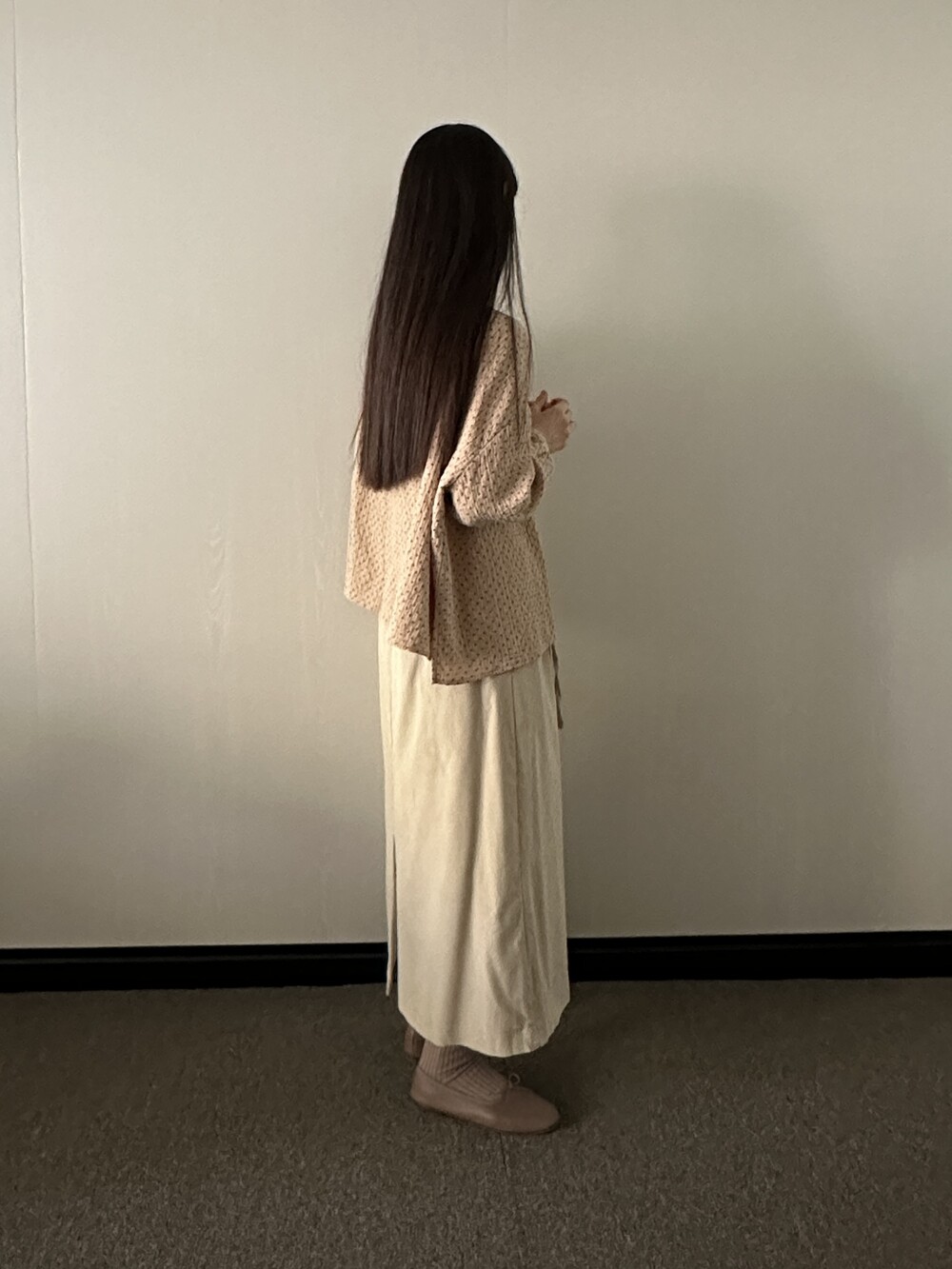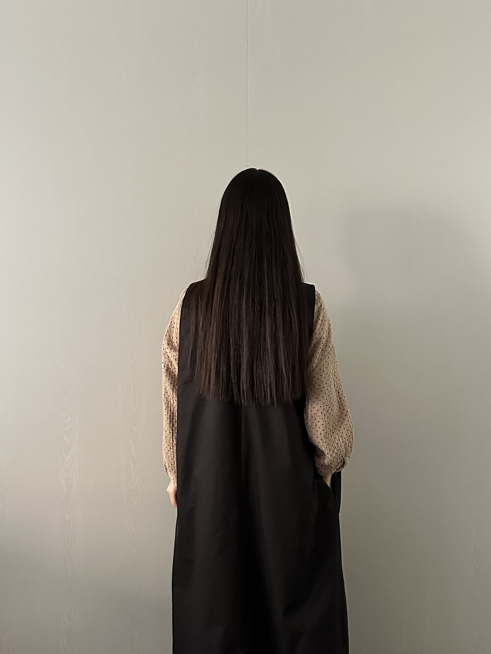 입었을 때 어깨선이 앞으로 내려오면서 자연스럽게 앞뒤 기장 차이가 생겨 아방한 무드가 생깁니다.