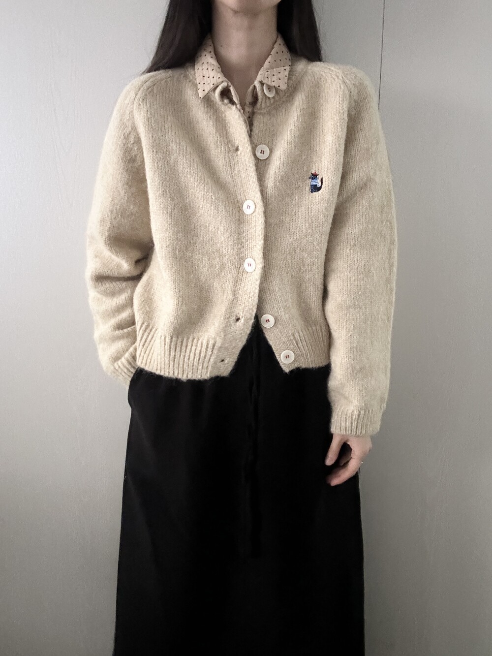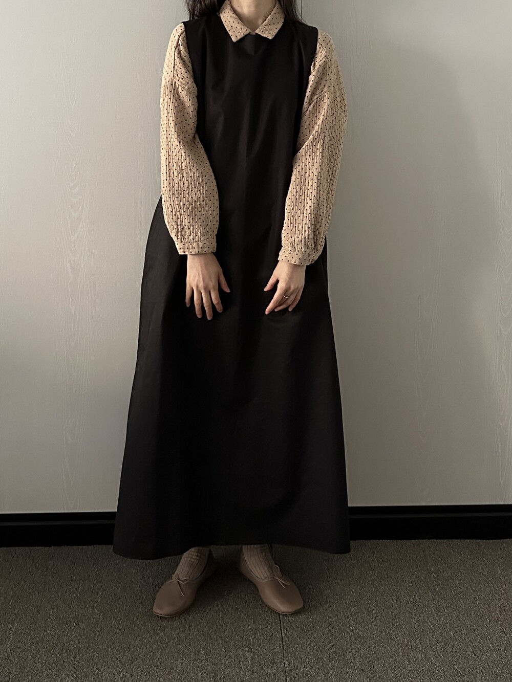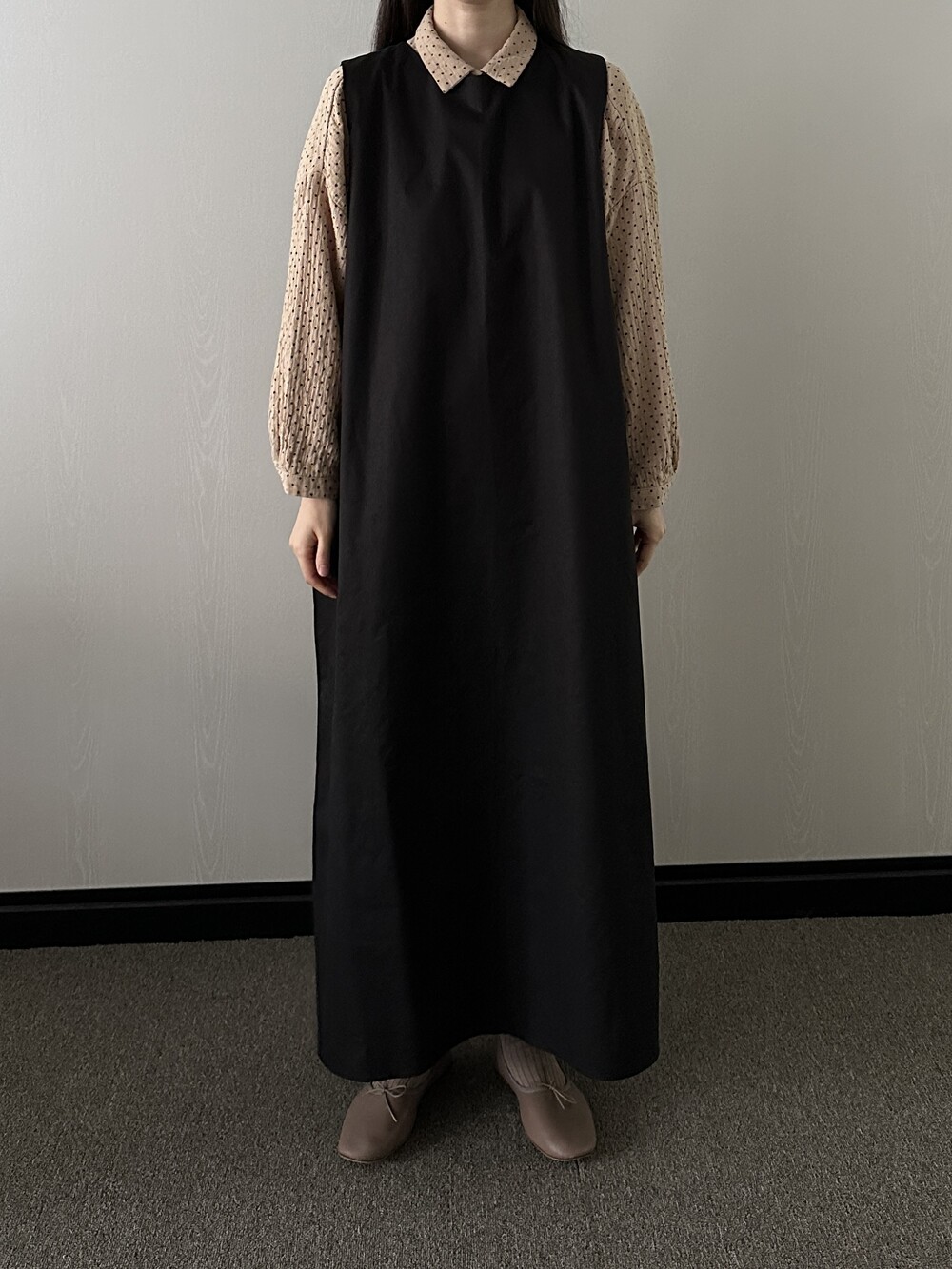 입었을 때 어깨선이 앞으로 내려오면서 자연스럽게 앞뒤 기장 차이가 생겨 아방한 무드가 생깁니다.