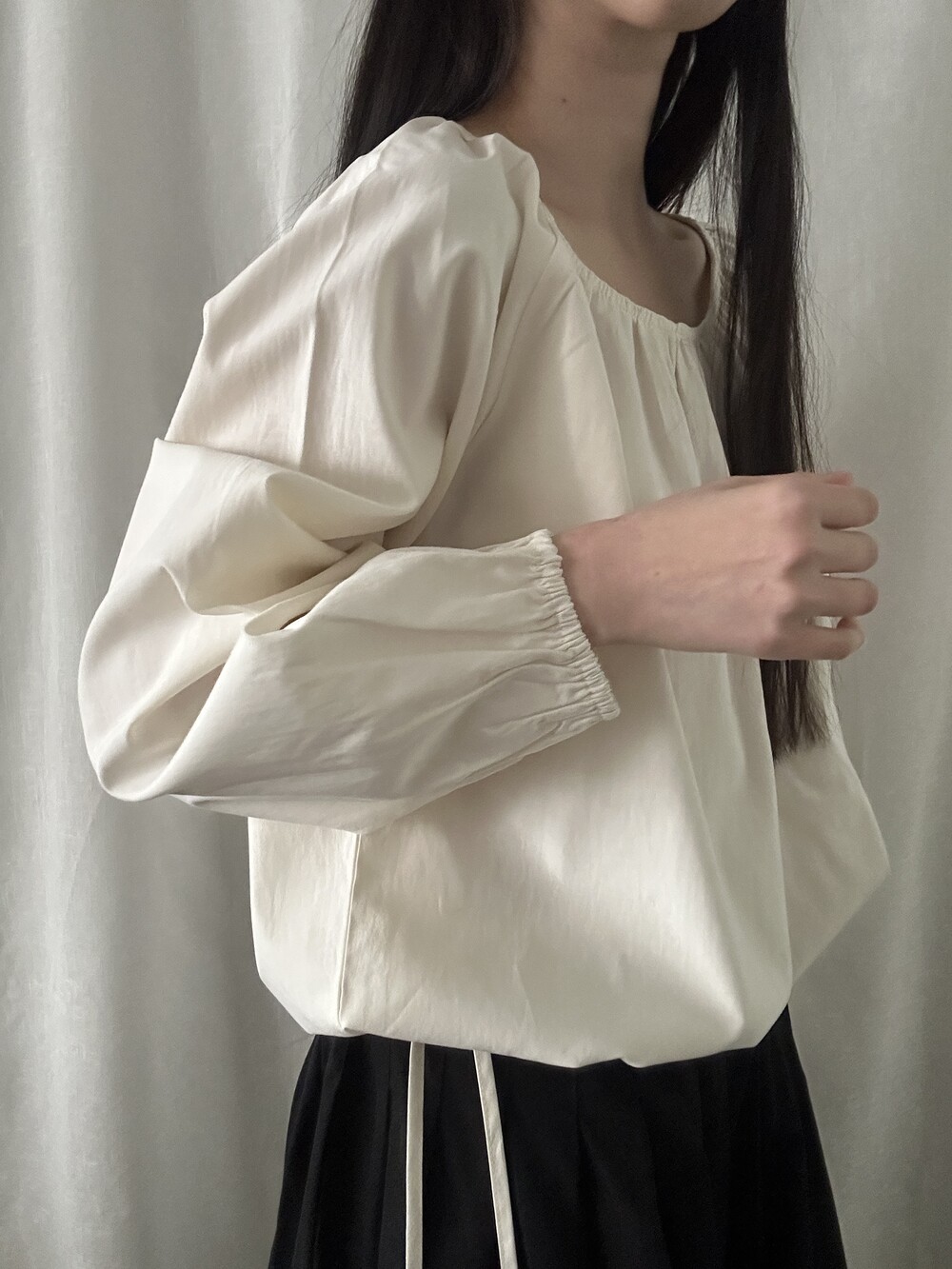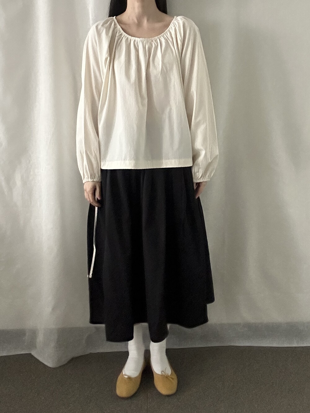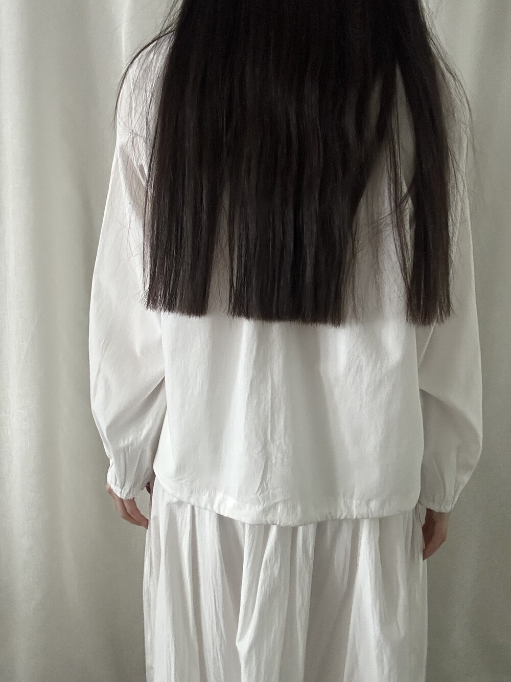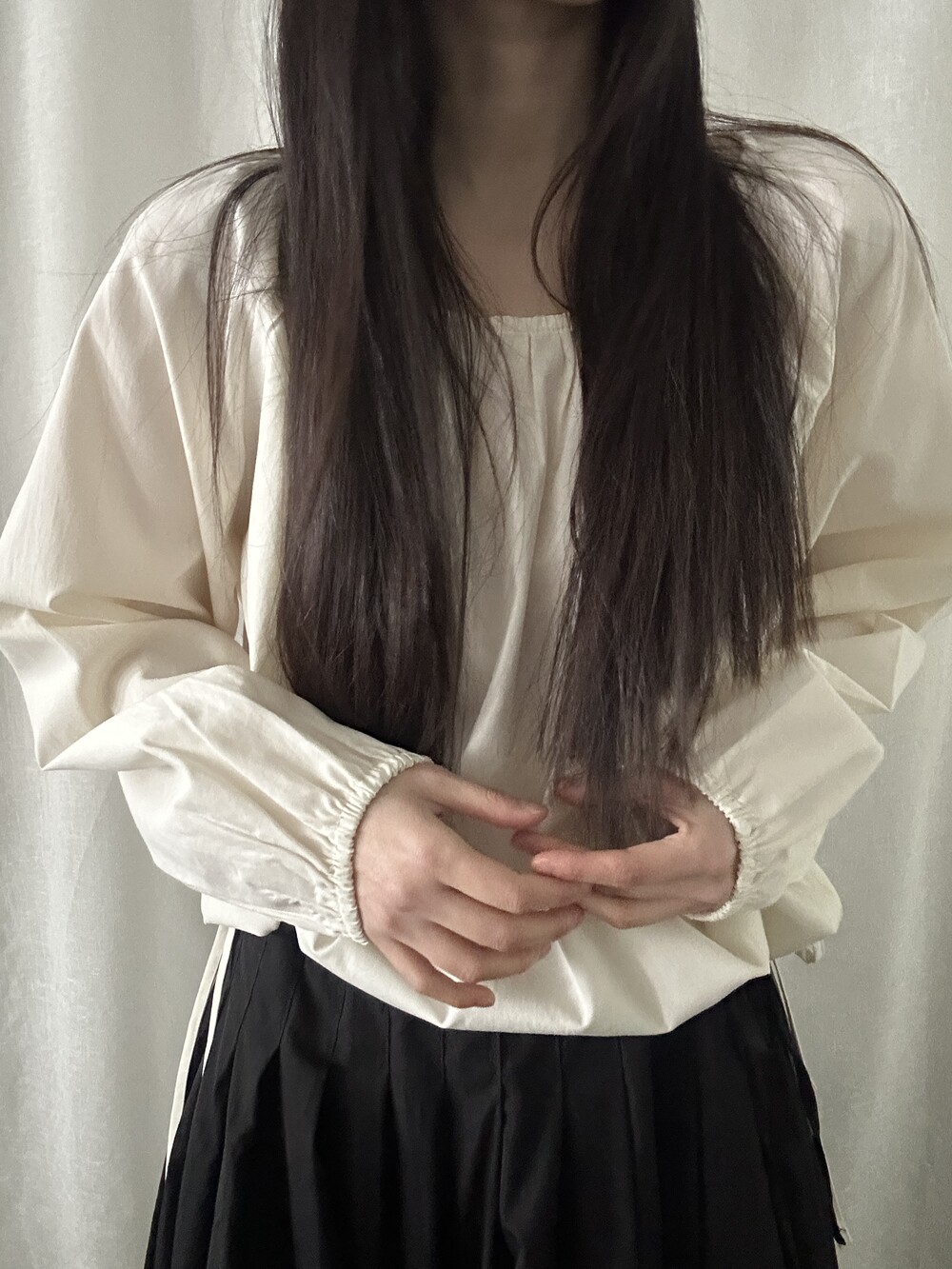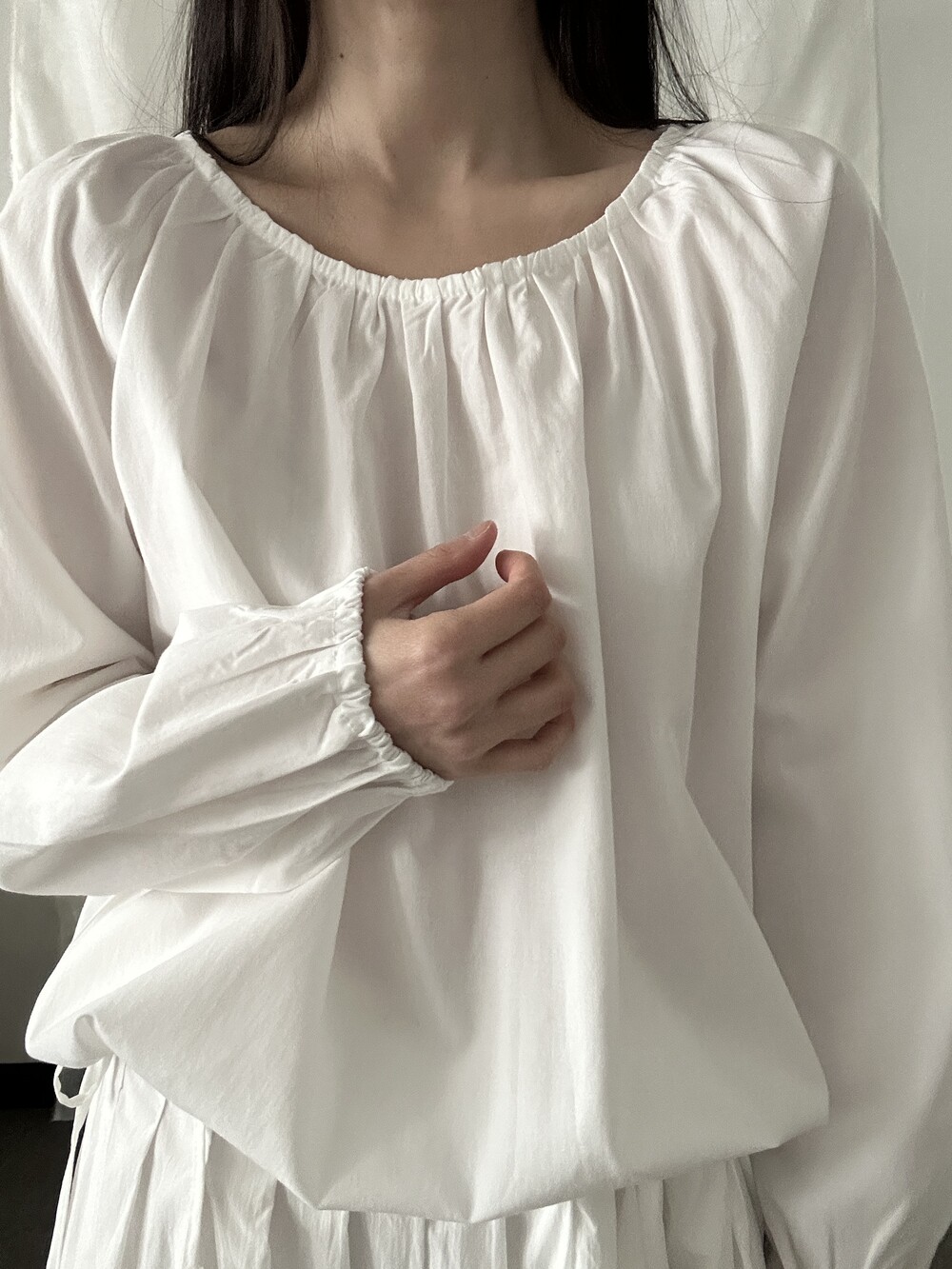 소매 끝단은 밴딩으로 처리해 소매를 걷어 올리고 내리기 편안함은 물론 자연스럽게 잡힌 셔링은 넥라인 셔링과 조화롭게 이루어져 페미닌한 무드를 극대화 해줍니다.